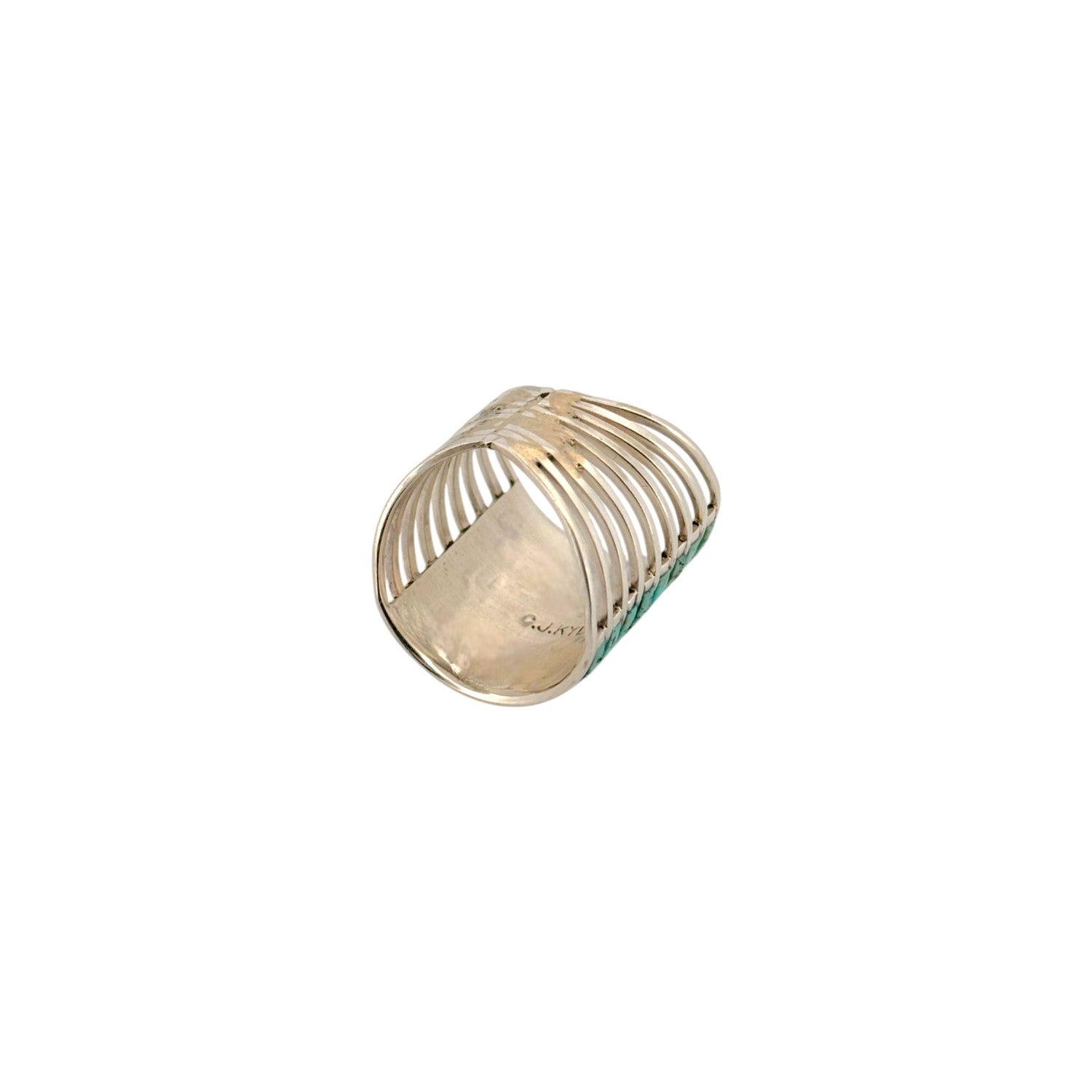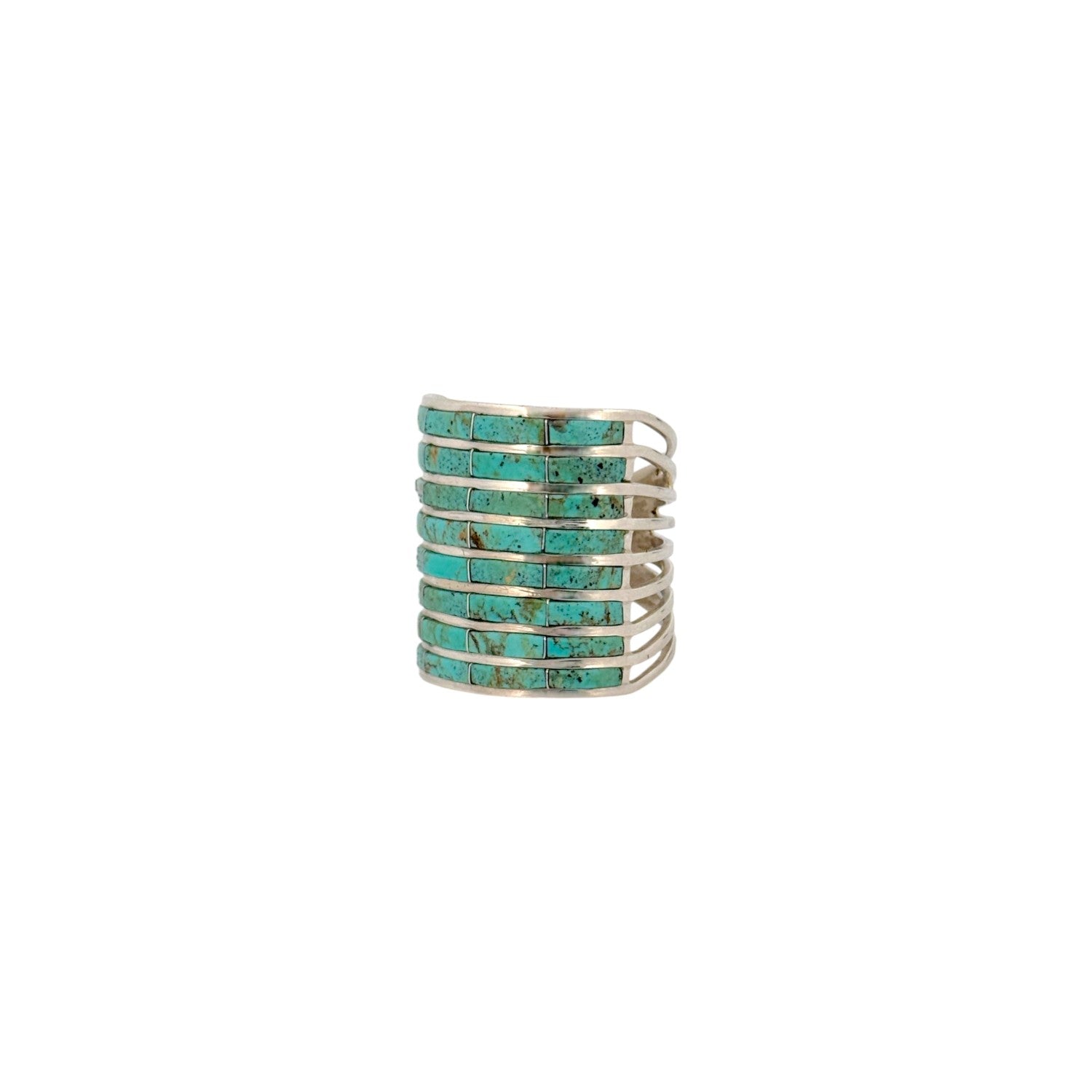 This vintage Zuni handmade ring by C.J. Kyle features a bold inlay of Kingman turquoise set in sterling silver. The design showcases multiple rows of carefully cut turquoise stones, arranged in a precise channel inlay pattern. Each stone displays classic Kingman coloration with vibrant blue tones and natural matrix, adding depth and character to the piece. The wide sterling silver band provides a substantial presence while highlighting the clean geometry of the inlay work. Expertly crafted, this ring reflects C.J. Kyle’s skill and the refined tradition of Zuni inlay jewelry.