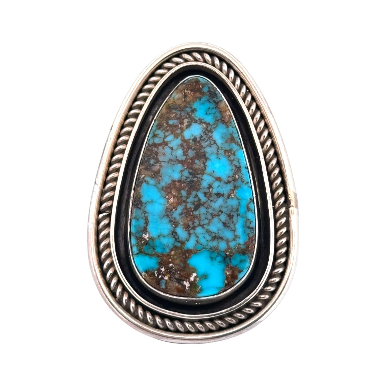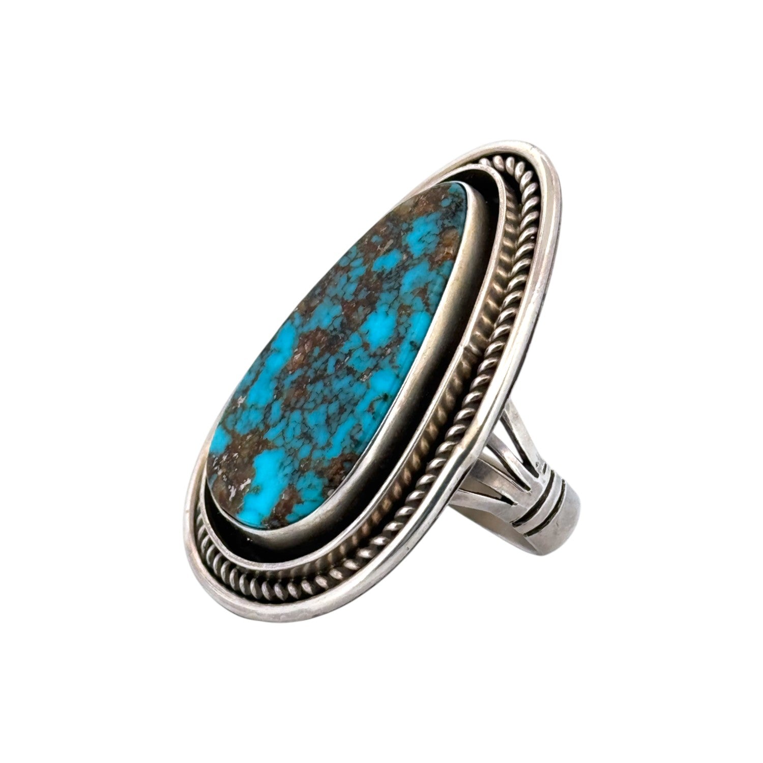 This Navajo handmade ring by Roger A. Lewis features a remarkable Turquoise Mountain stone, celebrated for its vivid sky-blue tones and intricate golden-brown matrix. The teardrop-shaped stone is expertly set in a smooth bezel and framed with classic sterling silver rope and shadowbox detailing, adding dimension and elegance to the piece. Lewis’s masterful silverwork provides a bold yet refined setting that enhances the natural beauty of the turquoise. Known for his clean lines and traditional craftsmanship, Roger A. Lewis continues the Navajo silversmithing legacy with exceptional skill and authenticity. This ring makes a confident statement, blending Southwestern heritage with timeless design. Whether worn as a signature piece or part of a collection, it is both wearable art and a celebration of tradition.