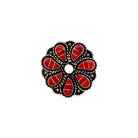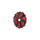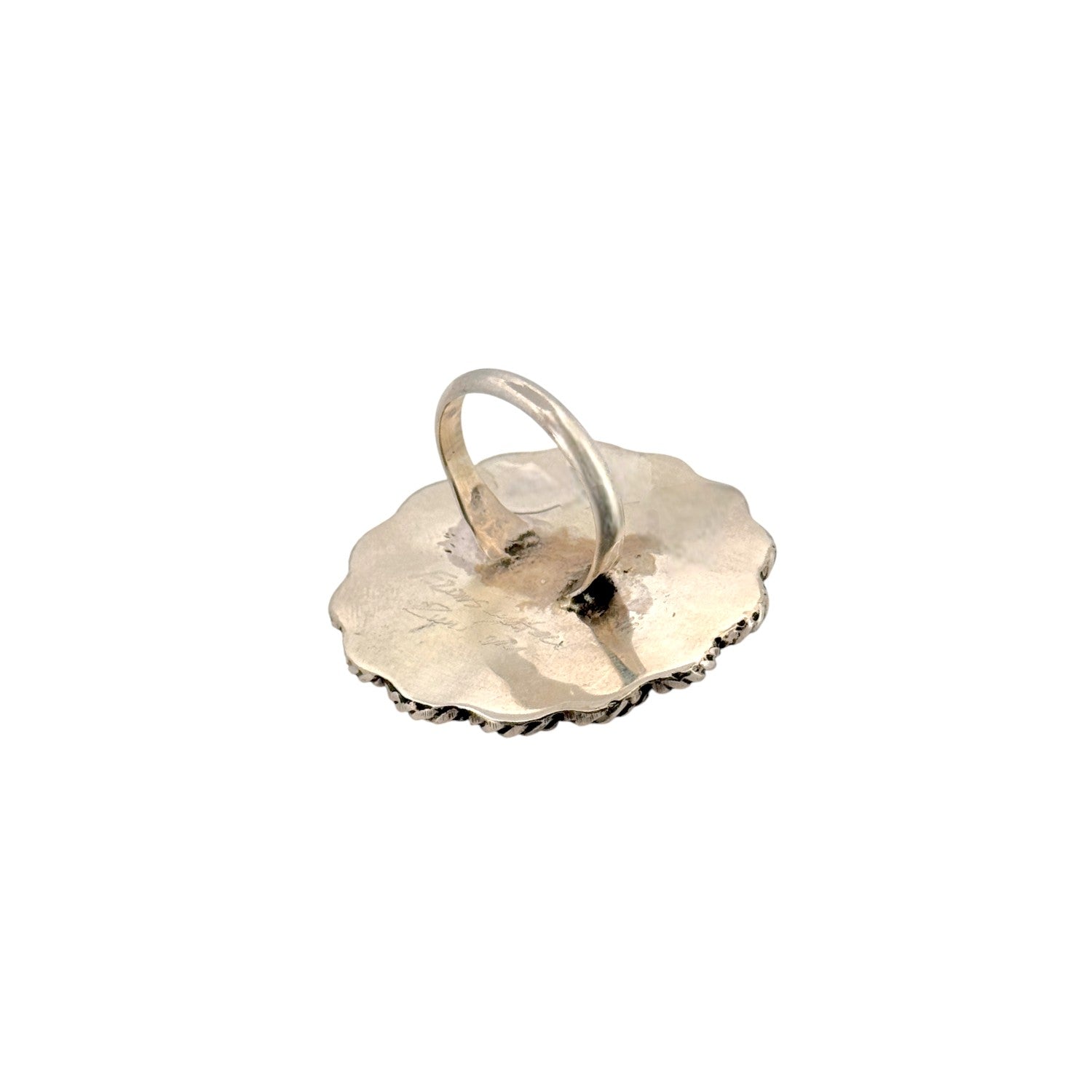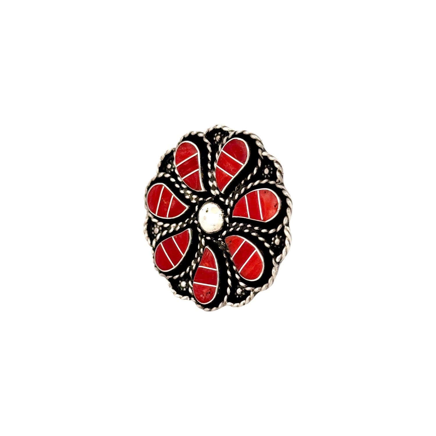 This Zuni handmade ring by Faye Lowsayatee features vibrant red coral set in finely crafted sterling silver. The floral cluster design showcases coral inlay petals accented with delicate silver line work and twisted rope details. A polished silver center adds contrast and balance to the bold red tones. The intricate inlay reflects the precision and artistry characteristic of Zuni craftsmanship. Striking yet elegant, this ring is a beautiful expression of traditional Zuni design.