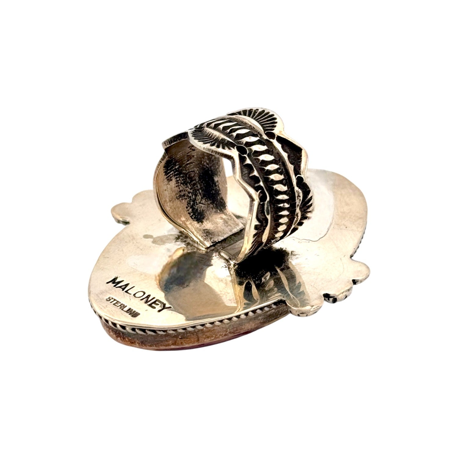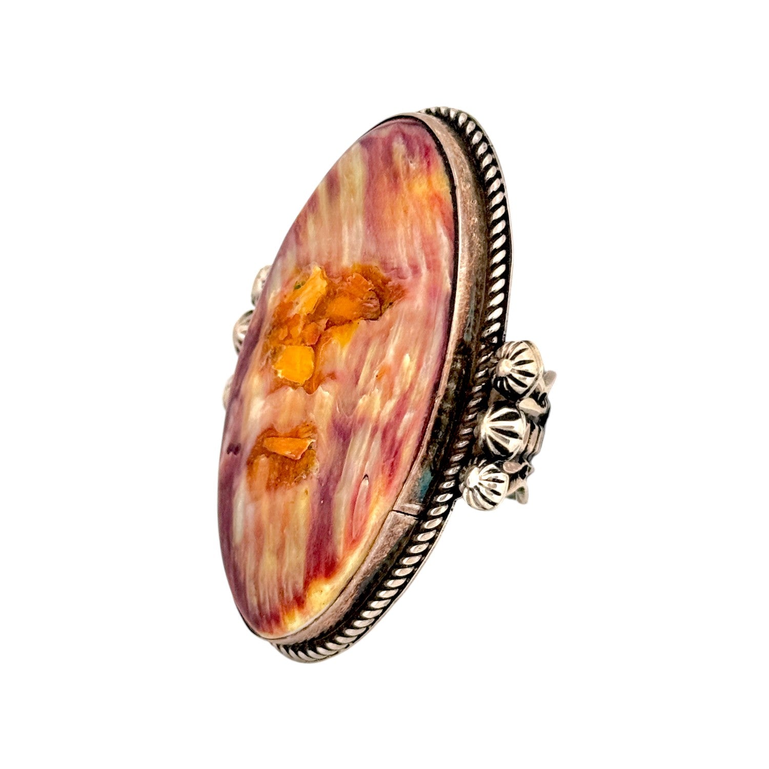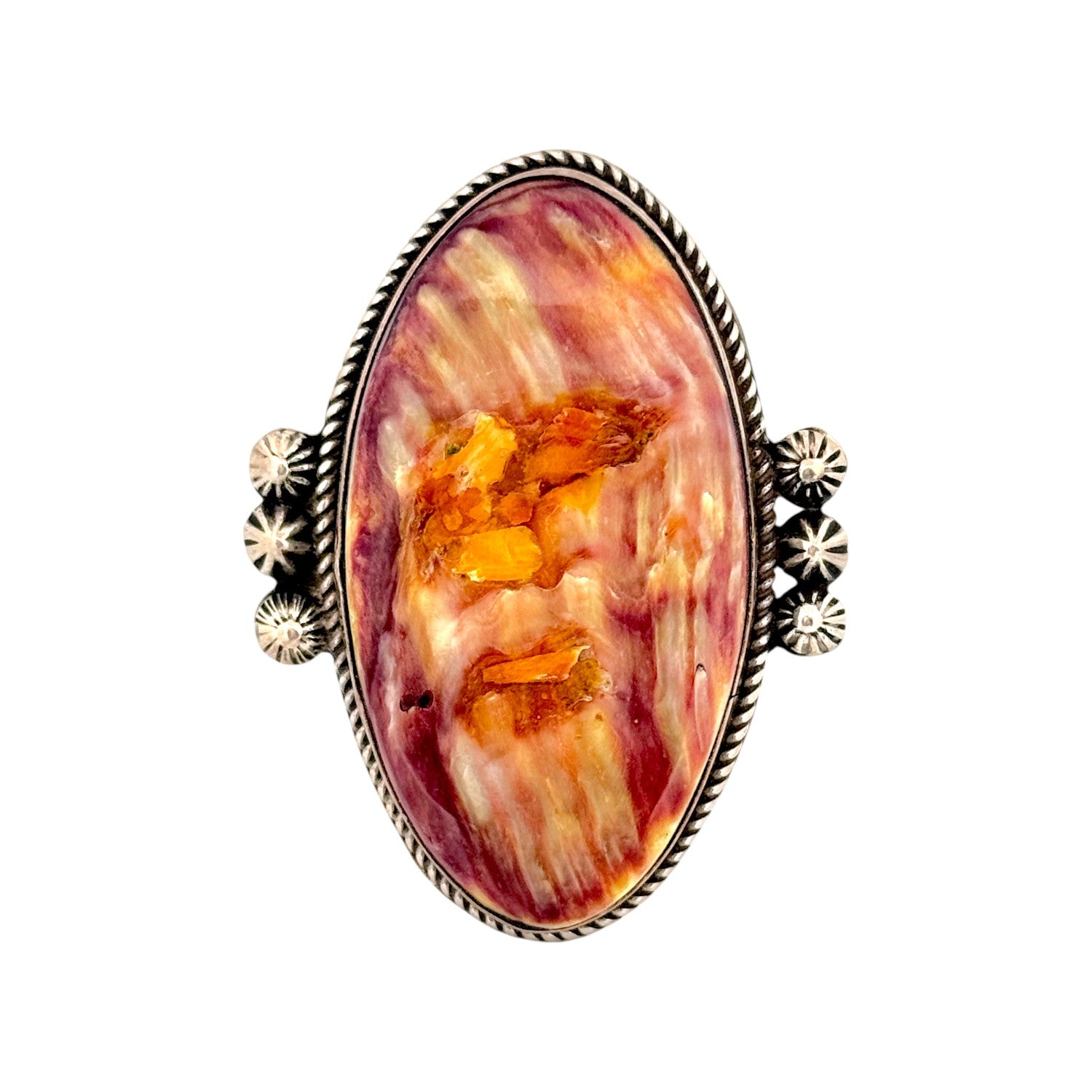 This exquisite ring by Navajo artist Freddie Maloney features a radiant purple spiny oyster shell, admired for its vibrant blend of purples, oranges, and creamy tones that mimic the colors of a desert sunset. The large oval stone is set in sterling silver, framed by a twisted rope bezel and accented with delicate hand-stamped starburst details on each side. The intricate silverwork enhances the natural striations and luster of the shell, showcasing Maloney’s mastery of Navajo silversmithing. The combination of bold color and refined craftsmanship gives this ring a timeless Southwestern elegance. Each piece is handmade, ensuring every detail reflects the artist’s care and cultural artistry.