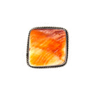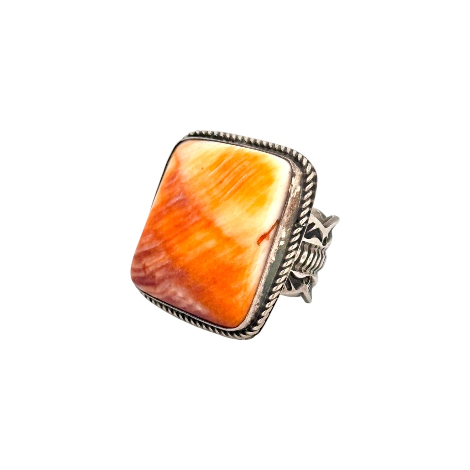 This bold Navajo ring by artist Freddie Maloney features a vibrant spiny oyster shell set in sterling silver. The stone displays a stunning range of fiery orange, golden yellow, and soft cream tones, echoing the colors of a desert sunset. Maloney’s craftsmanship highlights the natural beauty of the shell, framed in a clean silver bezel with a twisted rope border for added dimension. The large square-shaped cabochon creates a striking focal point, perfect for those who love statement jewelry. Handcrafted with traditional Navajo techniques, the ring blends timeless artistry with contemporary style. Its natural textures and radiant hues make it a truly unique piece.