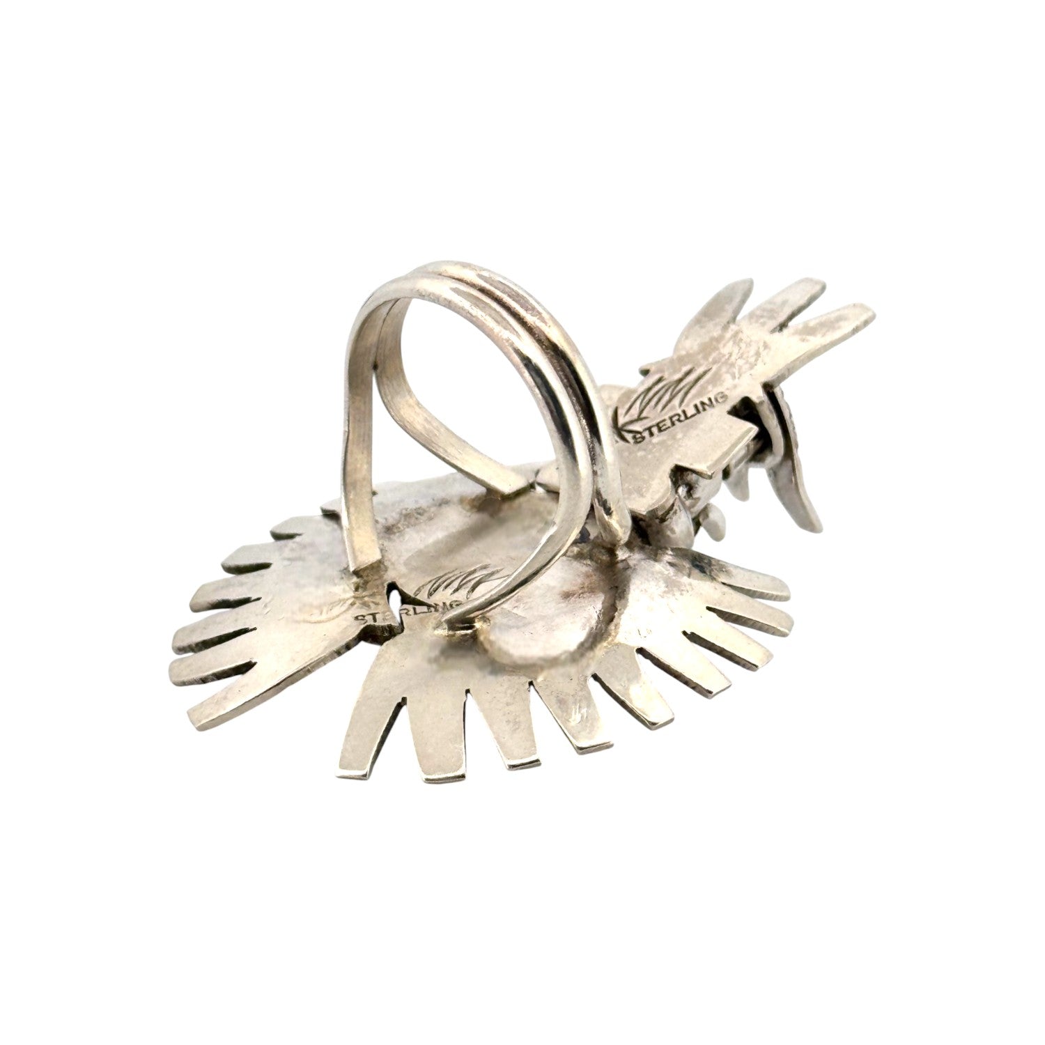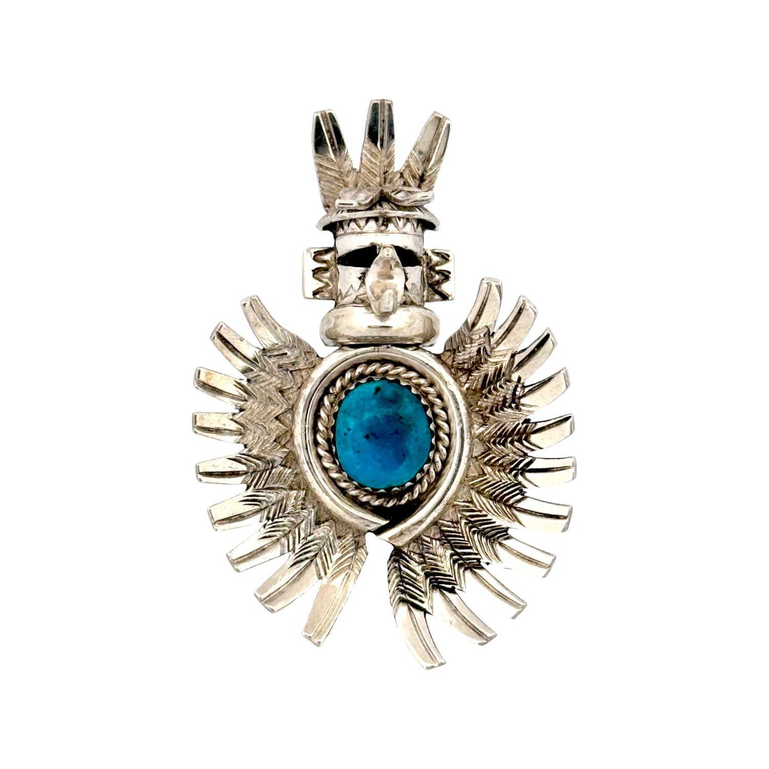 This powerful ring is a Navajo handmade creation by master silversmith Nelson Morgan. Crafted from sterling silver, it depicts a finely detailed Kachina figure, a sacred symbol in Navajo tradition representing spiritual guidance and connection to the natural world. The intricate silverwork showcases elaborate feather and headdress designs, emphasizing both craftsmanship and cultural meaning. At the center rests an oval Nevada Blue turquoise stone, its deep blue hue enhanced by natural matrix and framed with a twisted silver border. The oxidized accents bring depth to the details, highlighting the artistry of the piece. With its bold size and symbolic imagery, this ring makes a striking statement of strength, protection, and tradition. Nelson Morgan’s work is renowned for blending spiritual motifs with masterful silversmithing, and this piece is a true testament to that legacy.