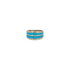 This Navajo handmade ring by Wilbert Muskett showcases a clean, modern inlay design featuring vivid Sleeping Beauty Turquoise. The stones display the prized clear sky-blue color that makes this classic Arizona turquoise so desirable. Set in sterling silver, the smooth channel inlay creates a sleek, streamlined look with precise craftsmanship. Polished silver borders frame the turquoise bands, adding subtle contrast and a refined finish. Simple, bold, and timeless, this ring is an easy everyday piece that highlights both tradition and contemporary Navajo style.