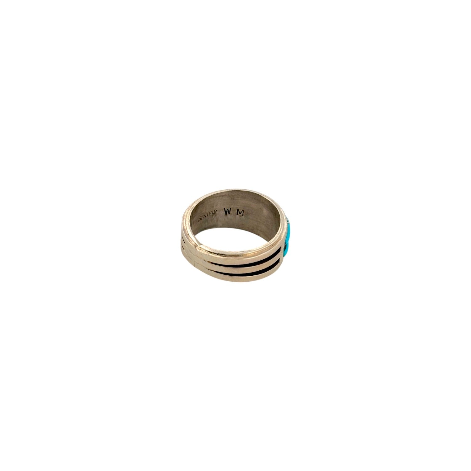 This Navajo handmade ring by Wilbert Muskett features a sleek inlay design showcasing vibrant Sleeping Beauty Turquoise. The stones display the signature clear, sky-blue color that makes this Arizona turquoise so highly prized. Set in sterling silver, the clean channel inlay work creates a smooth, modern silhouette while honoring traditional craftsmanship. Polished silver borders frame the turquoise, adding contrast and structure to the bold color. Simple yet striking, this ring is a timeless everyday piece that blends classic Navajo artistry with contemporary style.