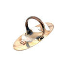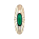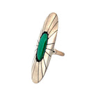 This striking ring by Navajo artist Thomas Nez features a rich green malachite stone, known for its beautiful banded patterns and natural depth. The elongated oval stone is set in sterling silver, surrounded by a radiating sunburst design that draws the eye toward the center. Each hand-carved line in the silver symbolizes light and energy, creating a powerful visual balance between stone and metal. Thomas Nez’s craftsmanship reflects the strength of traditional Navajo silversmithing blended with contemporary elegance. The malachite’s vibrant hues contrast beautifully with the silver’s smooth satin finish, giving the ring a refined yet earthy character.