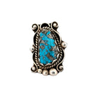 This exquisite handmade ring by Navajo artist Mildred Parkhurst features a striking piece of natural Persian turquoise, celebrated for its vivid sky-blue hues and intricate matrix. Set in a bold sterling silver frame, the stone is encircled by a beautifully hand-twisted rope border and accented with silver raindrops and elegant scrollwork. The ornate silverwork is a hallmark of traditional Navajo craftsmanship, blending elegance with rustic charm. The organic shape of the turquoise adds a unique, one-of-a-kind character to the piece.