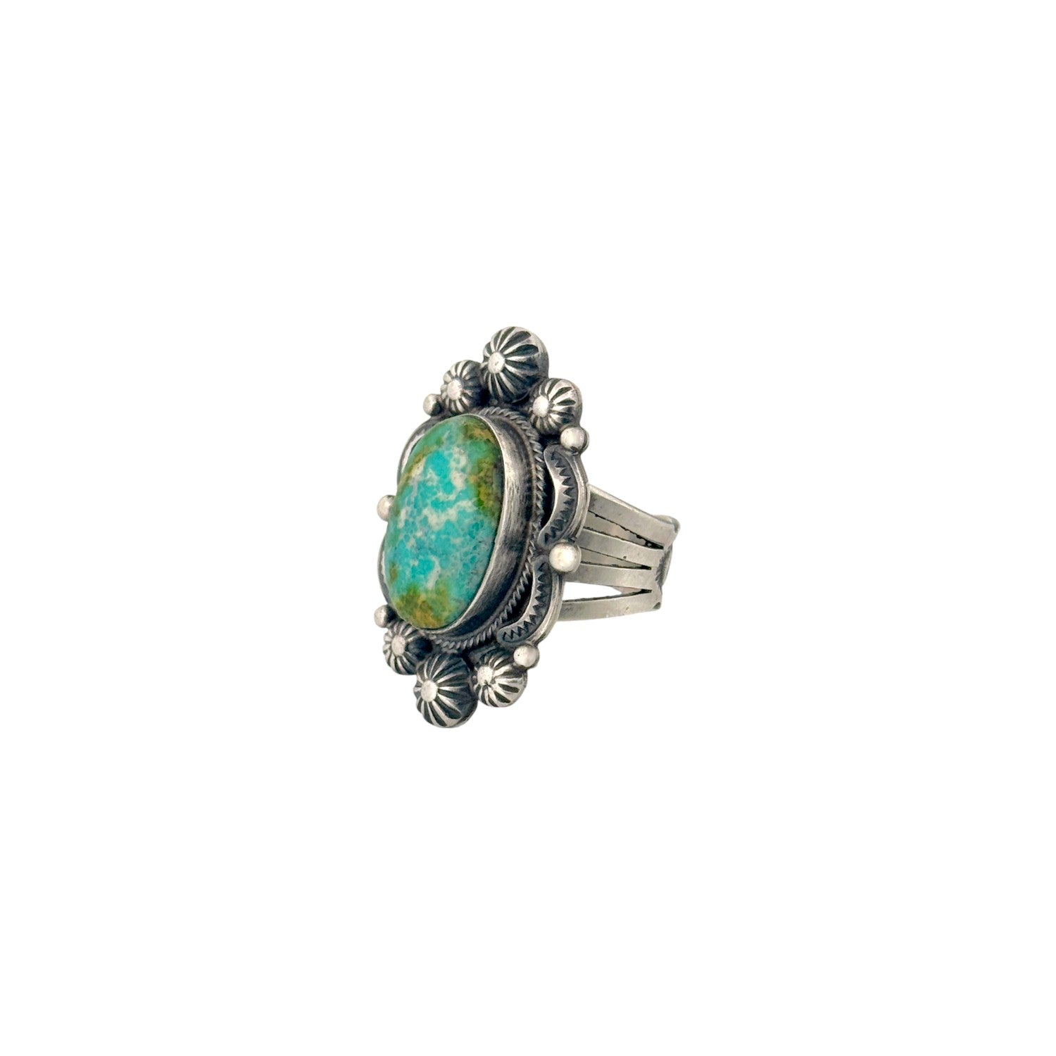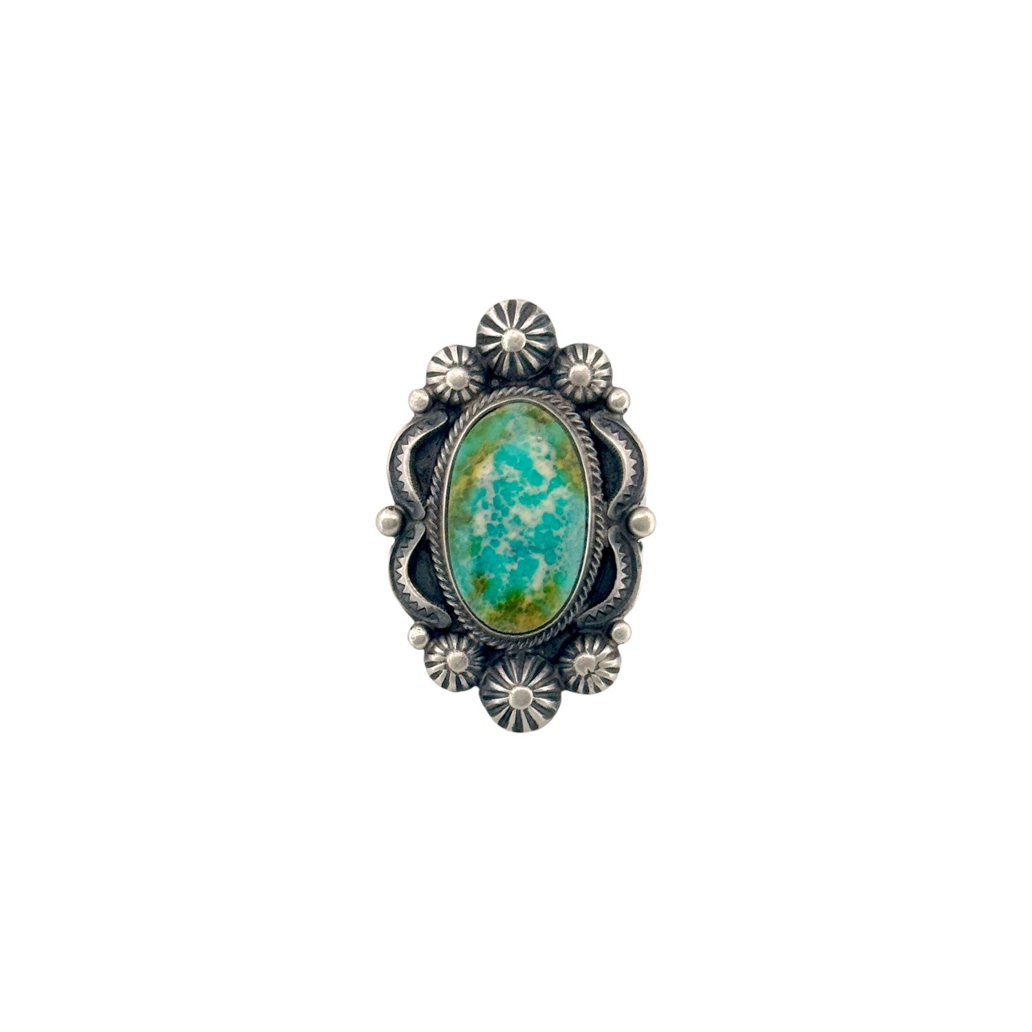 This handmade Navajo ring by Benny Ramone features a stunning Sonoran turquoise stone set in sterling silver. The oval stone displays beautiful shades of blue and green with natural earthy matrix, making each angle unique and full of character. A twisted rope bezel surrounds the turquoise, while stamped silver conchos and bead accents add depth and traditional Southwestern detail. The oxidized background enhances the contrast, allowing the vibrant stone and bright silverwork to stand out. Bold yet elegant, this ring is a striking example of classic Navajo silversmith artistry and timeless design.