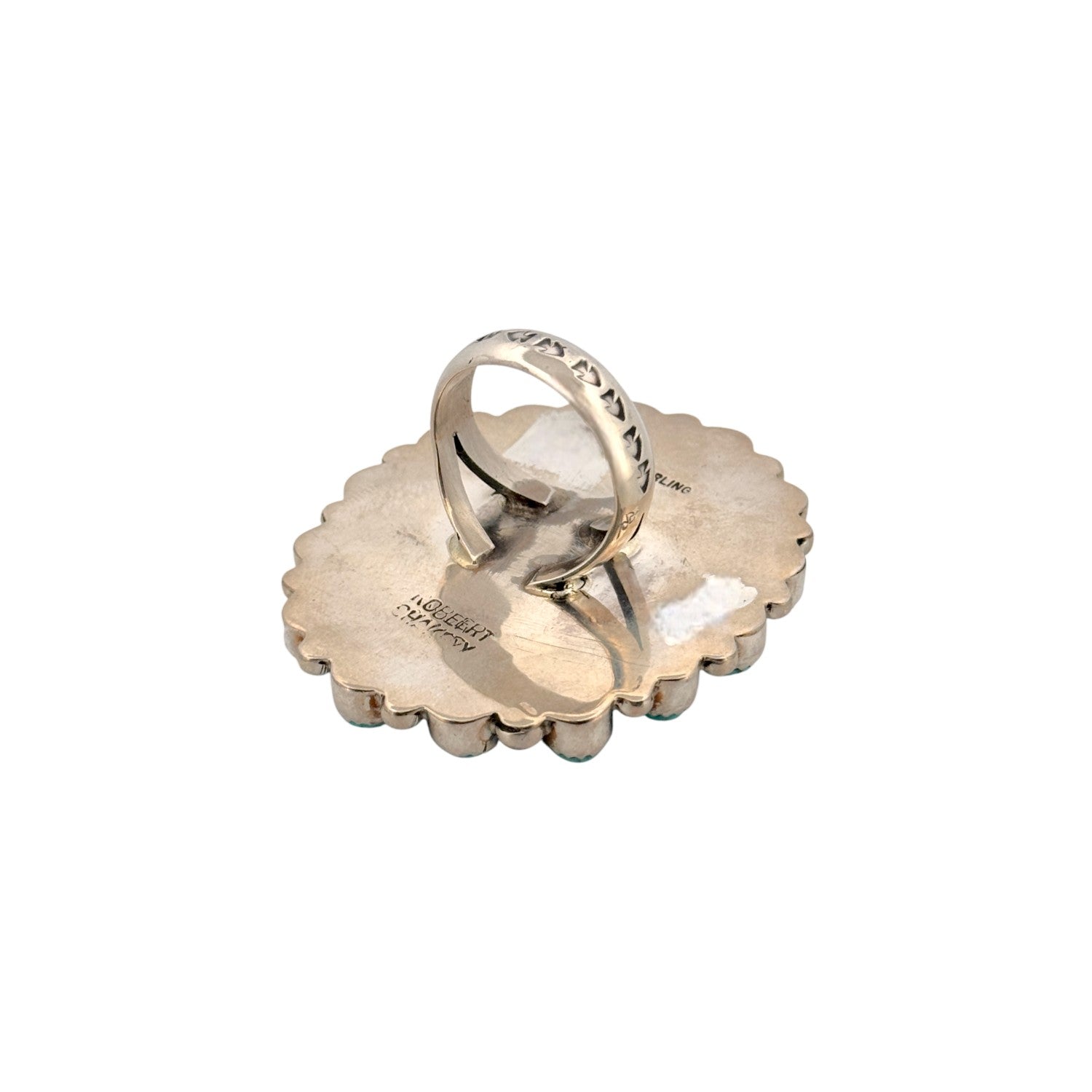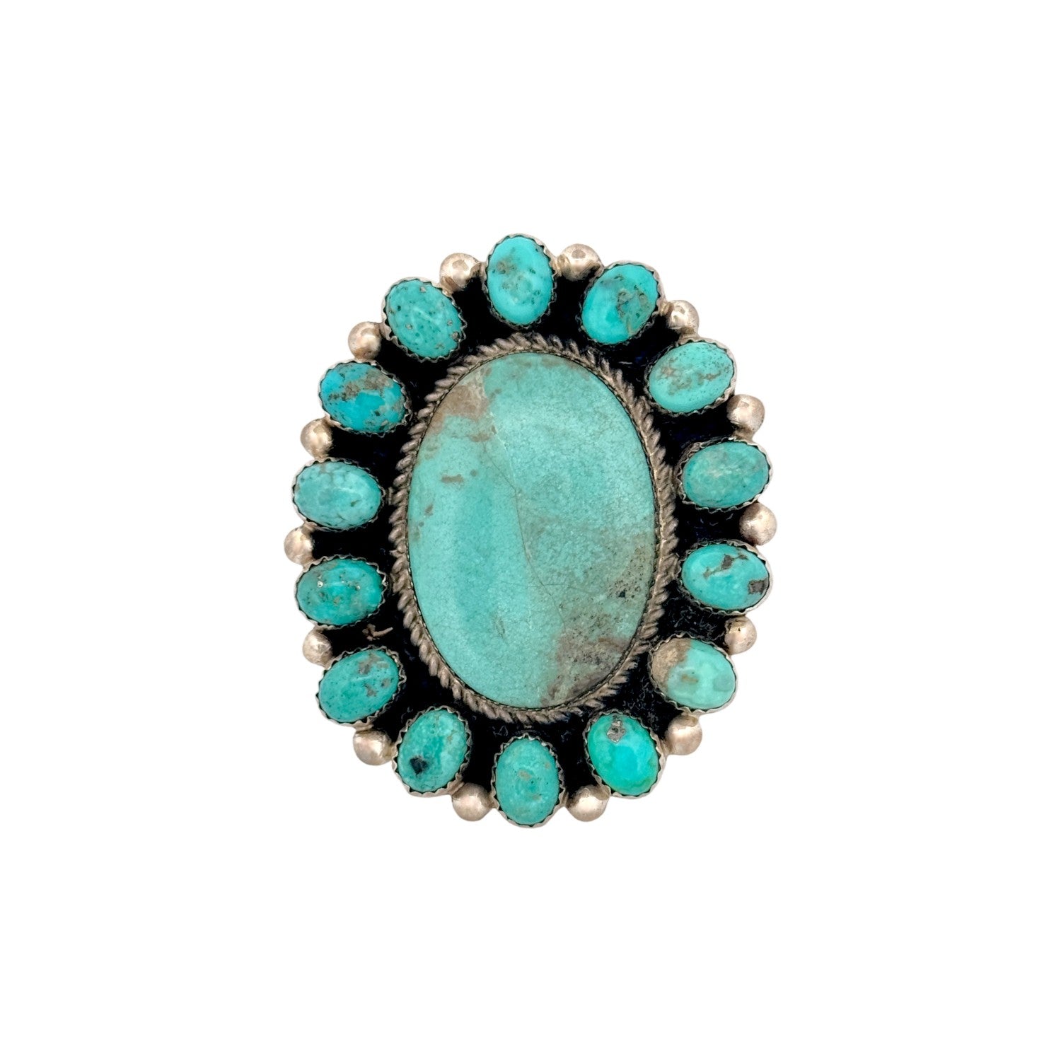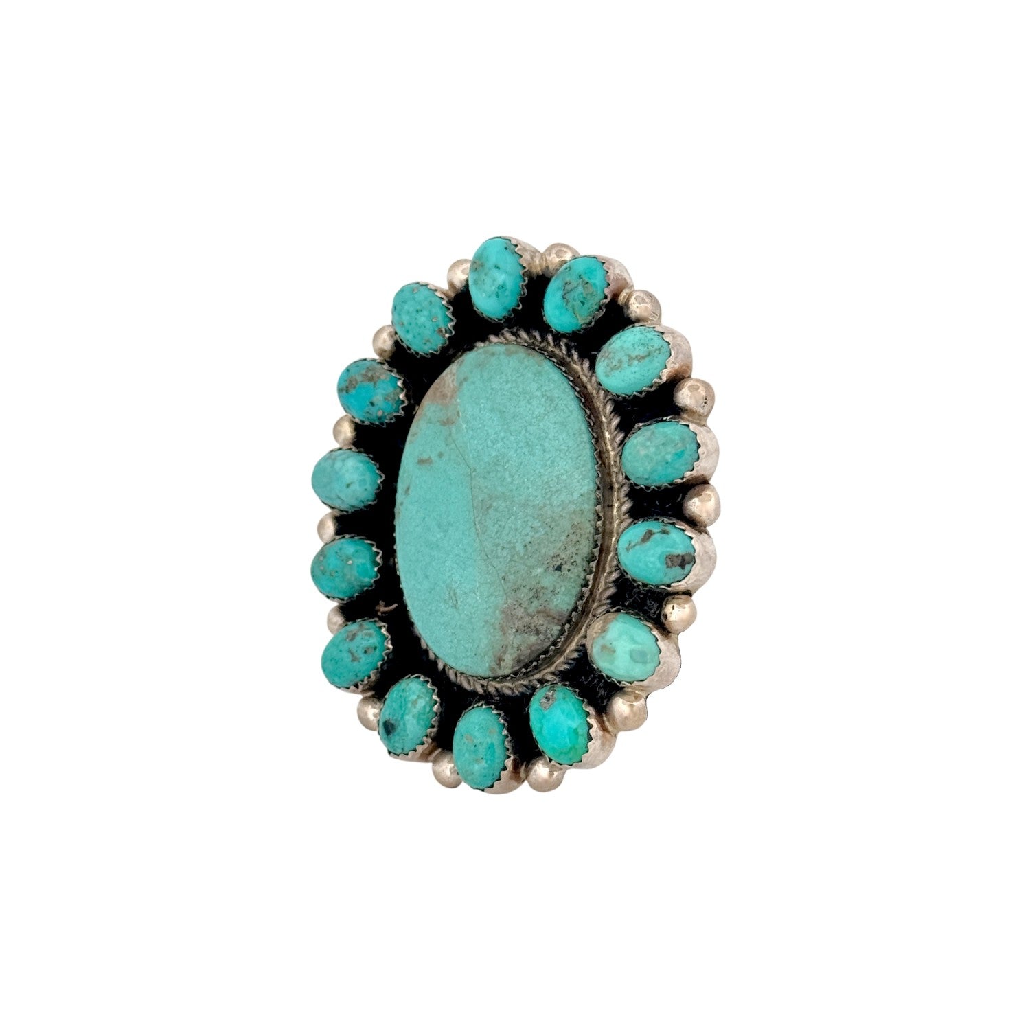 This Navajo handmade ring by Robert Shakey features a beautiful Kingman turquoise centerpiece surrounded by hand-set accent stones. Crafted in solid sterling silver, the classic cluster design highlights soft blue-green hues and natural matrix throughout the turquoise. The layered silverwork and traditional setting create depth while maintaining a balanced, wearable profile. Each detail reflects Shakey’s skilled craftsmanship and respect for traditional Navajo jewelry styles. A timeless and collectible ring, it’s perfect for those who appreciate authentic Native American turquoise and silver artistry.