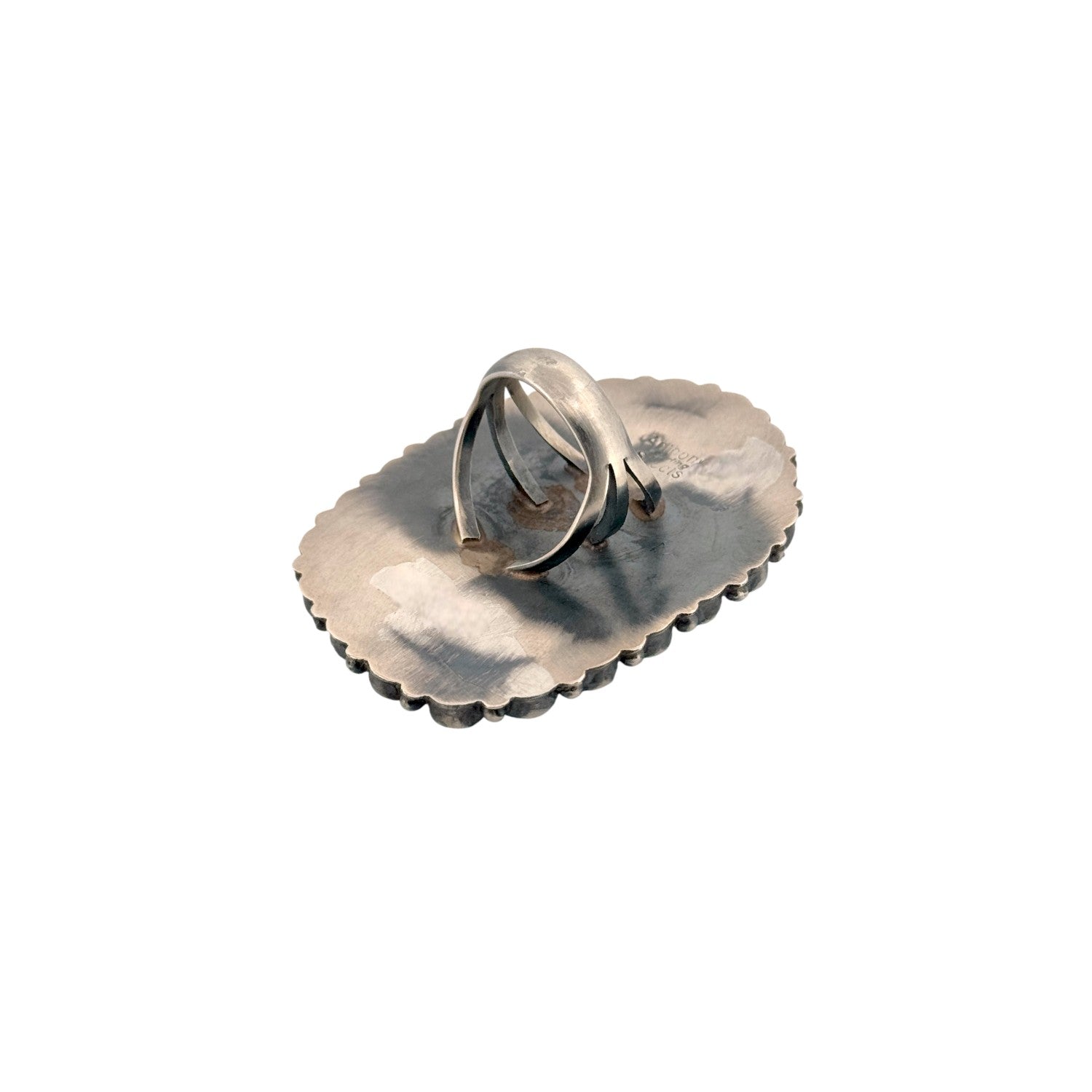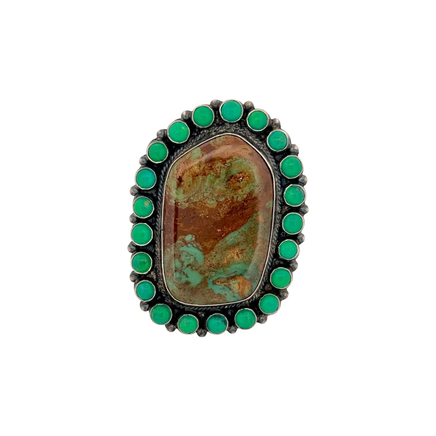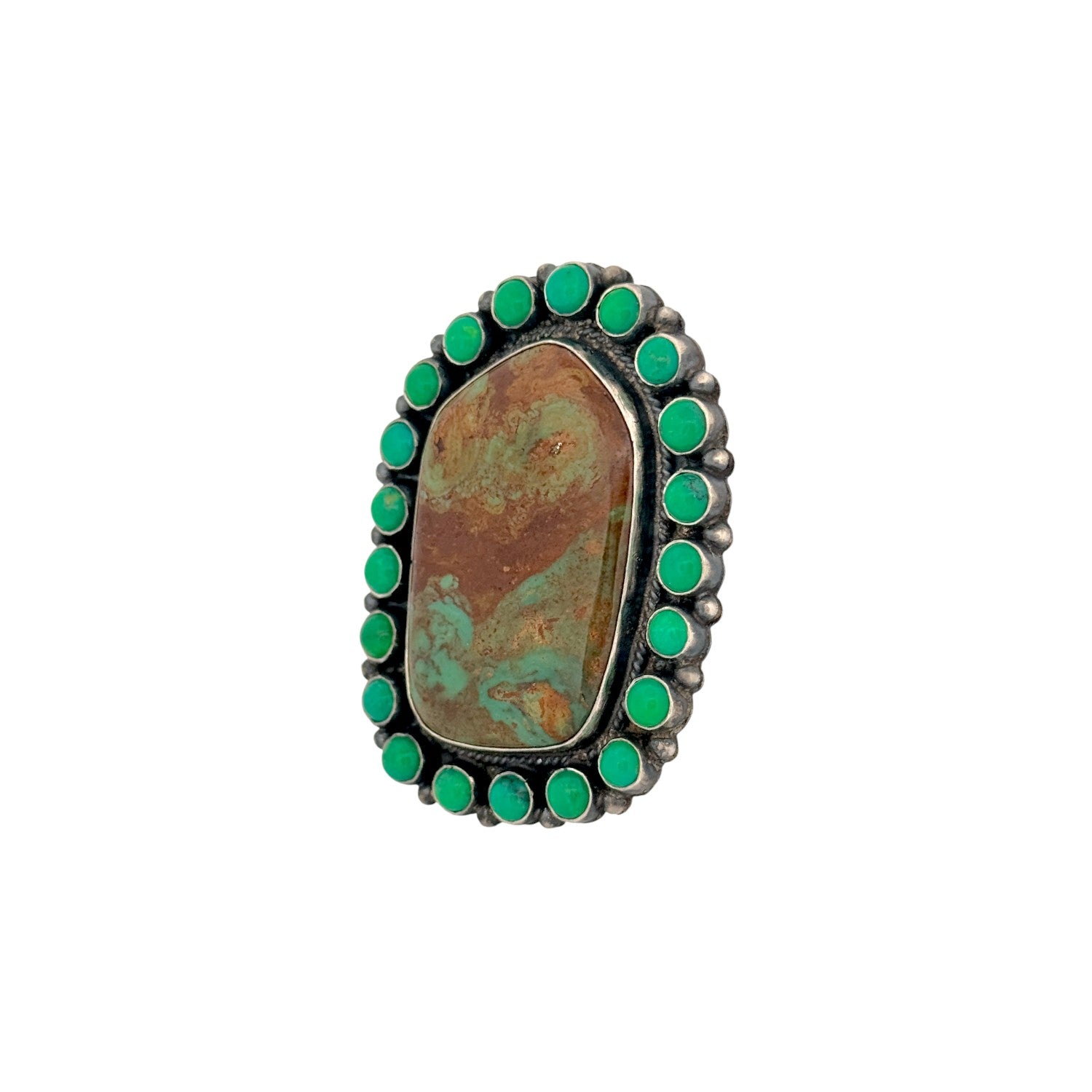 This distinctive handmade ring by Anthony Skeets features a striking combination of Royston Turquoise and variscite set in sterling silver. The large central stone displays earthy brown tones blended with soft green hues, creating a natural landscape-like pattern full of depth and character. Surrounding it, a halo of vivid green variscite stones adds bright contrast and a balanced, eye-catching frame. Darkened silver detailing enhances the stones’ colors while highlighting the traditional Navajo craftsmanship in the setting and beadwork. Bold yet refined, this ring is a beautiful example of Southwestern artistry inspired by the natural beauty of the land.