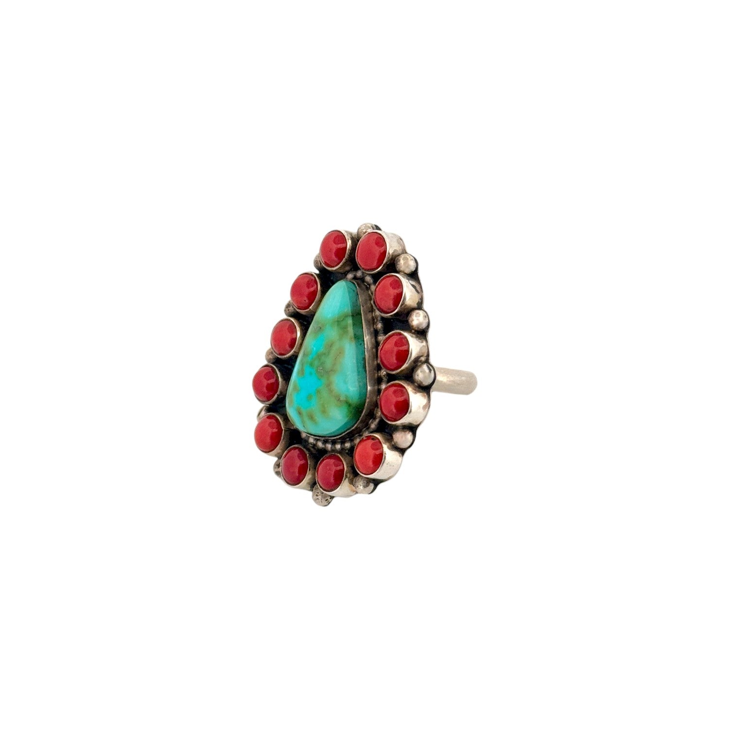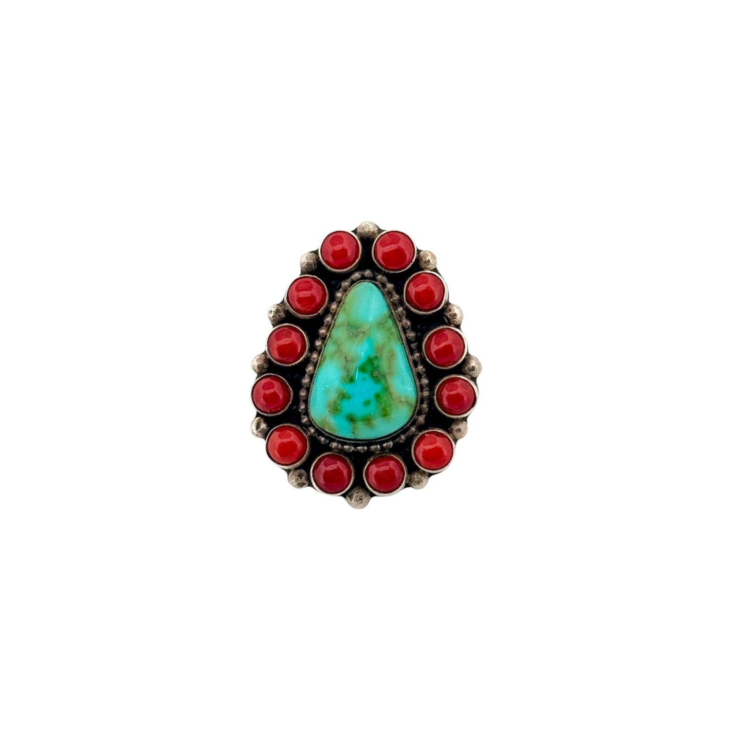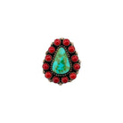 This handmade Navajo ring by Scott Skeets features a striking Sonoran turquoise stone surrounded by a vibrant coral cluster. The center turquoise displays beautiful blue-green tones with natural matrix, creating a lively focal point full of character. A halo of round red coral stones frames the turquoise, offering bold contrast and classic Southwestern color pairing. Sterling silver bead accents and a darkened background add depth and highlight the craftsmanship of the design. Eye-catching and timeless, this ring is a beautiful blend of traditional Navajo cluster style and rich natural stones.