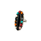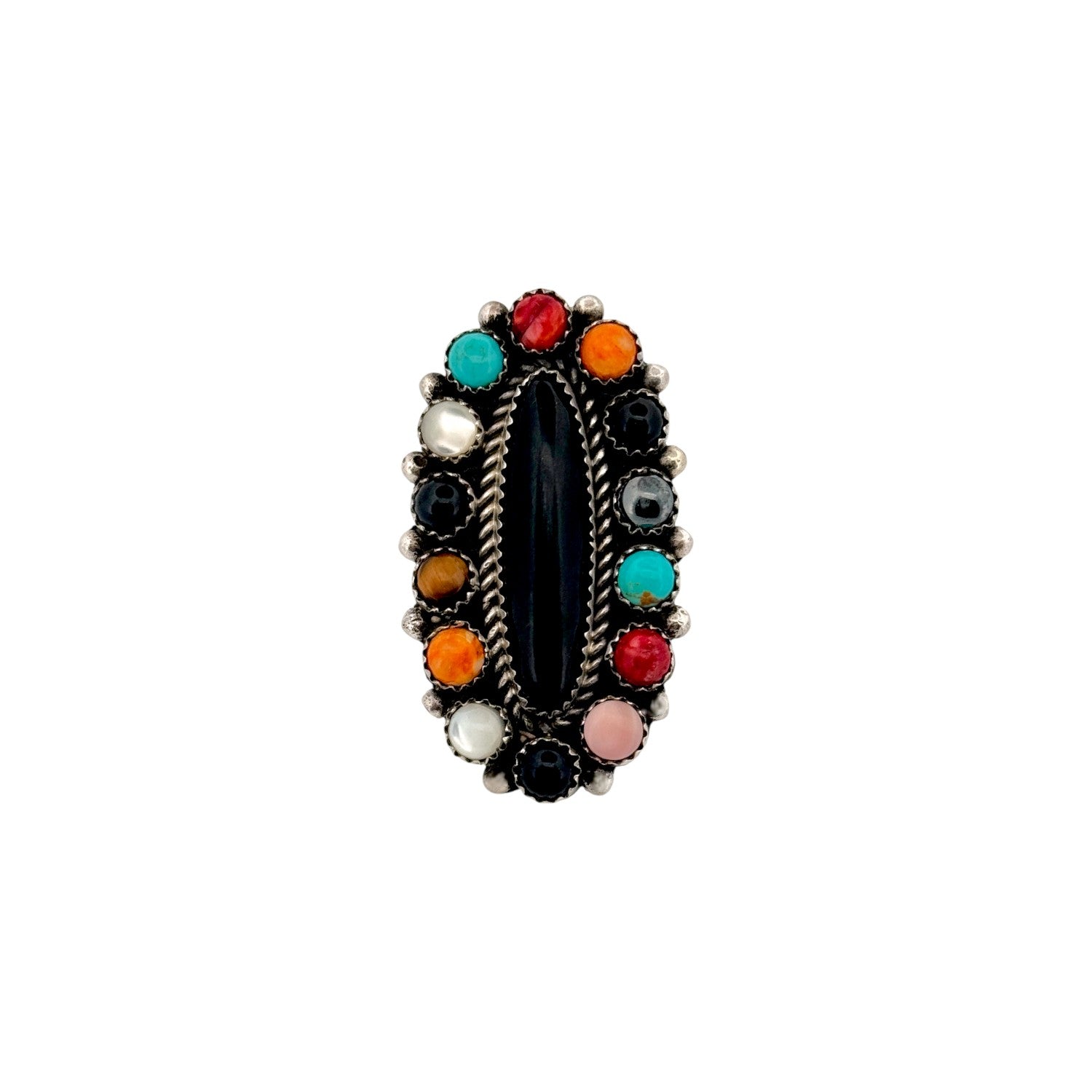 This Navajo handmade ring by Leonard Spencer showcases a bold vertical black onyx centerpiece surrounded by a vibrant multi-stone cluster. Kingman Turquoise, red and orange spiny oyster shell, tiger’s eye, hematite, mother of pearl, and pink shell create a rich mosaic of color and texture. Each stone is individually set in sterling silver with detailed bezels and silver drops that add depth and dimension. Twisted rope accents frame the central onyx, emphasizing the strong, elongated silhouette of the design. Striking, colorful, and expertly crafted, this ring is a dynamic statement piece that highlights the diversity and beauty of traditional Navajo stonework.