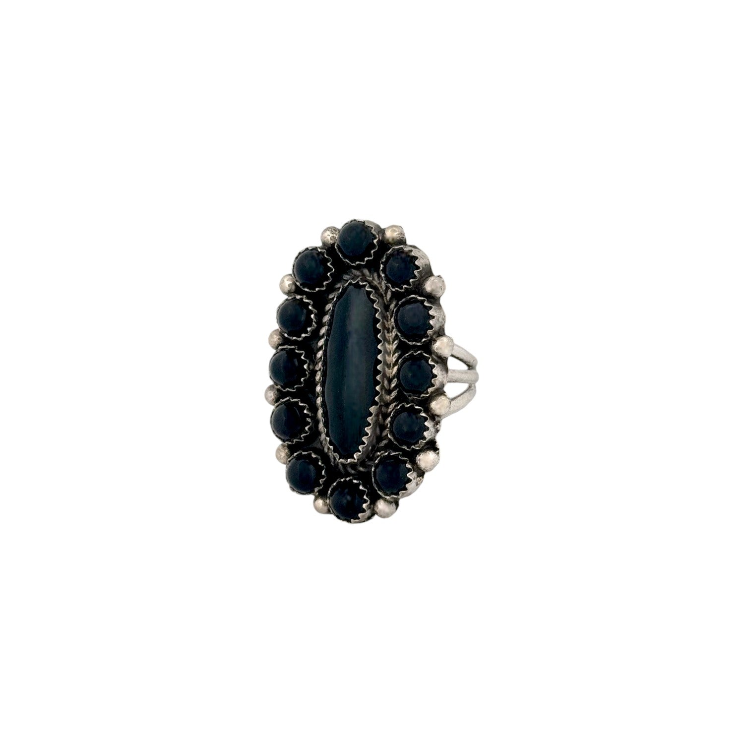 This striking handmade ring by Ella Spencer features bold Black Onyx stones set in sterling silver. A long, elegant central onyx cabochon anchors the design, its deep glossy surface creating a dramatic focal point. Surrounding it, a halo of smaller round onyx stones adds dimension and a classic cluster silhouette. Twisted rope detailing and silver bead accents frame the stones, showcasing traditional Navajo craftsmanship and texture. Sleek, powerful, and timeless, this ring is a beautiful statement piece with strong Southwestern character.