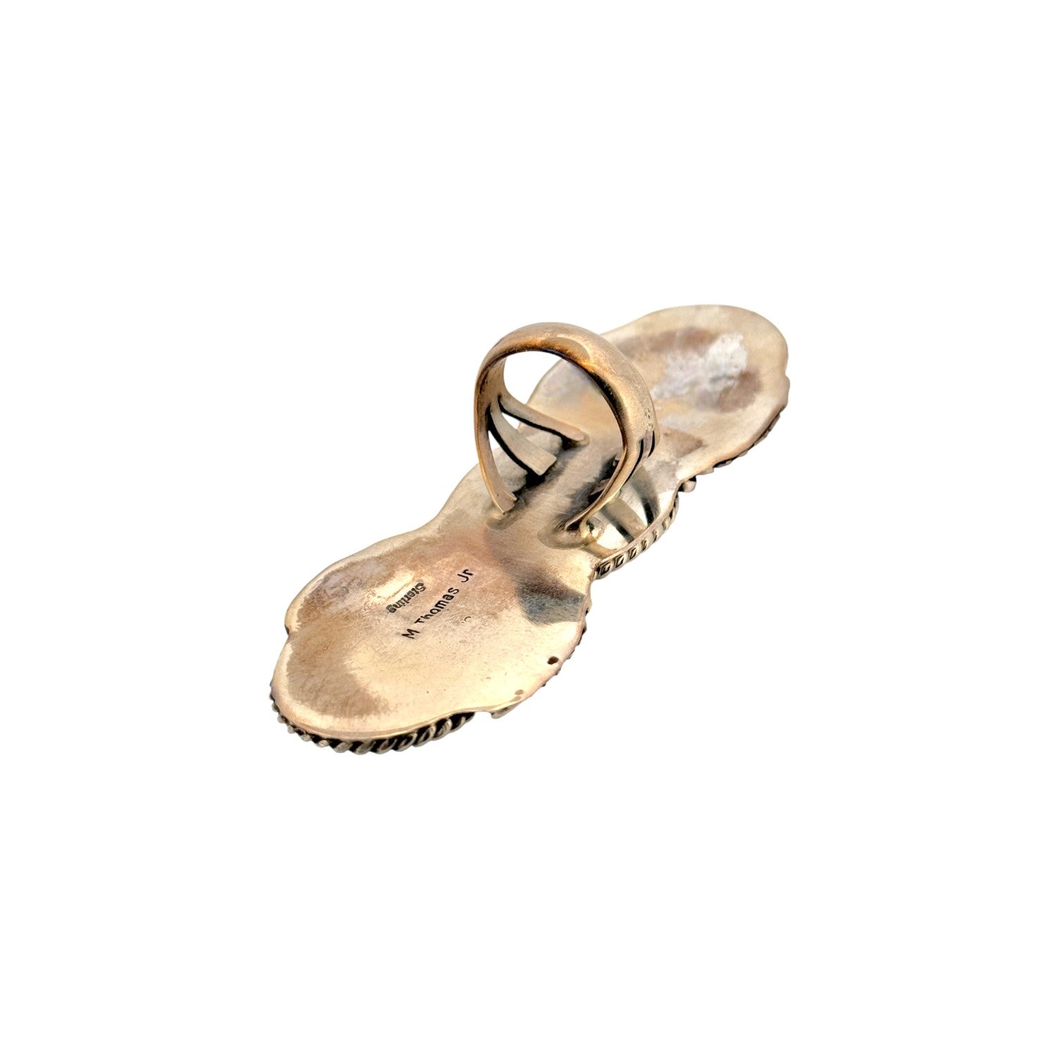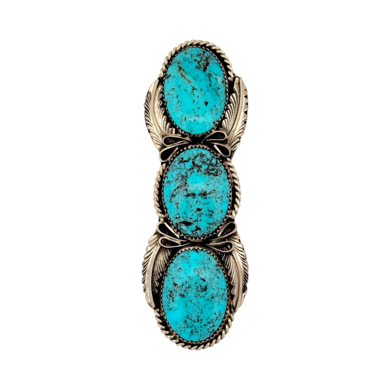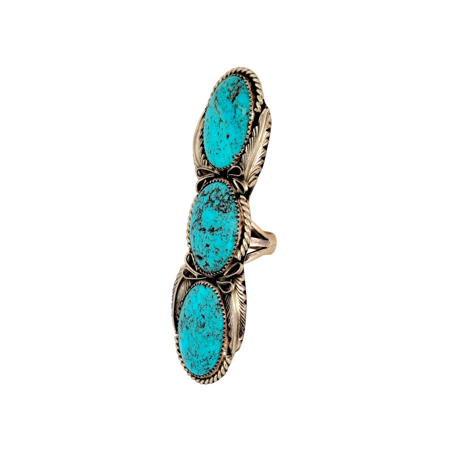 Michael Thomas Jr.’s Persian Turquoise ring showcases three striking turquoise stones, each rich with natural matrix and vibrant blue depth. Handcrafted in sterling silver, the piece features traditional Navajo design elements including twisted rope borders and finely detailed silver leaves. The vertical arrangement of the stones creates an elegant, elongated silhouette that draws the eye. Thomas Jr.’s craftsmanship highlights both precision and cultural artistry, honoring Navajo silversmithing traditions. This ring is a bold, timeless statement piece that embodies the beauty and meaning of Native jewelry.