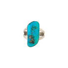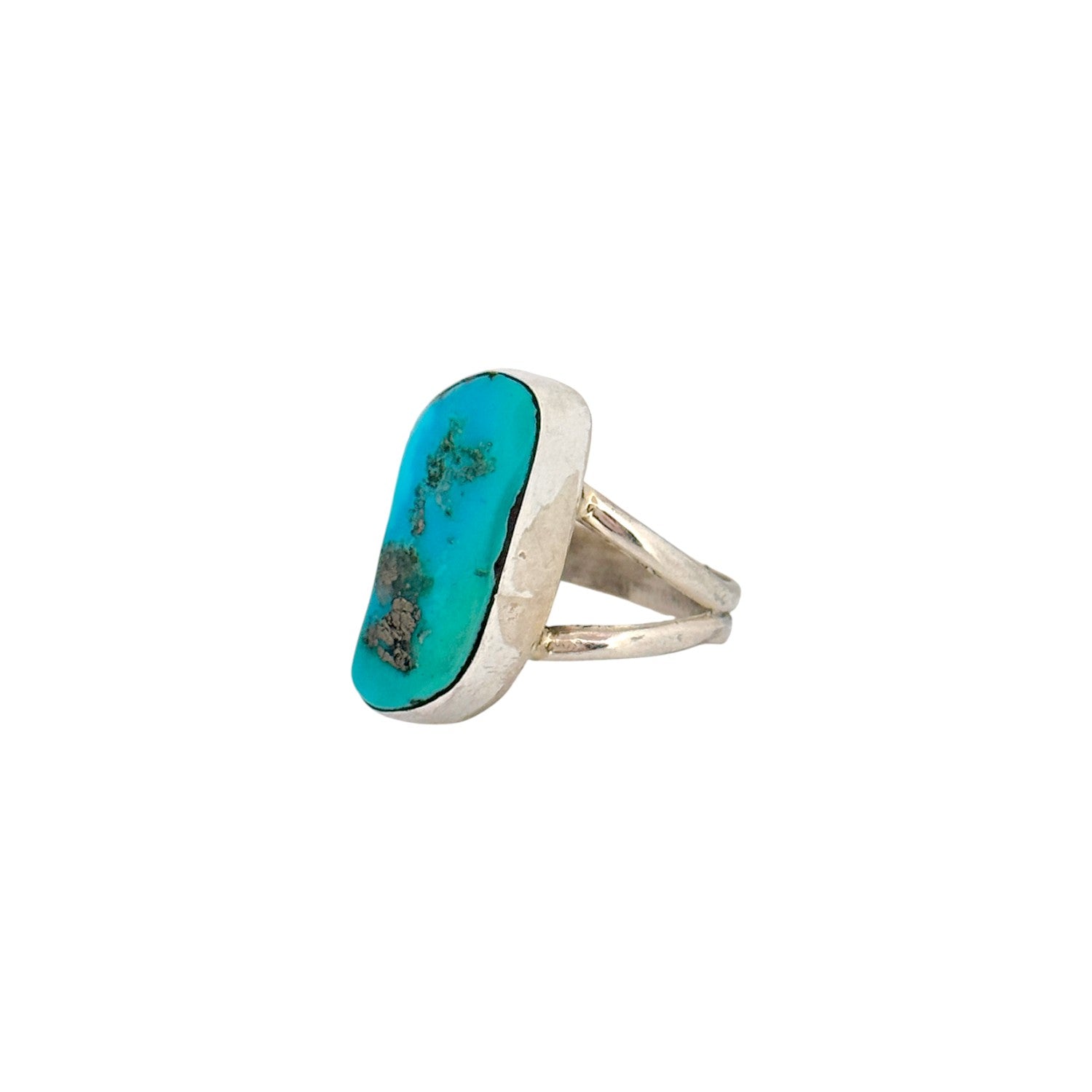 This vintage Navajo ring, crafted circa 2000s, showcases a stunning Persian Turquoise stone set in sterling silver. The freeform turquoise cabochon features vibrant shades of blue with natural golden matrix inclusions, creating a captivating organic appearance. Expertly handcrafted by a Navajo silversmith, the design highlights clean lines and a split-shank band for a balanced, contemporary feel. The minimalist silver bezel setting allows the stone’s natural beauty and color to take center stage. Each detail reflects the artisan’s precision and deep connection to traditional Navajo craftsmanship.
