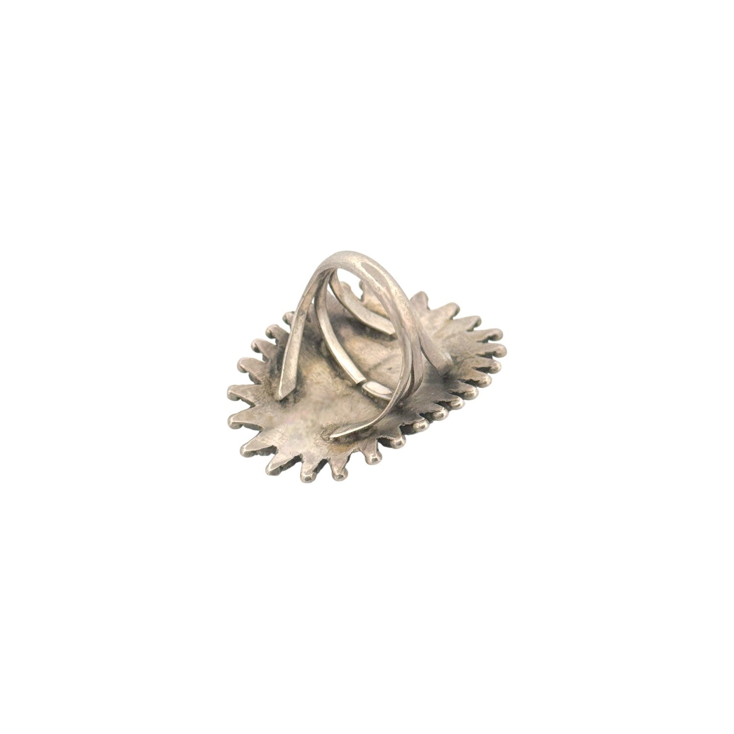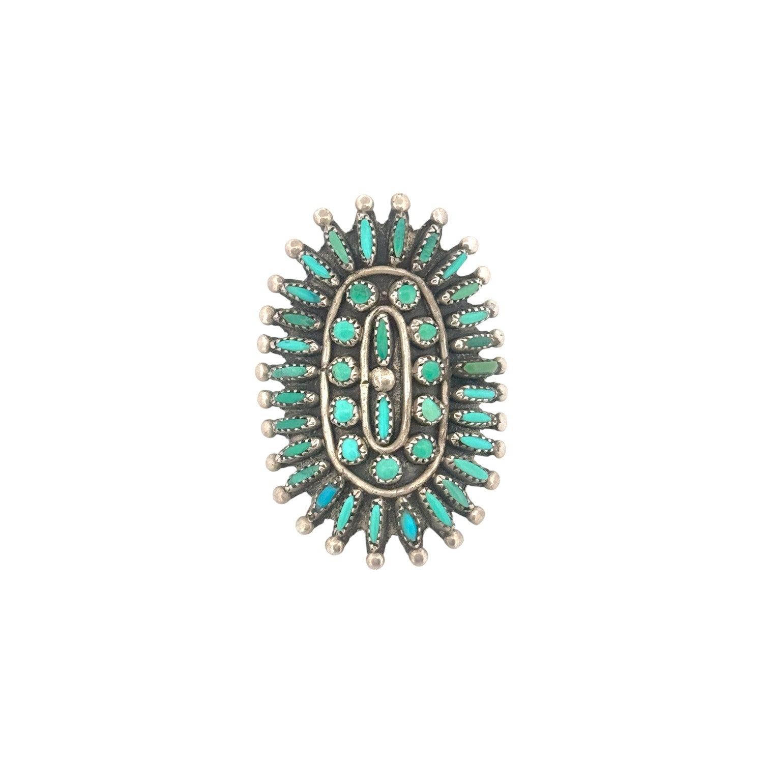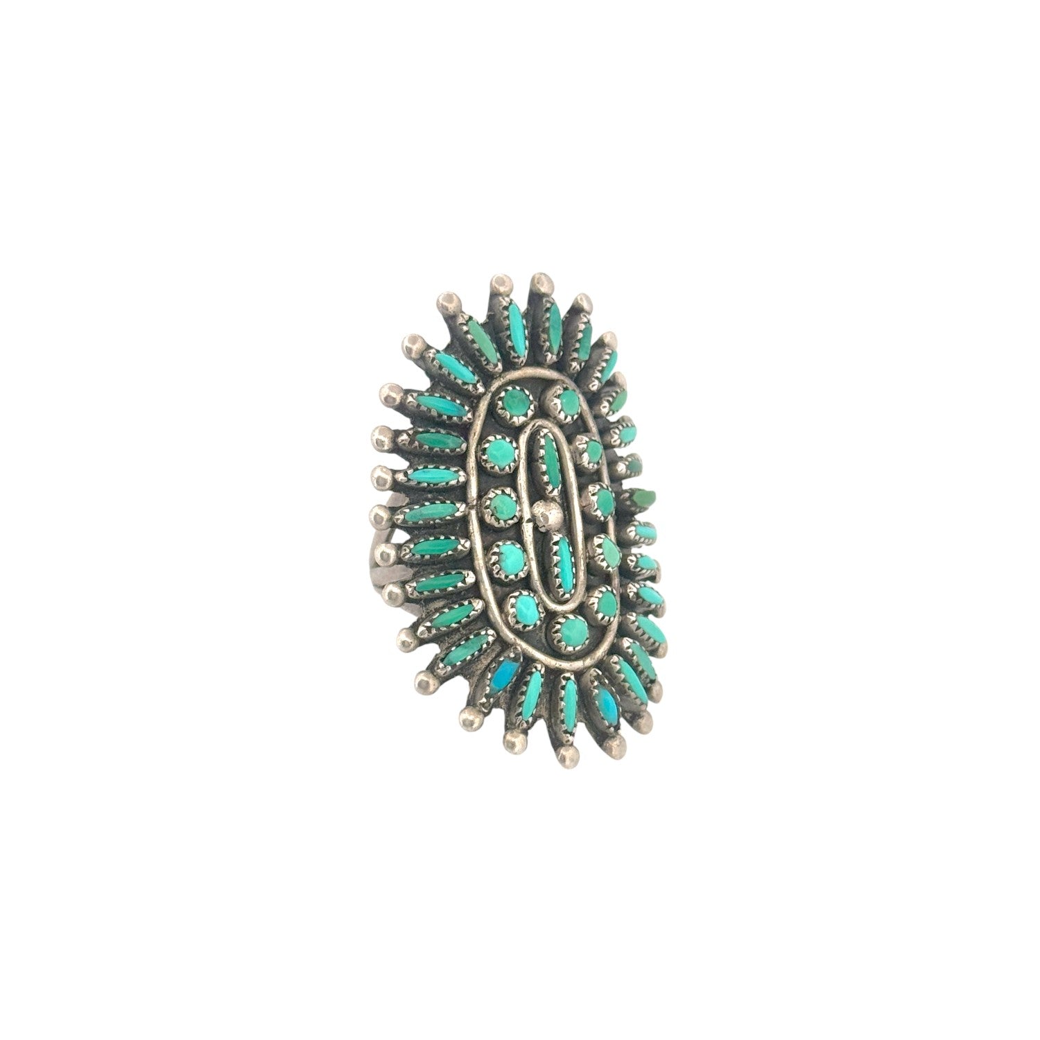 This vintage Zuni handmade ring showcases an intricate cluster design crafted with vivid Kingman turquoise stones. The elongated oval shape is filled with perfectly arranged petit point and needlepoint stones, displaying exceptional Zuni lapidary skill. Each turquoise piece is set in a fine sterling silver bezel, accented by silver drops that add depth and dimension. A softly aged patina enhances the contrast between the bright turquoise and the detailed silverwork, giving the ring authentic vintage character. Bold, ornate, and beautifully made, this piece is a striking example of traditional Zuni craftsmanship.