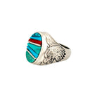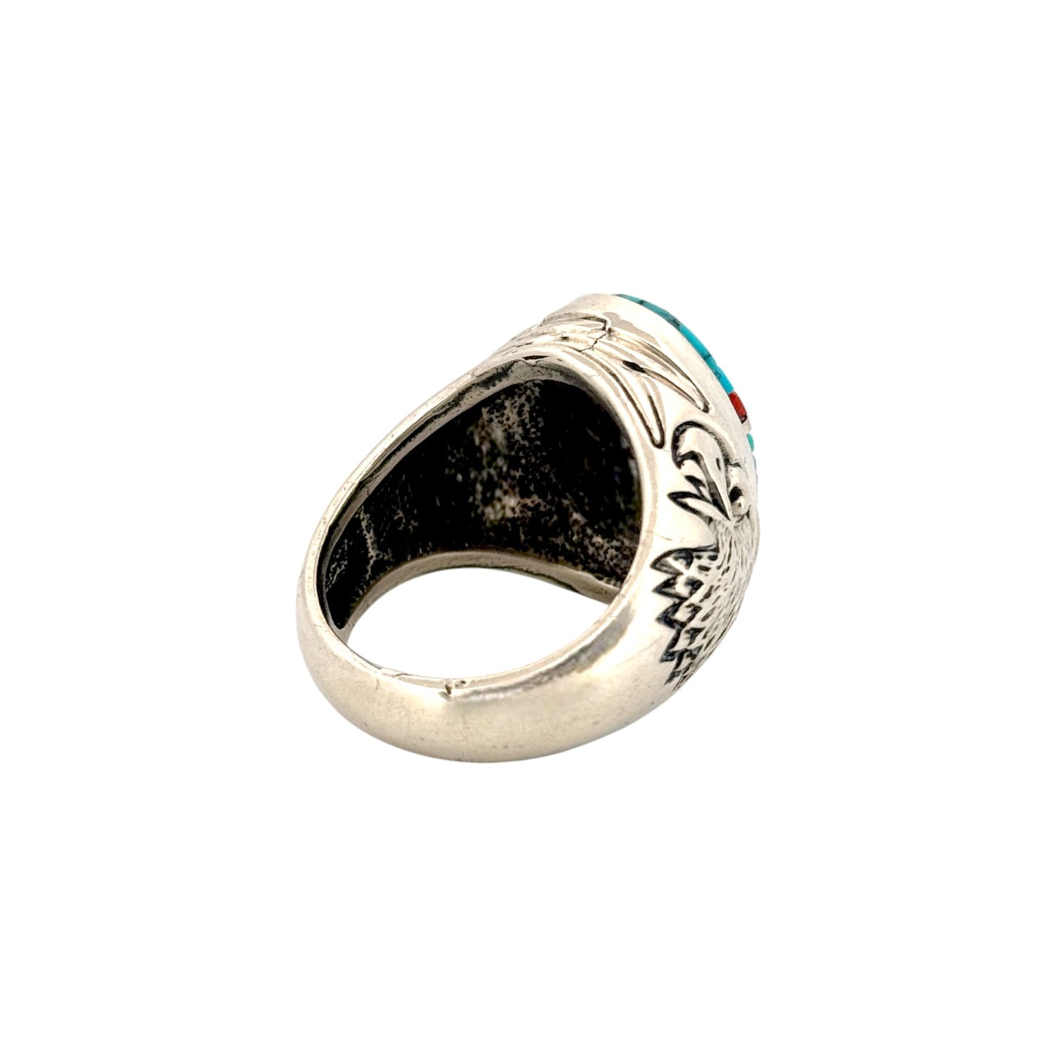 This vibrant vintage Navajo ring, handcrafted circa the 2000s, showcases a striking inlay design featuring Kingman turquoise, Sleeping Beauty turquoise, and red coral. The colorful stones are precisely set in sleek sterling silver channels, creating a dynamic contrast of blues and reds that capture the spirit of the Southwest. Each stone tells a story; the deep matrix of Kingman turquoise, the clear sky-blue of Sleeping Beauty, and the bold red coral symbolizing life and protection. The silverwork is classic and substantial, with hand-stamped detailing along the band for added character. This ring reflects the masterful artistry of Navajo silversmiths who balance traditional design with modern flair.