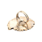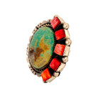 This bold and colorful ring by Navajo artist Sampson Whitegoat beautifully combines Royston turquoise with red and orange spiny oyster shell, creating a stunning contrast that captures the essence of Southwestern artistry. The oval turquoise stone, with its natural blend of sky-blue and golden-brown matrix, serves as the centerpiece and is bordered by square-cut spiny oyster shells. Set in sterling silver, the design is framed by a twisted rope bezel and accented with hand-stamped and beaded details, enhancing the texture and depth of the piece. Each stone is hand-selected for its unique color and pattern, making every ring a true one-of-a-kind creation. Sampson Whitegoat’s silversmithing combines traditional Navajo techniques with bold, modern expression.
