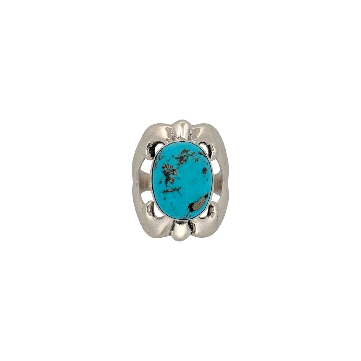This Navajo handmade ring by Edith Kee features a striking oval of Kingman turquoise set in bold sterling silver. The stone shows rich, even blue tones accented by natural matrix that gives it depth and character. A smooth bezel setting is framed by sculptural silverwork, with open cutout details that add dimension and lightness to the design. The polished silver contrasts beautifully with the vivid turquoise, creating a clean yet powerful Southwestern look. Strong, balanced, and timeless, this ring highlights both the beauty of Kingman turquoise and Edith's refined silversmithing style.