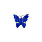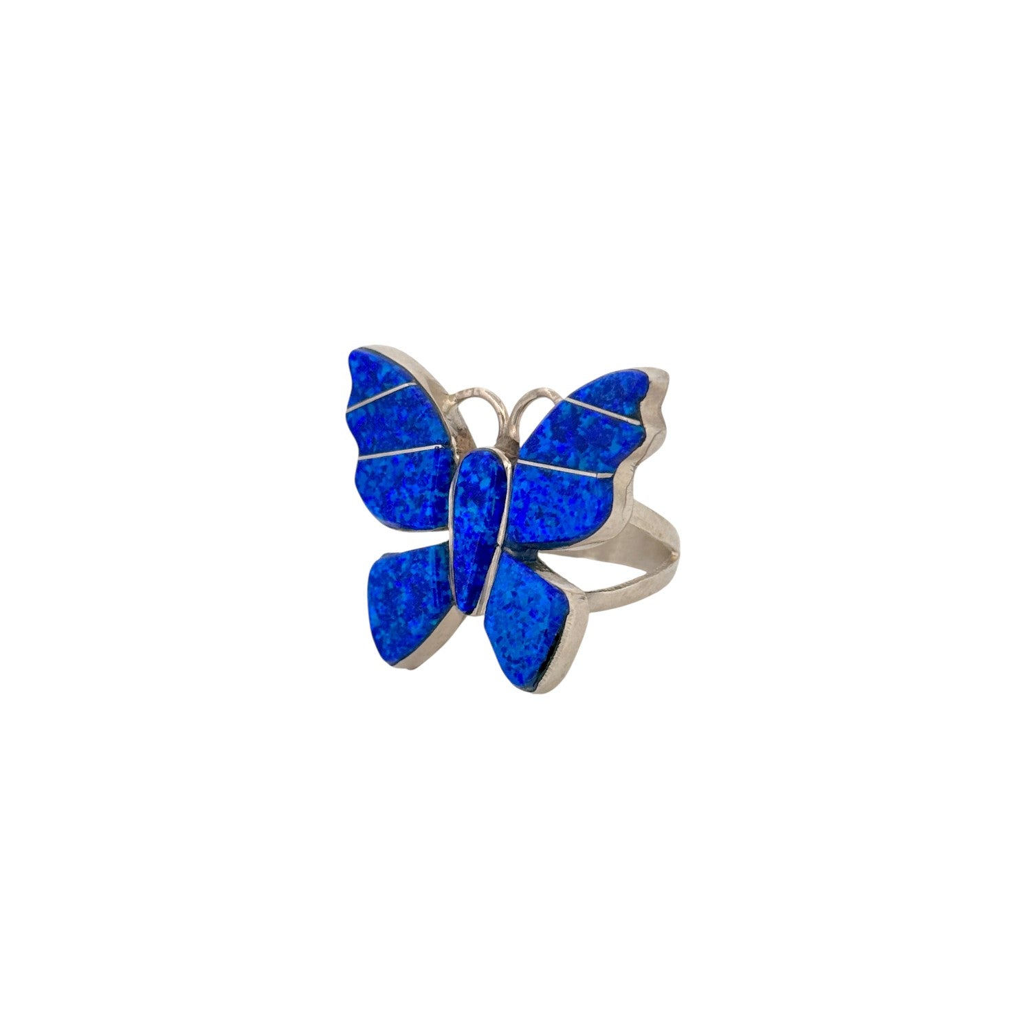 This vintage Zuni handmade ring features a striking butterfly design in vivid blue opal inlay. Carefully cut and fitted stones create a mosaic of electric blues that shimmer with natural variation and depth. Sterling silver outlines each segment, forming clean lines that highlight the symmetry of the wings and body. The openwork silver setting gives the piece a light, airy feel while keeping the focus on the bold inlay. Playful yet elegant, this ring is a beautiful example of classic Zuni inlay artistry with timeless Southwestern charm.