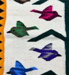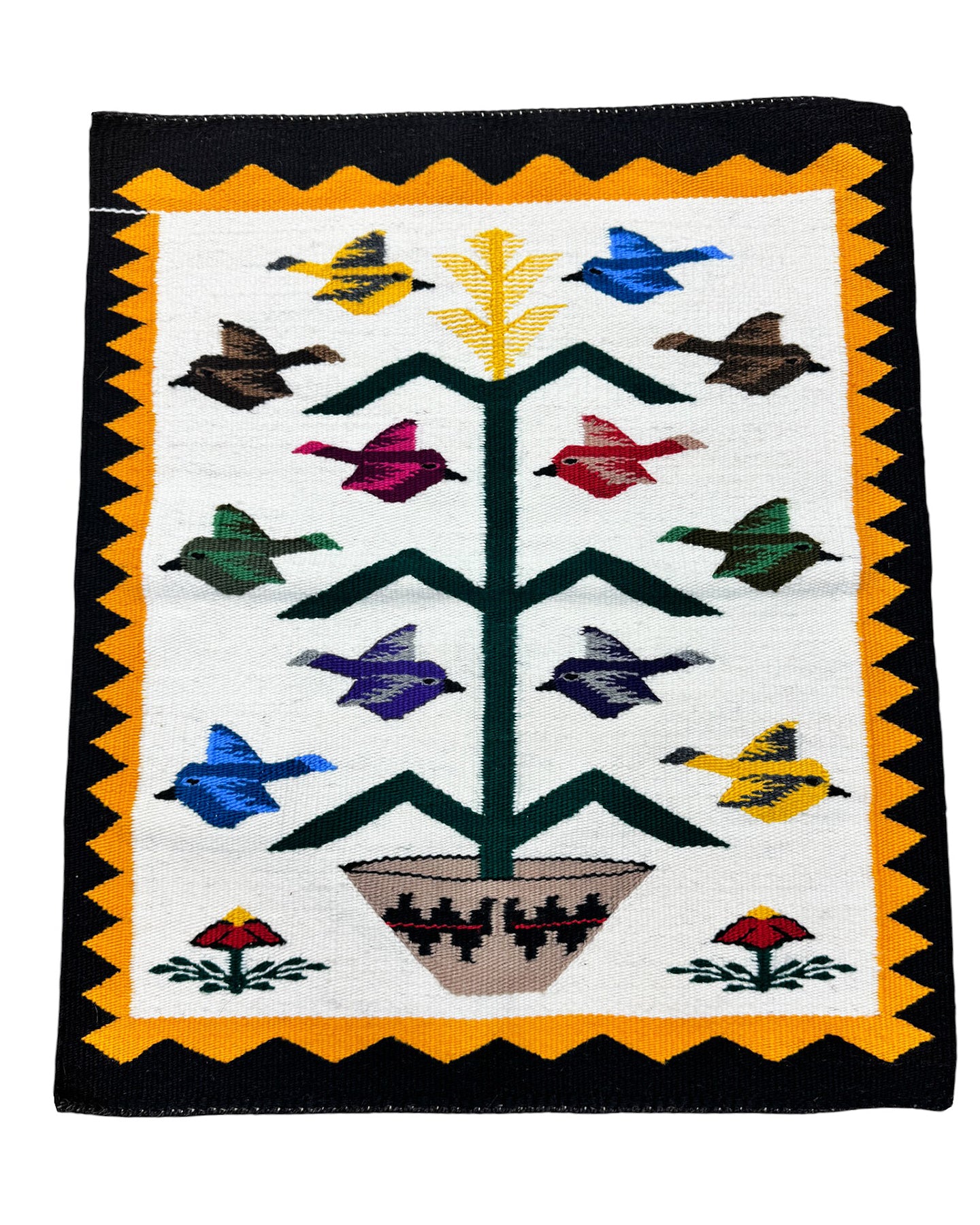 The Navajo Tree of Life is a colorful rug style usually depicting a central corn plant emerging from a Navajo Wedding basket, with birds, feathers and rainbow bars enhancing the design. For the Navajo, corn is sacred, corn is life. “Walking under the corn leaf is the Beauty Way,” a Navajo elder said. Thus, everything that is good, life affirming and positive is embodied in a Tree of Life rug.
