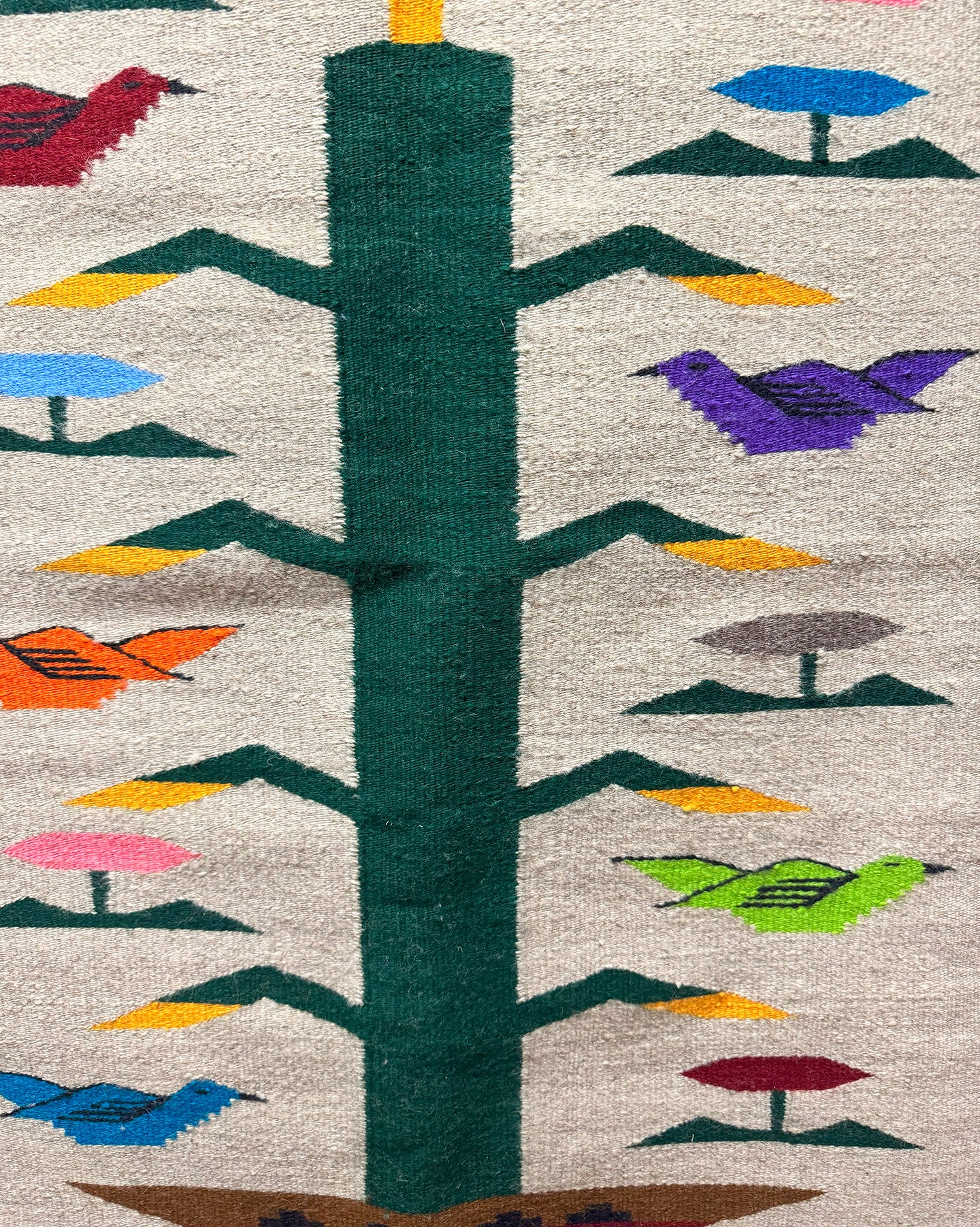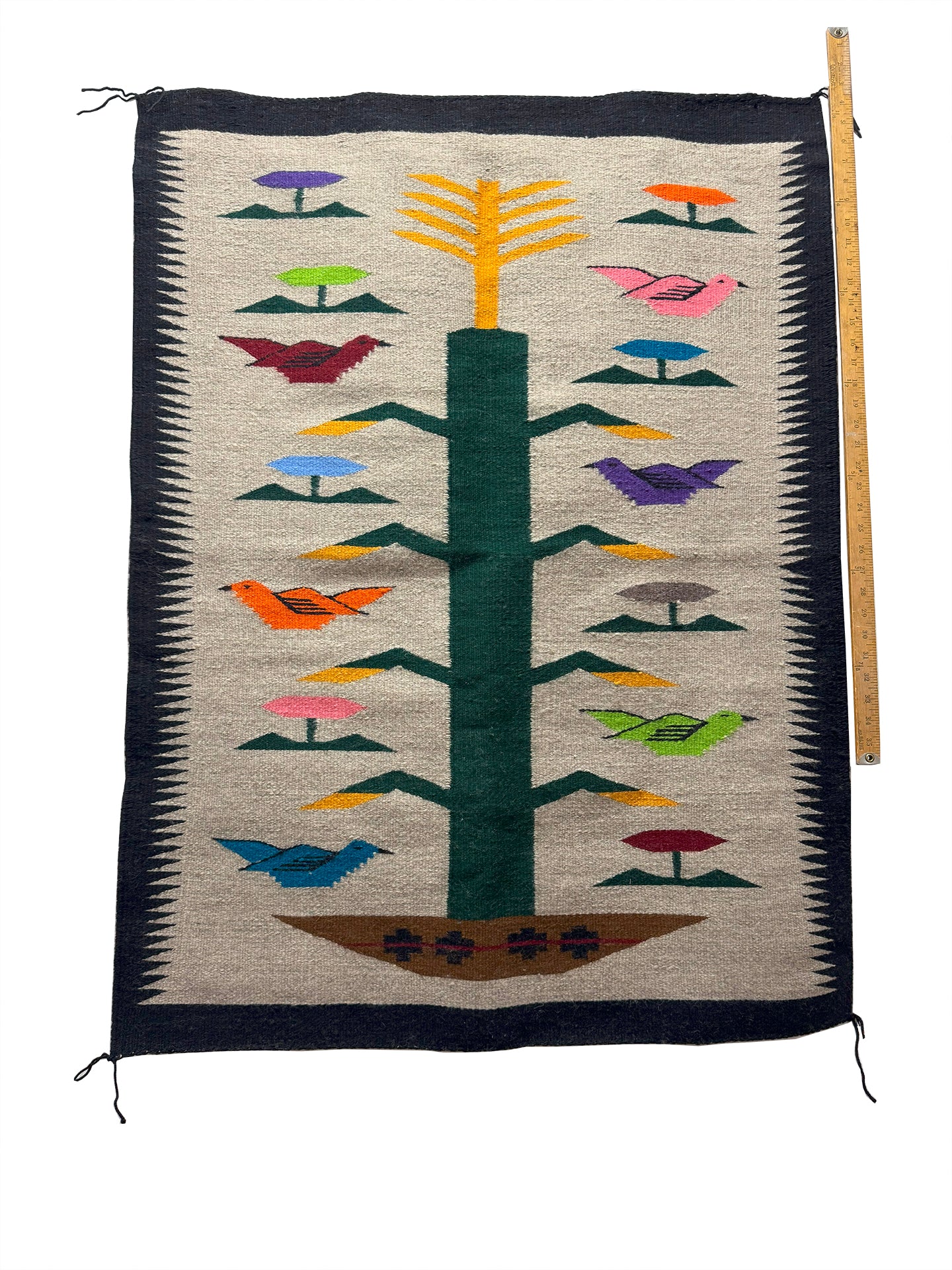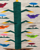The Navajo Tree of Life is a colorful rug style usually depicting a central corn plant emerging from a Navajo Wedding basket, with birds, feathers and rainbow bars enhancing the design. For the Navajo, corn is sacred, corn is life. “Walking under the corn leaf is the Beauty Way,” a Navajo elder said. Thus, everything that is good, life affirming and positive is embodied in a Tree of Life rug.