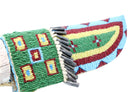 Navajo artist Davin Singer made this beautiful knife. He begins by shaping a large piece of flint into an old style blade used for hunting. The blade is attached to a work of carved art. Davin carves a piece of antler to make the handle. You will find the piece filled with images of eagles and owls. The choice of subject is interesting, a fierce day hunter along with a night time predator. A fitting buckskin beaded knife sheath finishes the piece. An old time four corners design is the theme of the bead work. What an amazing piece of First American art to display in the home or office, and you might even think about taking this one out hunting.?