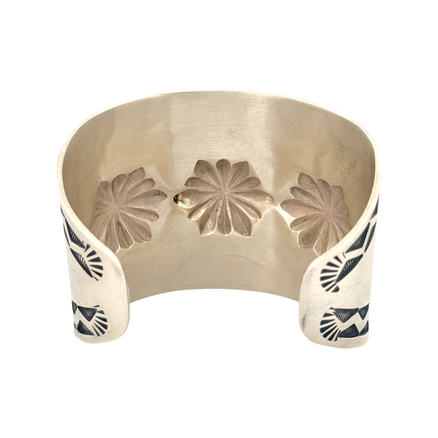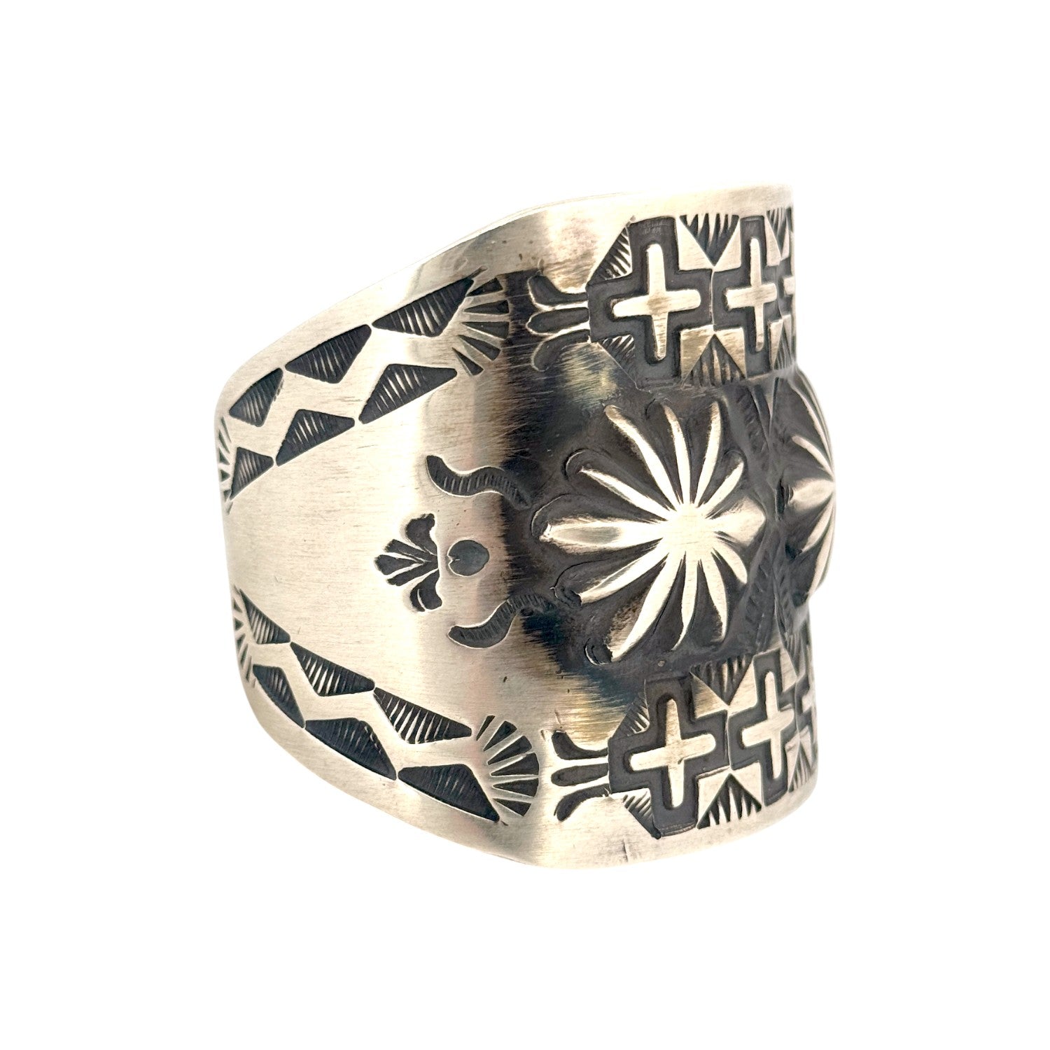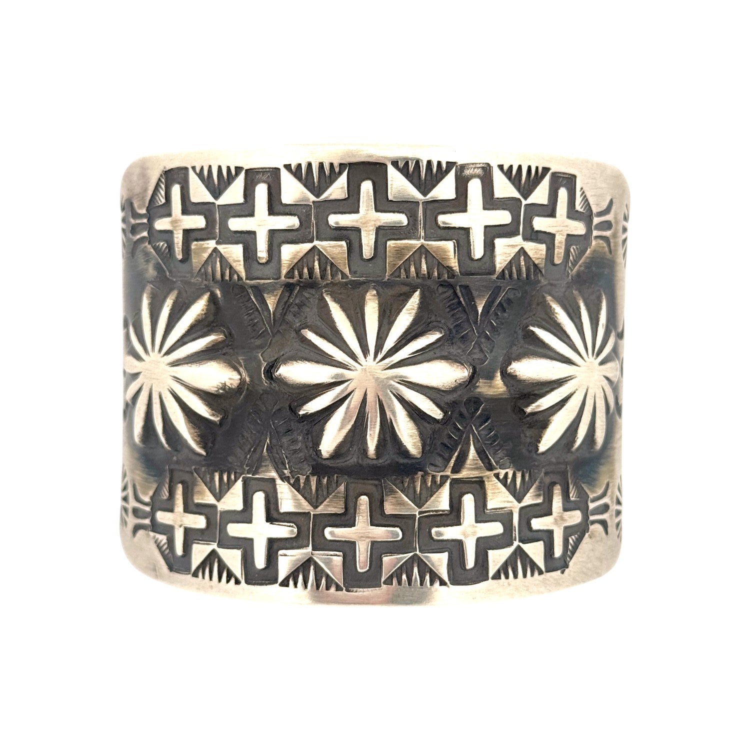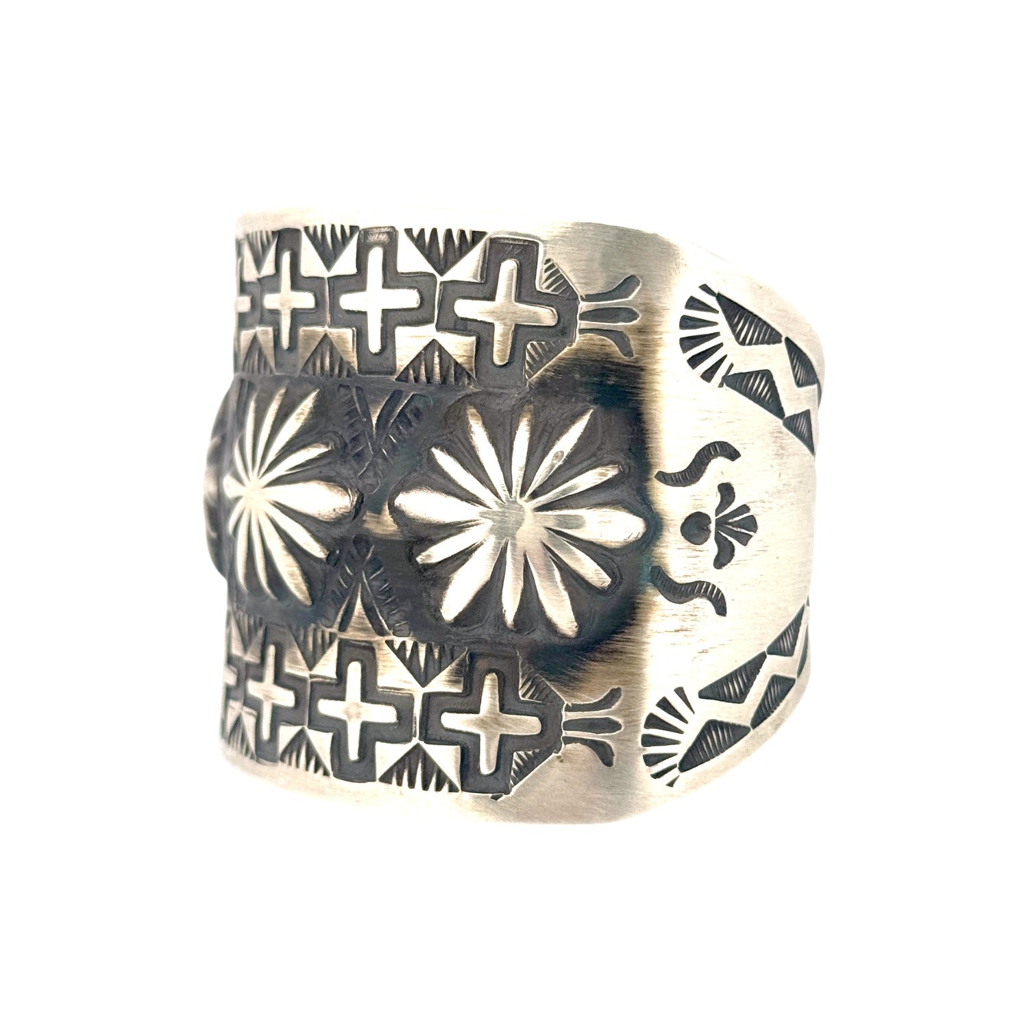 This sterling silver bracelet by renowned Navajo artist Elvira Bill showcases the bold beauty and precision of traditional Navajo silversmithing. Entirely handmade, the wide cuff features intricate stamp work with geometric crosses and radiating floral motifs that reflect harmony and balance in Navajo symbolism. The deep oxidized background enhances the contrast, bringing out the fine details and giving the piece a timeless, dimensional look. Each stamped design is carefully executed, showcasing Elvira Bill’s exceptional craftsmanship and eye for symmetry. The bracelet’s substantial weight and solid silver construction give it both durability and presence. Elegant yet powerful, this piece embodies the spirit of Navajo artistry—rooted in tradition yet refined for contemporary wear.