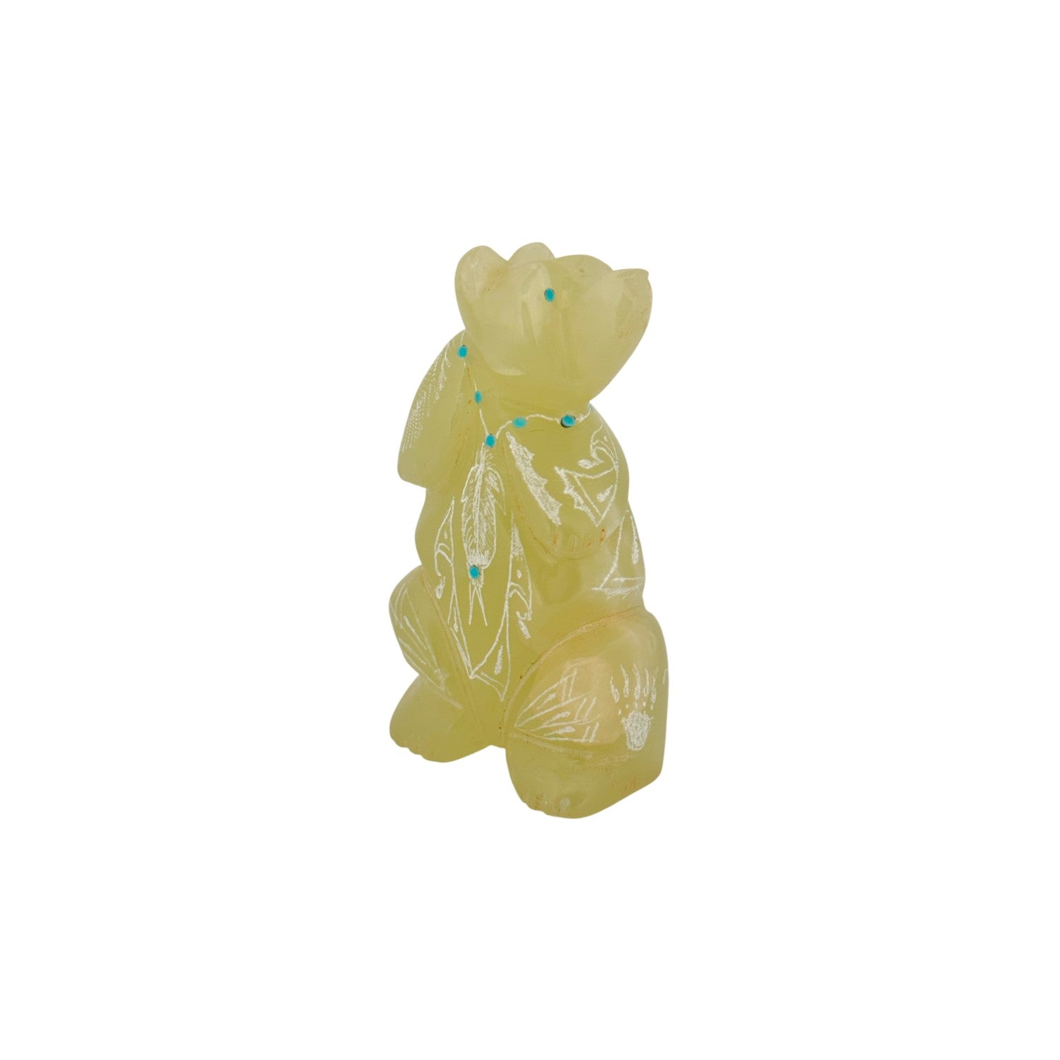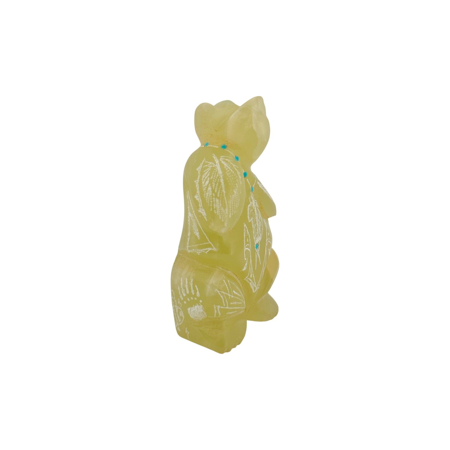 This elegant bear fetish by Zuni artist Adrian Cachini is masterfully hand-carved from rich onyx, showcasing soft natural hues and smooth polish. The bear, a revered Zuni symbol of strength, healing, and protection, stands proudly with a sense of quiet power and balance. Delicate etched designs across its body are highlighted with turquoise inlay, adding depth and spiritual significance. The stone’s natural variations give the carving a luminous quality, enhancing its lifelike presence. This piece beautifully reflects Adrian Cachini’s artistry and devotion to Zuni tradition, making it a timeless expression of resilience and spirit.