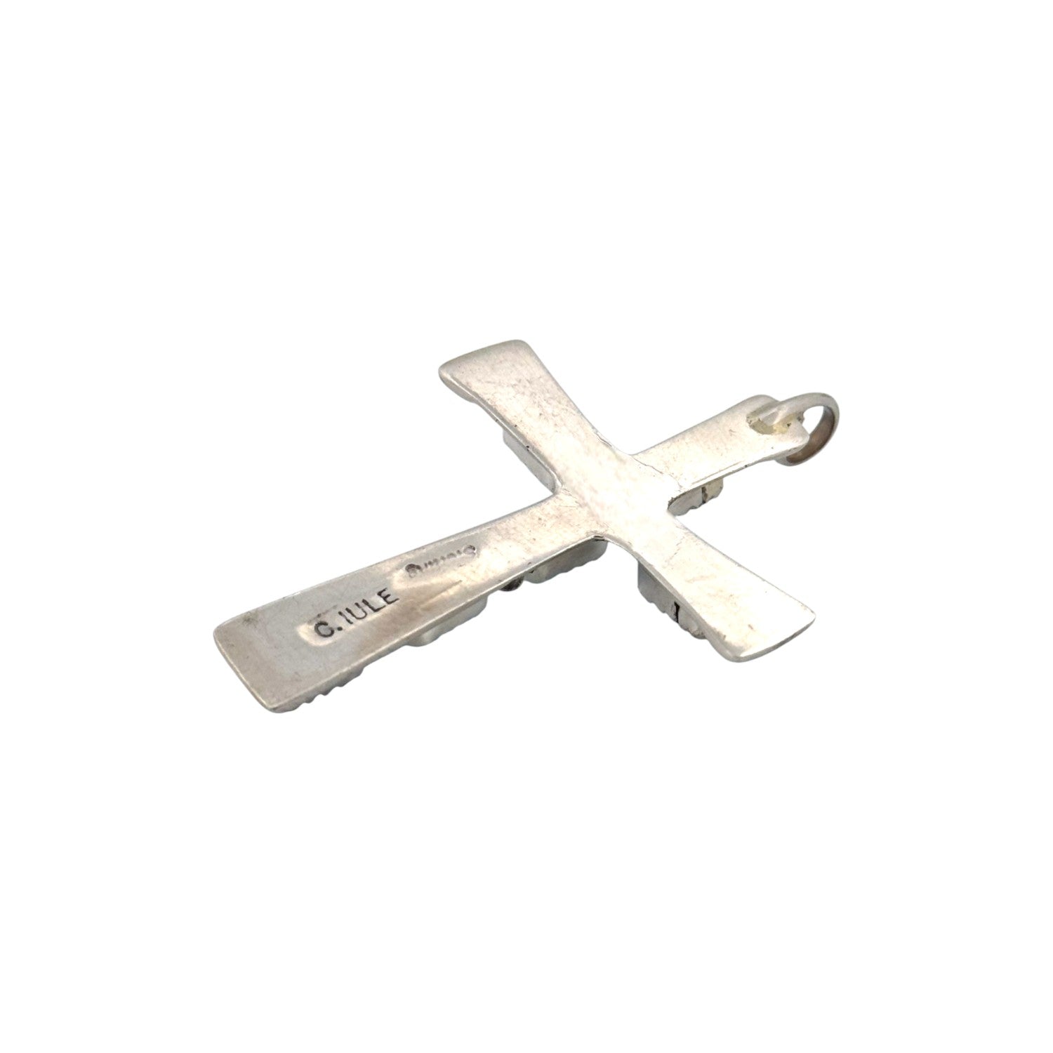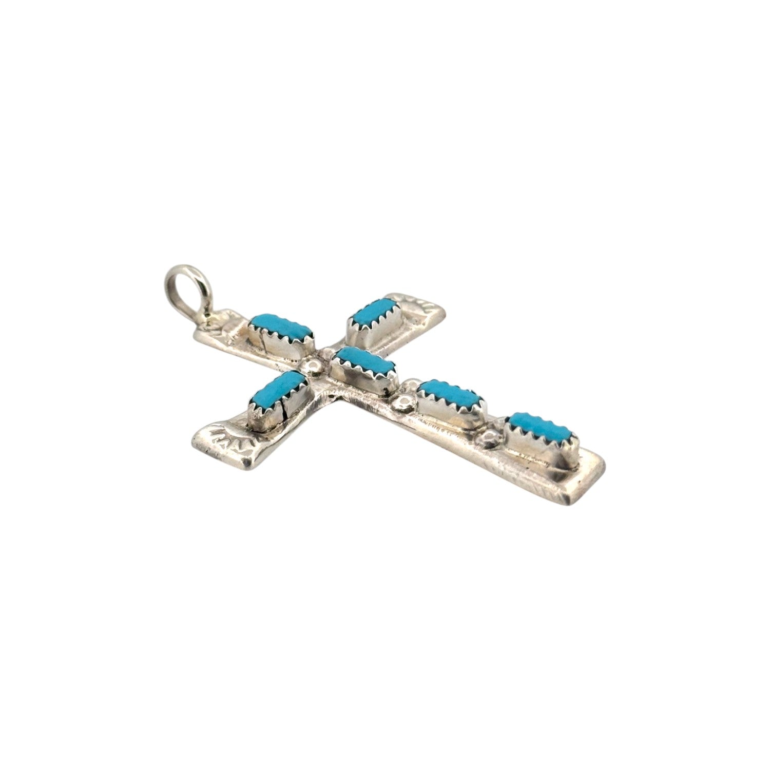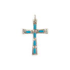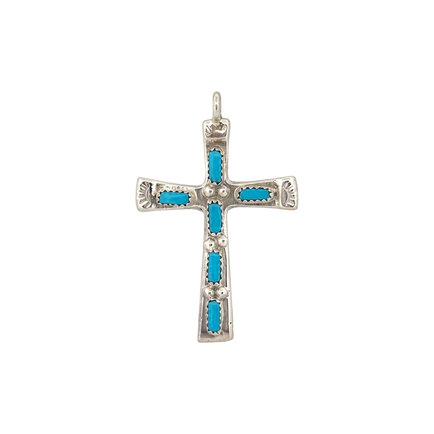 Cecilia Iule presents a stunning expression of faith and craftsmanship with this Zuni handmade pendant. Beautifully crafted in sterling silver, this elegant cross pendant with vibrant Sleeping Beauty Turquoise, renowned for its sky-blue hue and clarity. Each turquoise stone is precisely cut and set in fine bezels, creating a striking contrast against the polished silver. The delicate stamp work on the ends of the cross arms adds traditional Zuni detailing, enhancing its cultural significance and artistry. Silver beads adorn the center and spine of the cross, adding depth and dimension to the piece. These pendant carries both spiritual and aesthetic appeal, perfect for those who cherish meaningful jewelry with authentic Southwestern roots.