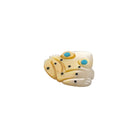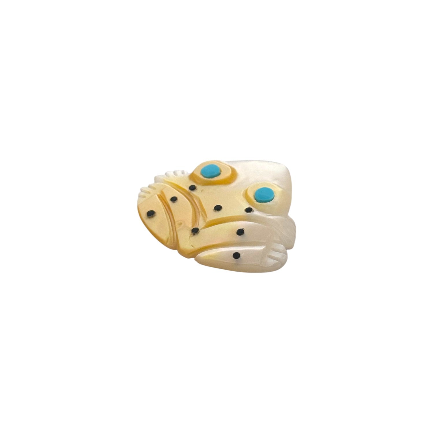 This exquisite Zuni hand-carved frog by Cheryl Beyuka is crafted from a lustrous mother of pearl, radiating a warm golden and ivory sheen that shifts beautifully in the light. Its turquoise inlaid eyes add a striking pop of color, bringing life and vibrancy to the piece. Delicate black dot inlays accent the frog’s back and sides, adding texture and symbolic detail. In Zuni tradition, the frog is a powerful symbol of rain, fertility, and renewal, representing abundance and the nurturing gifts of water. Beyuka’s precise carving captures both the natural beauty of the animal and the spiritual significance it holds in Zuni culture. The smooth polish and refined detailing reflect the exceptional craftsmanship for which Zuni fetish carvers are celebrated.