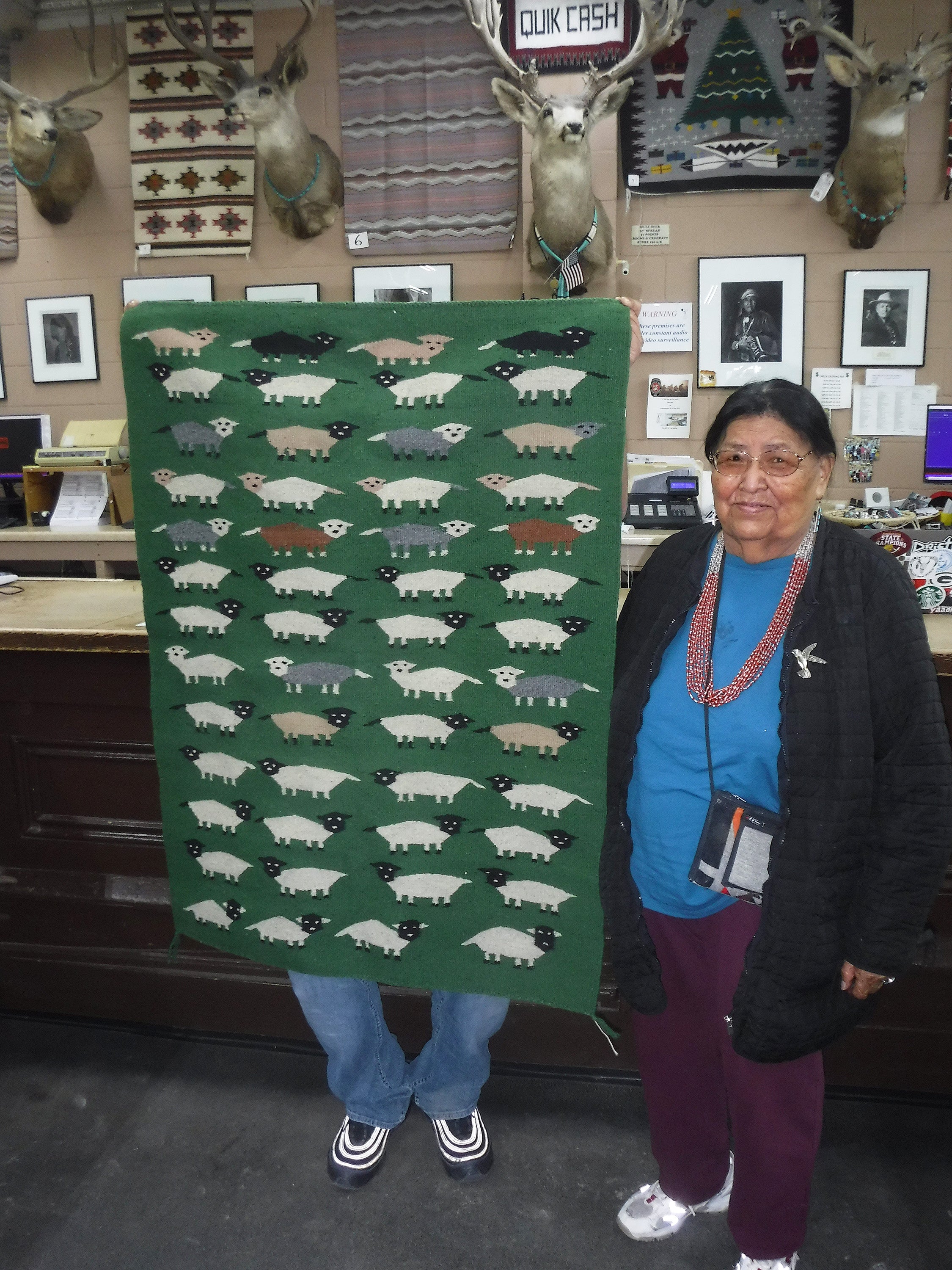 Special weavings like this pictorial by Norah Bitah are becoming more elusive. She has woven into the hillside a number of sheep, all the colors. This is a pictorial and will look amazing displayed in your home.