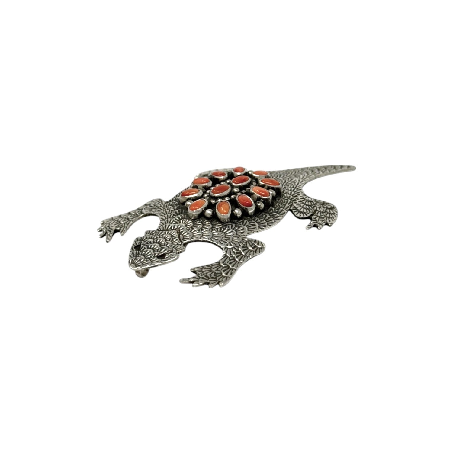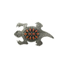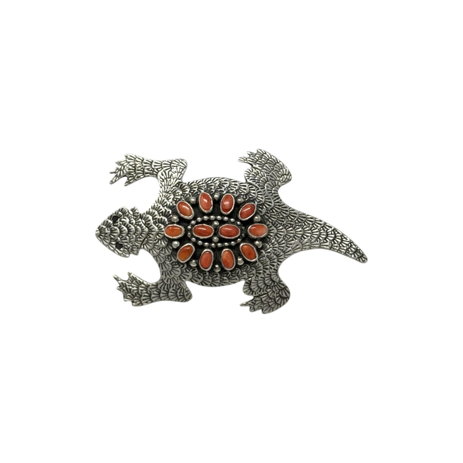 This dynamic turtle pin / pendant by master Navajo artist Lee Charley is a striking fusion of symbolism and craftsmanship. Handcrafted in sterling silver, the turtle form is intricately textured with stamped patterns that echo the scales and spirit of this ancient creature. At the center of the shell, a radiant cluster of red spiny oyster shell cabochons creates a brilliant sunburst, offering warm, earthy contrast against the oxidized silver background. The turtle, a powerful Native symbol of endurance, wisdom, and protection, is brought to life with Charley’s detailed metalwork and balanced composition.