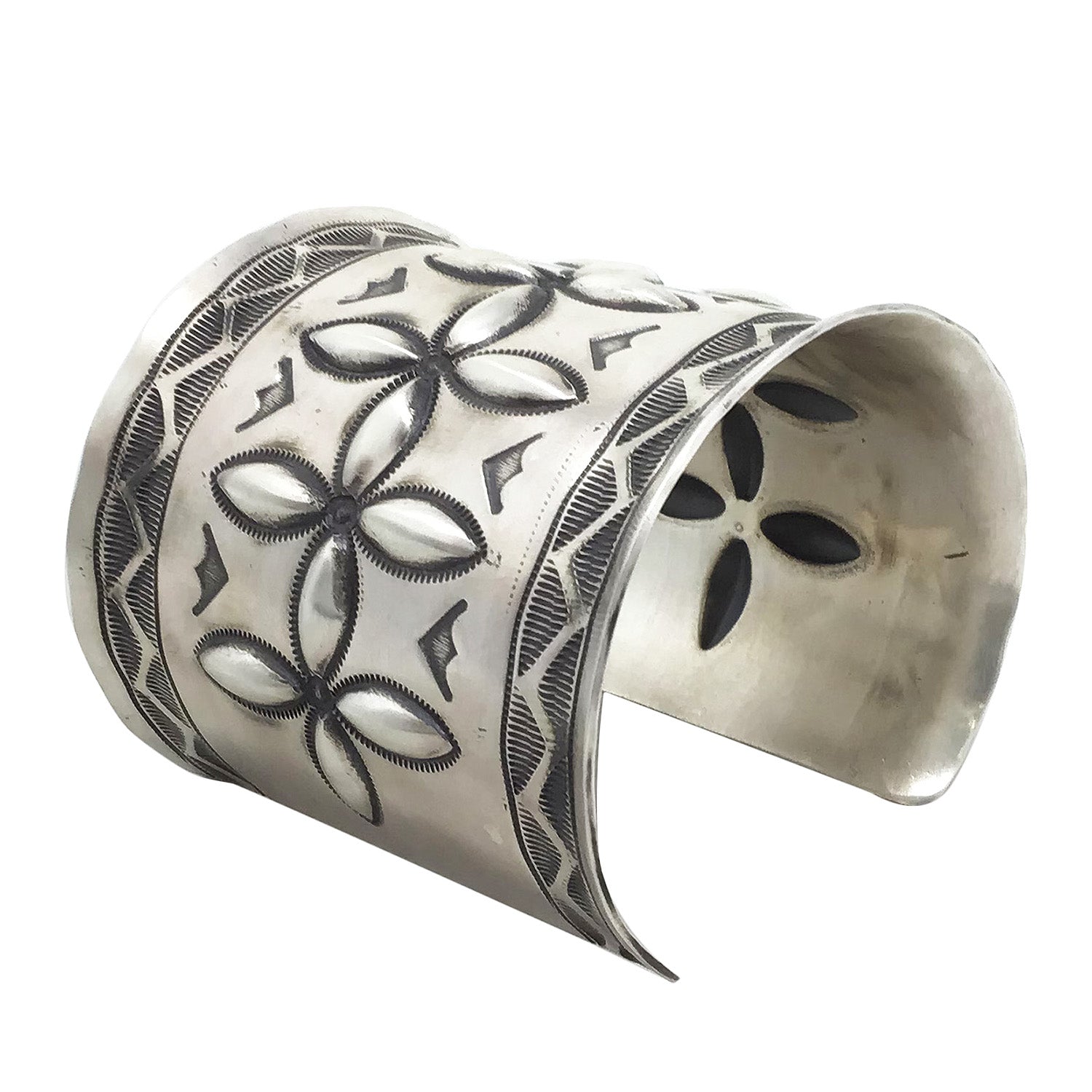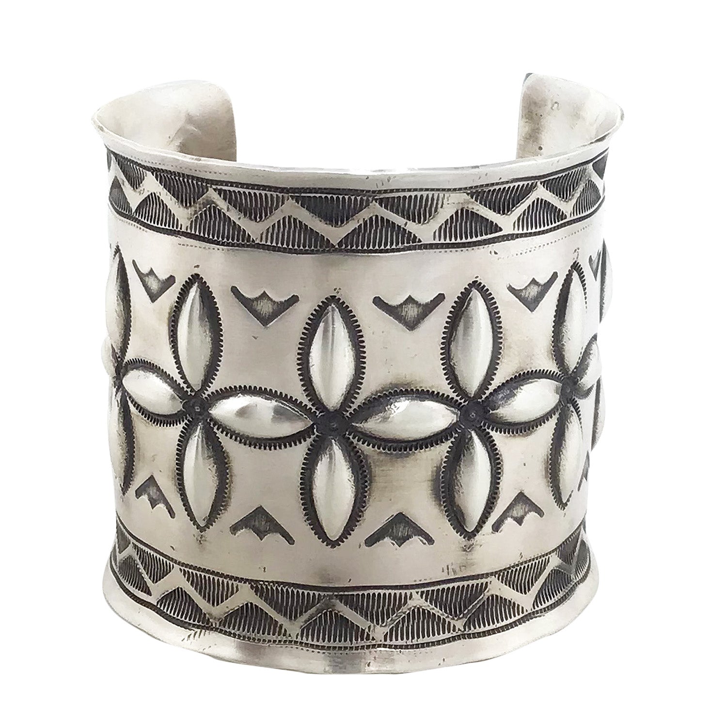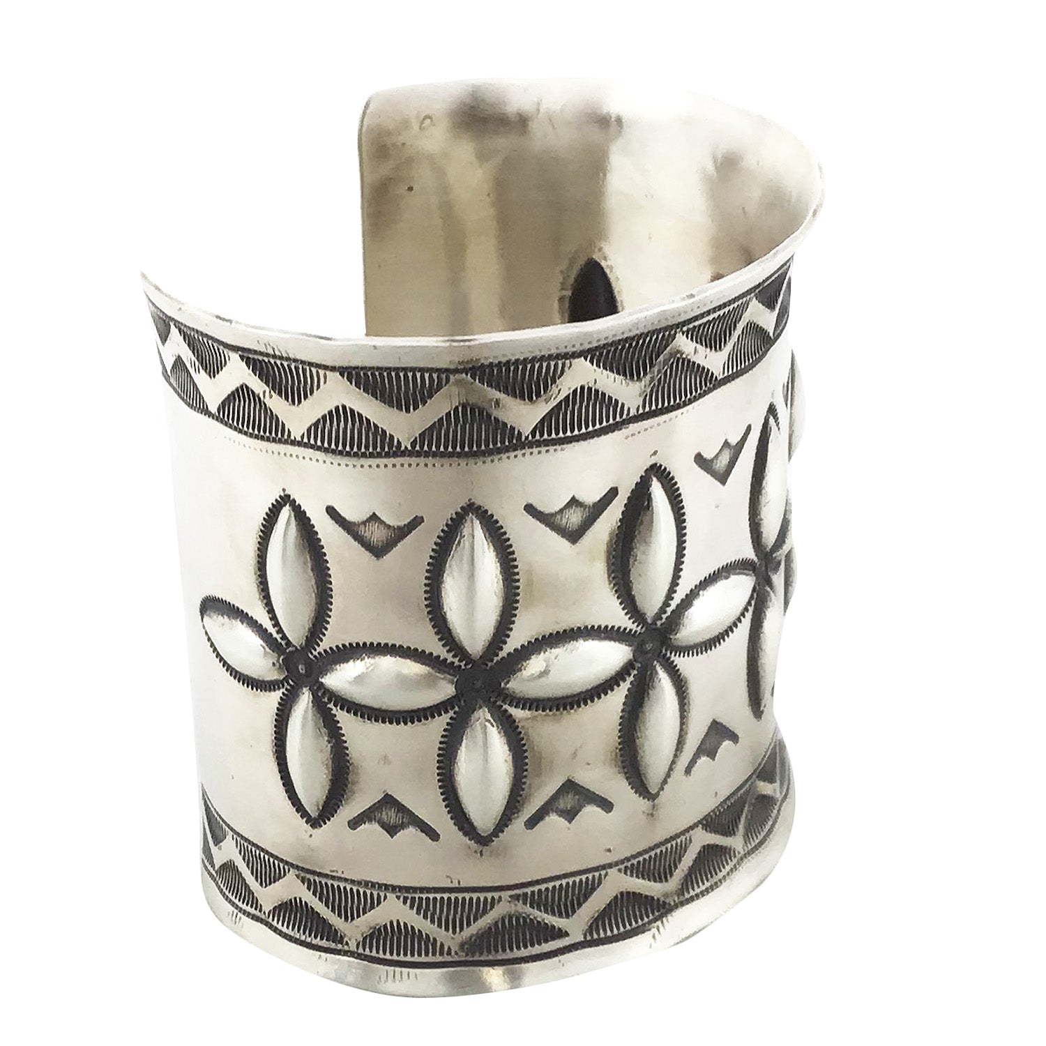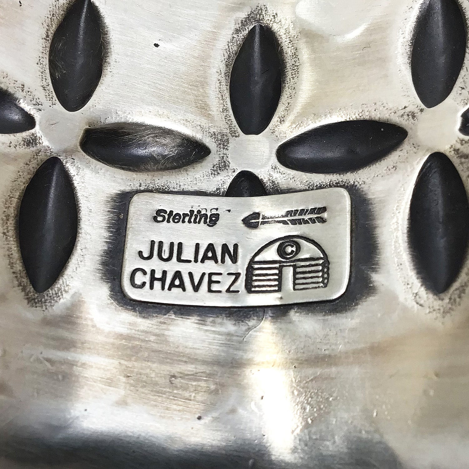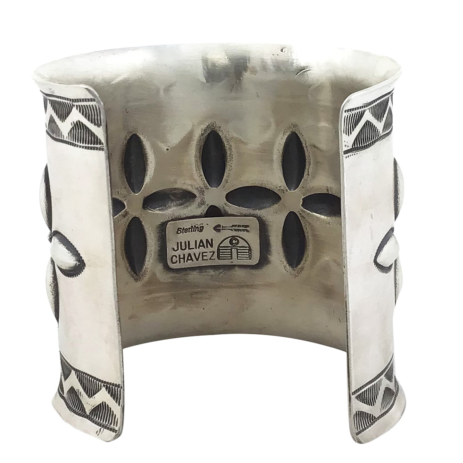 Navajo silversmith Julian Chavez moves between traditional and contemporary styles of wearable art. He is known for spectacular inlay creations and his old-style cuffs are coveted by a number of collectors. This is his signature cuff with a concave design. He fills the wide cuff with a combination of bump outs and flat stamp designs, a beautiful combination of work. Julian uses a sating finish that will make this bracelet look amazing with your favorite denim. Make sure you keep coming back to the online Trading Post where we will get more of his work up.