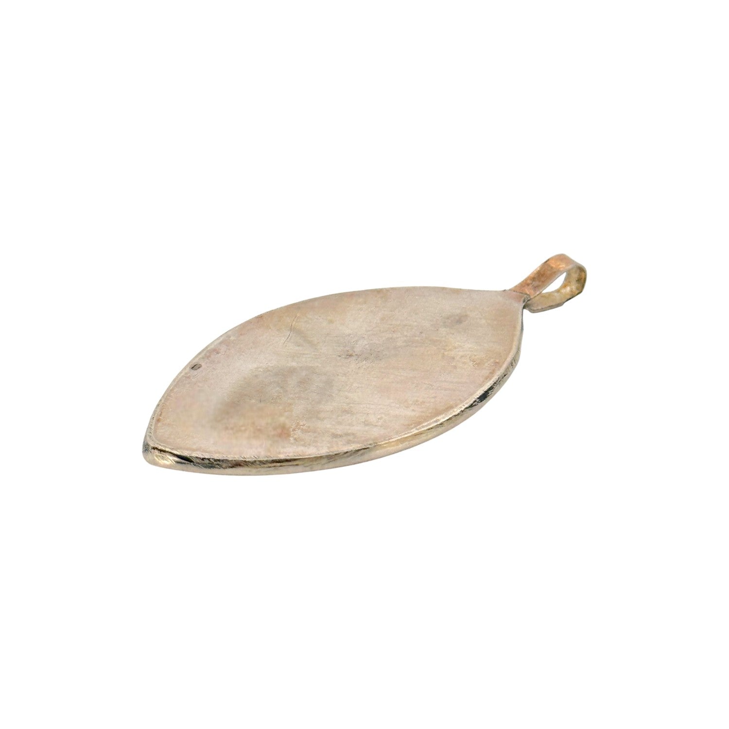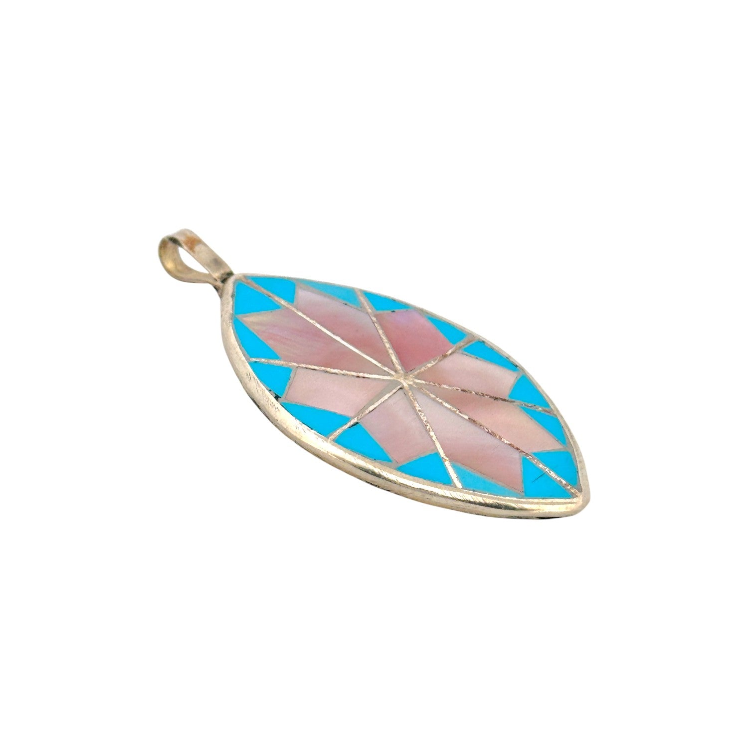 This elegant pendant by Zuni artisan David Chavez showcases the precision and artistry of traditional Zuni inlay work. Crafted from pink shell and Sleeping Beauty Turquoise, the design forms a radiant geometric pattern resembling a blossoming star or flower. The soft iridescence of the pink shell beautifully contrasts with the vivid sky-blue hues of the turquoise, creating a harmonious balance of color and light. Set in fine sterling silver, each stone is meticulously hand-cut and inlaid to perfection, reflecting the detailed craftsmanship for which Zuni jewelry is renowned. The marquise-shaped form gives the pendant a graceful, modern silhouette rooted in cultural tradition.