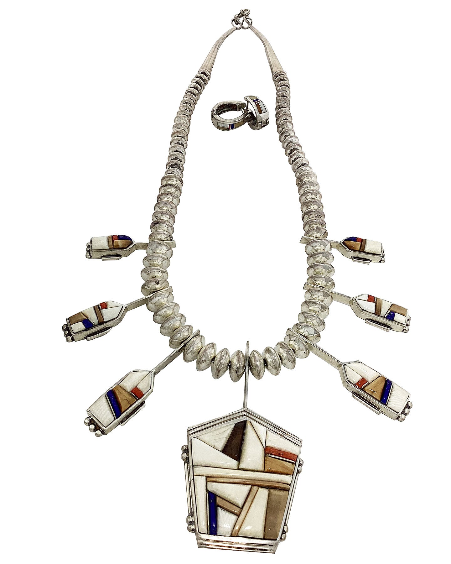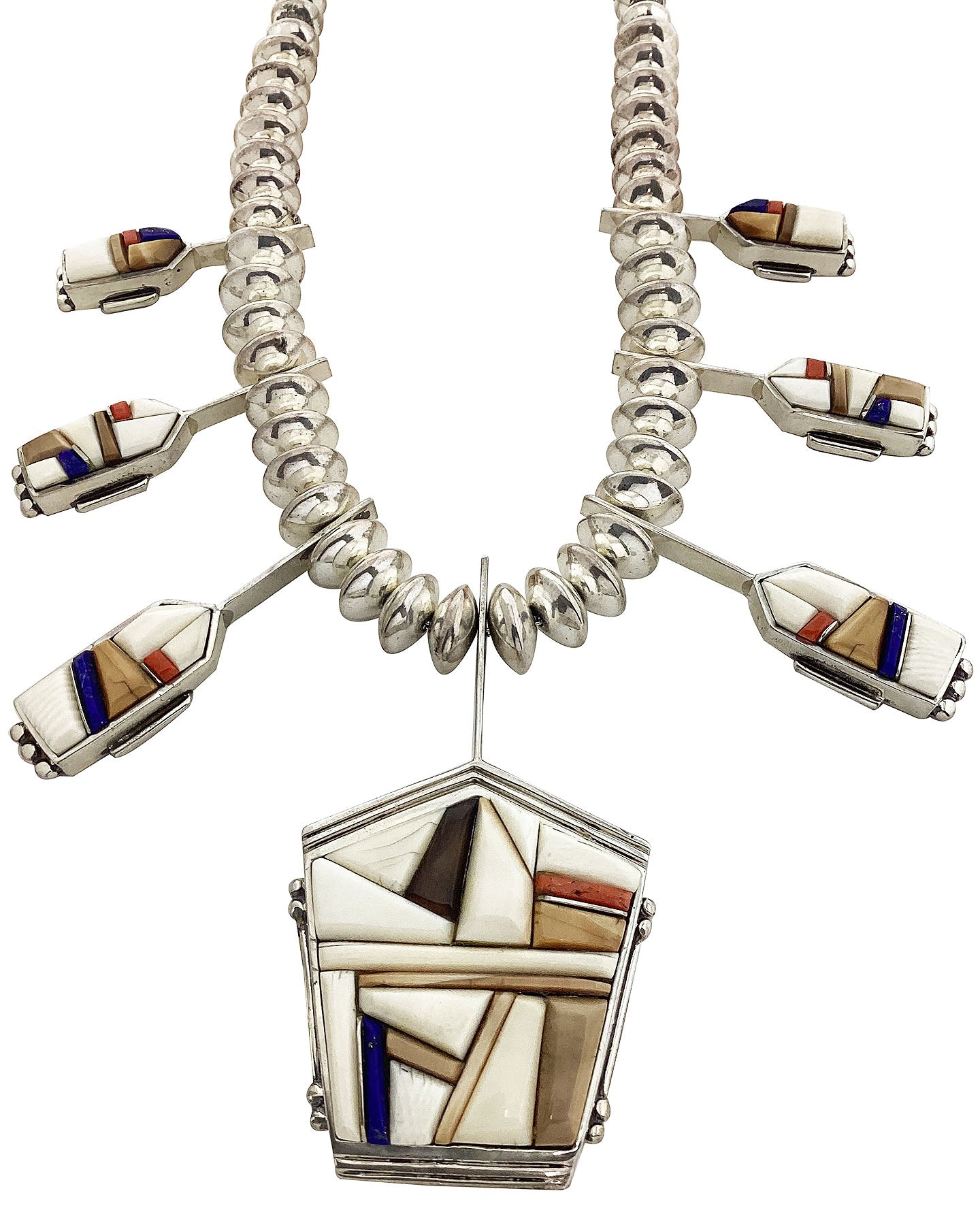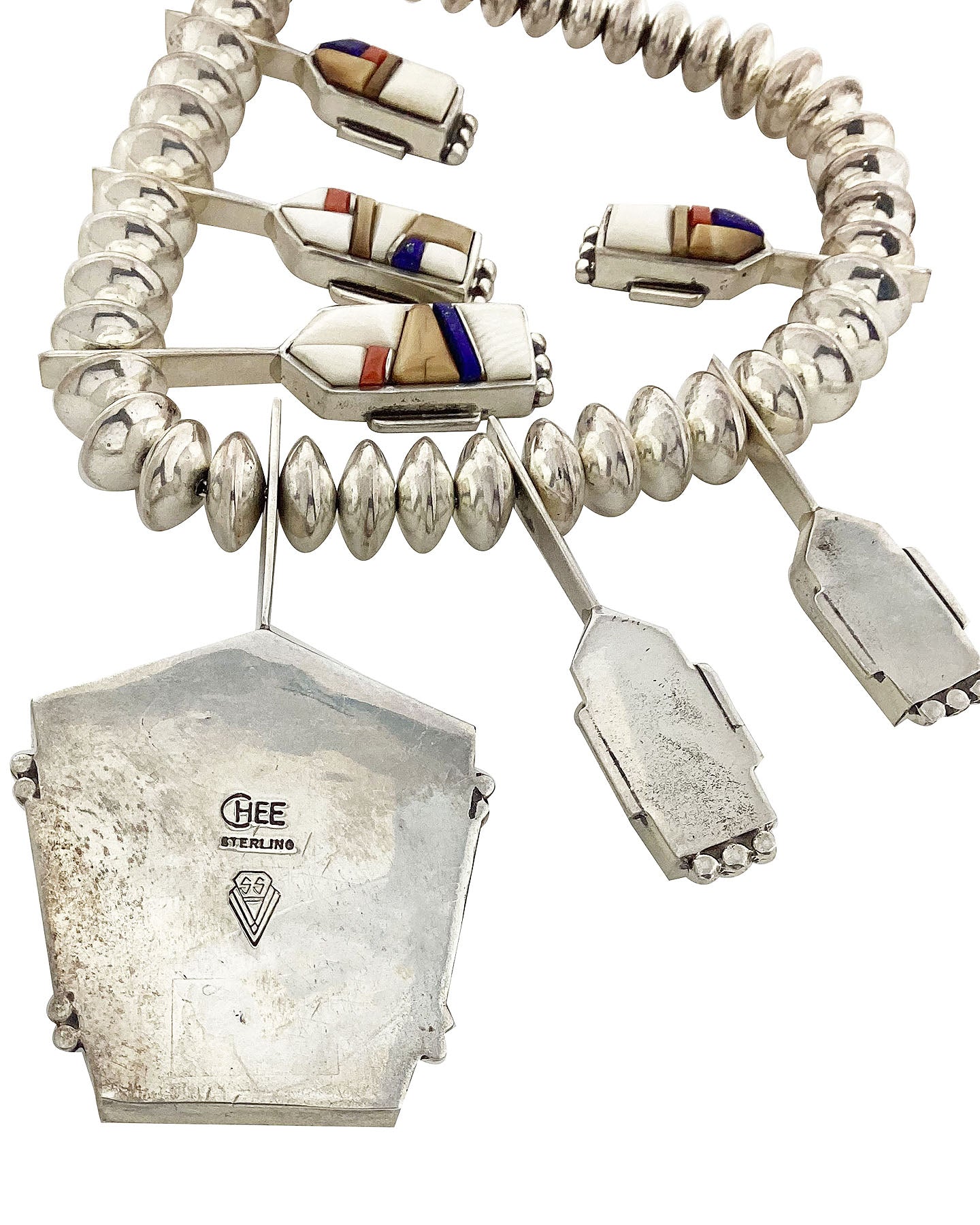 Billboards leading into Gallup, New Mexico claim that 70% of Native American jewelry comes from this area. That translates to lots of incredibly talented artist come from Gallup. One of those is Navajo artist Peterson Chee. This versatile silversmith is capable of making a wide range of styles and does work for different shops in town. Next to his hallmark you will find the Supersmith stamp. Supersmith is known for quality jewelry and is found in tourists’ destinations across the Southwest. That explains the quality stones you will find in this amazing piece of wearable art. Peterson Chee has puzzled together fossilized stone, lapis, coral, and strips of silver. The six inlaid pieces hang from wonderful Navajo handmade pearls. This necklalce has some age and is around 10 – 15 years old.