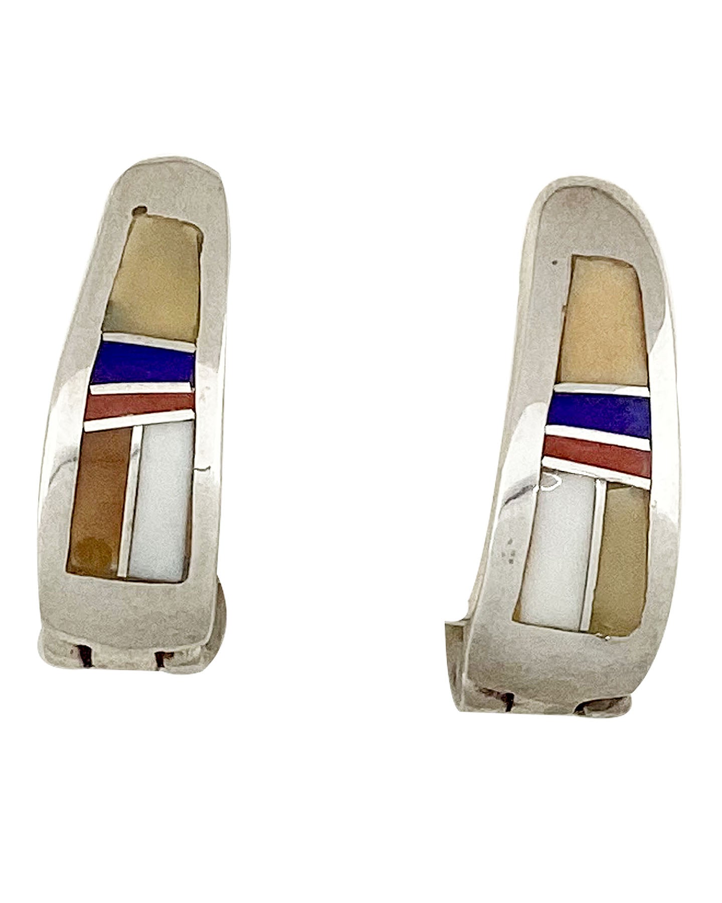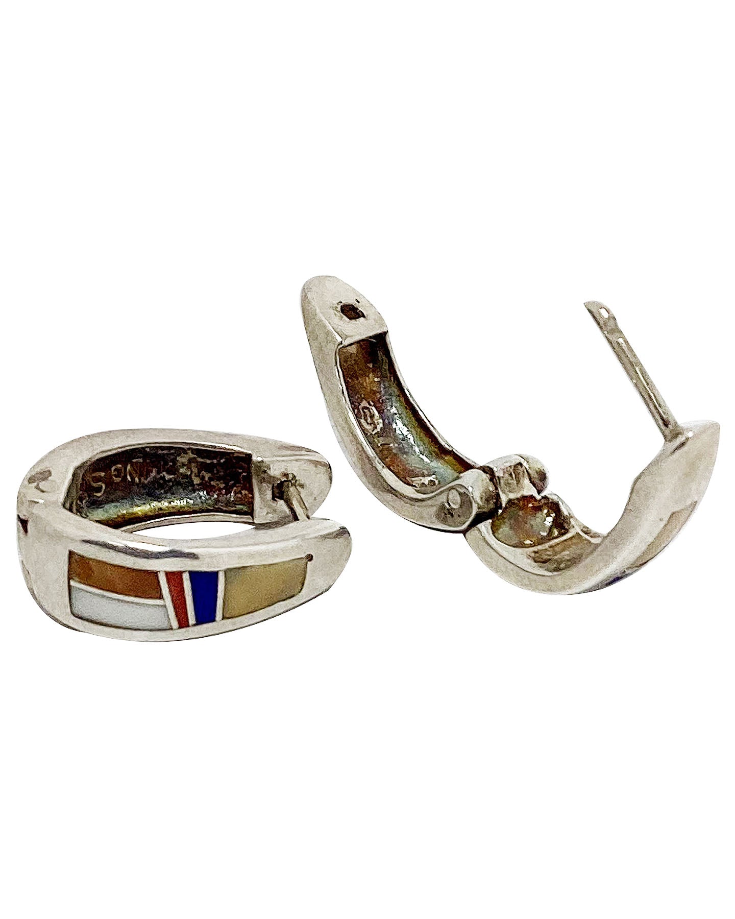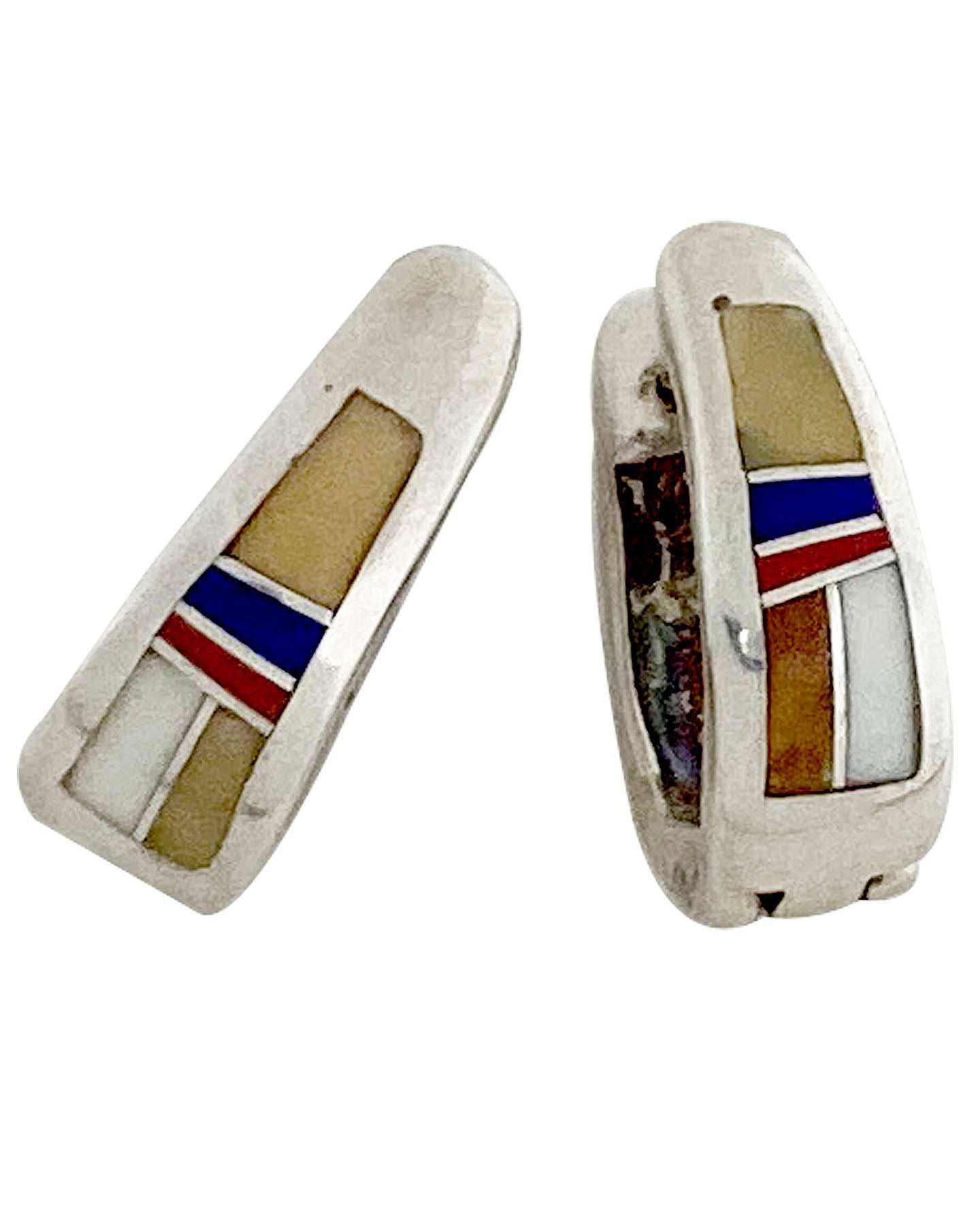 Billboards leading into Gallup, New Mexico claim that 70% of Native American jewelry comes from this area. That translates to lots of incredibly talented artist come from Gallup. One of those is Navajo artist Peterson Chee. This versatile silversmith is capable of making a wide range of styles and does work for different shops in town. Next to his hallmark you will find the Supersmith stamp. Supersmith is known for quality jewelry and is found in tourists’ destinations across the Southwest. That explains the quality stones you will find in this amazing piece of wearable art. Peterson Chee has puzzled together fossilized stone, lapis, coral, and strips of silver. The six inlaid pieces hang from wonderful Navajo handmade pearls. This necklalce has some age and is around 10 – 15 years old.