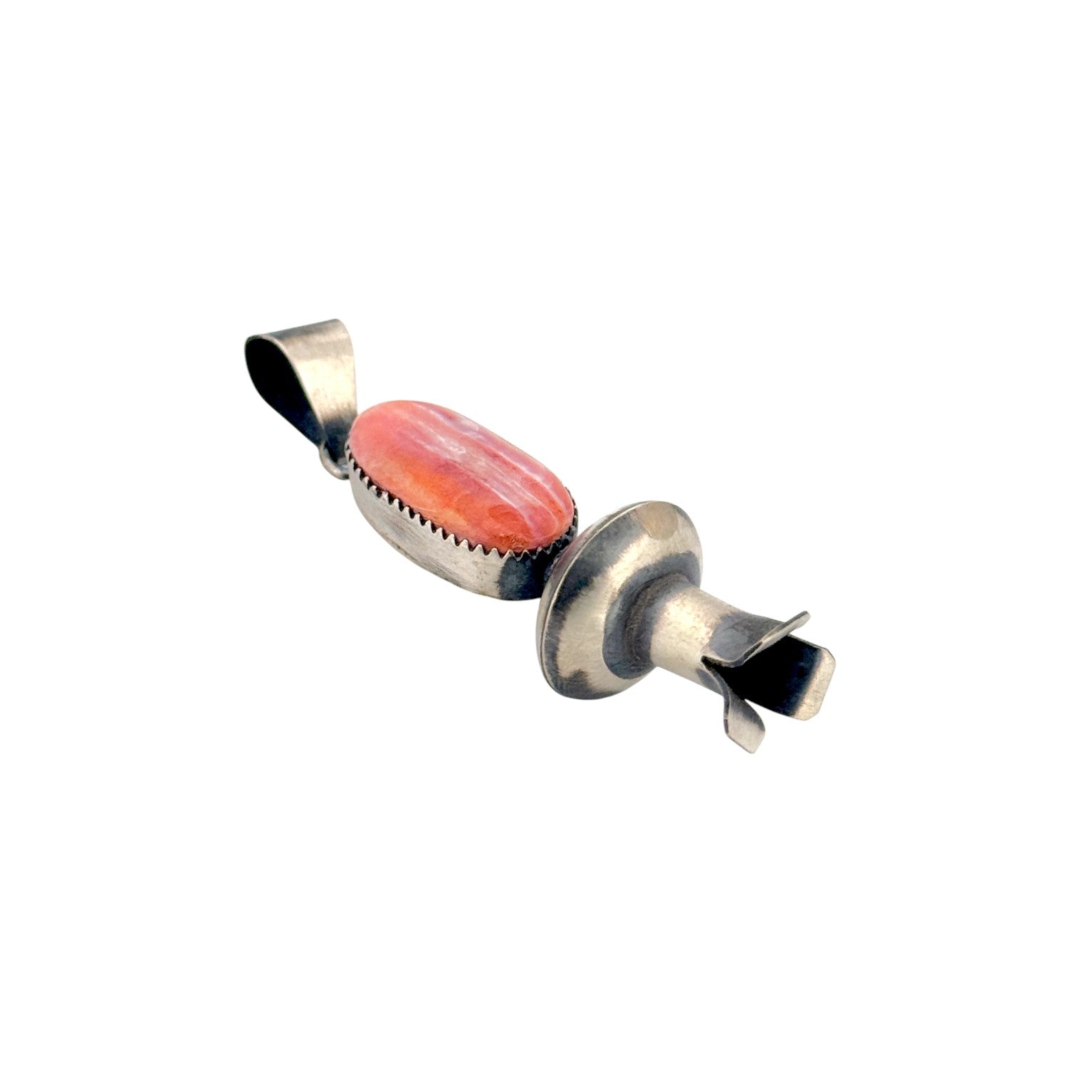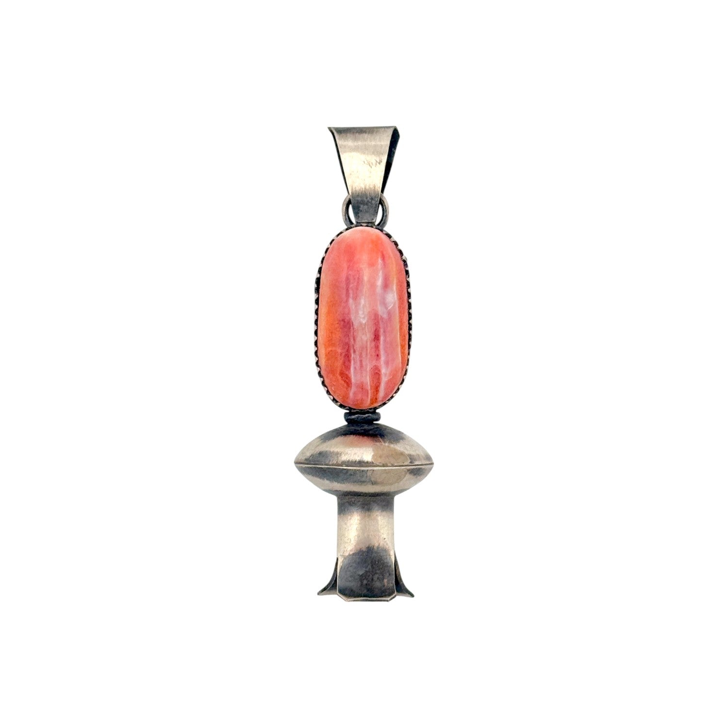 This elegant pendant by Navajo artist Lorita Chone highlights the vibrant beauty of Spiny Oyster Shell, known for its warm coral and orange tones with natural striations. The elongated oval shell is set in a finely detailed sterling silver bezel, its earthy hues glowing against the cool silver frame. Below the stone, a handcrafted silver element adds depth and character, echoing traditional Navajo forms with a touch of modern artistry. Chone’s skillful silverwork demonstrates balance and refinement, capturing both strength and grace in her design. The pendant’s sleek, vertical composition gives it a timeless elegance that pairs beautifully with any style.