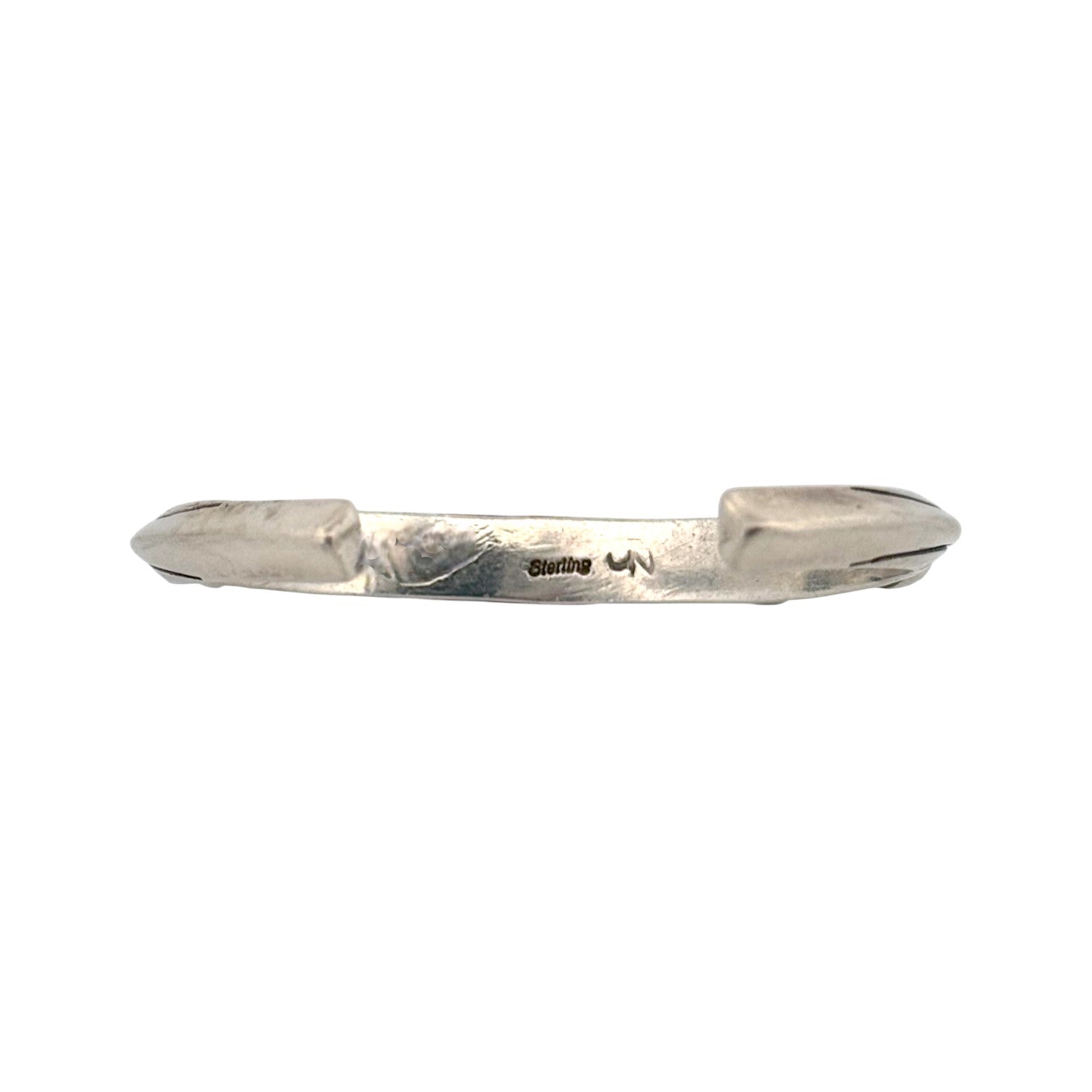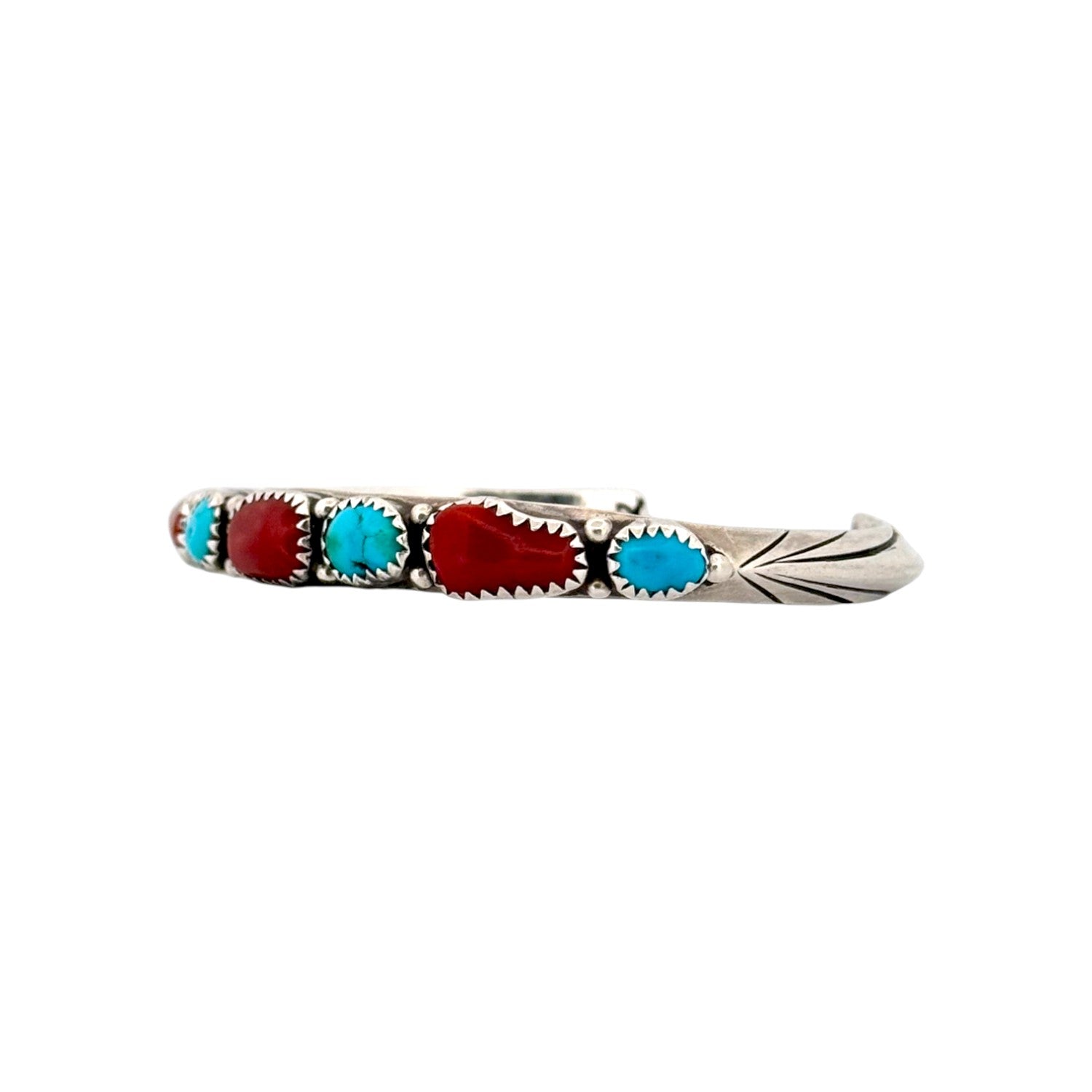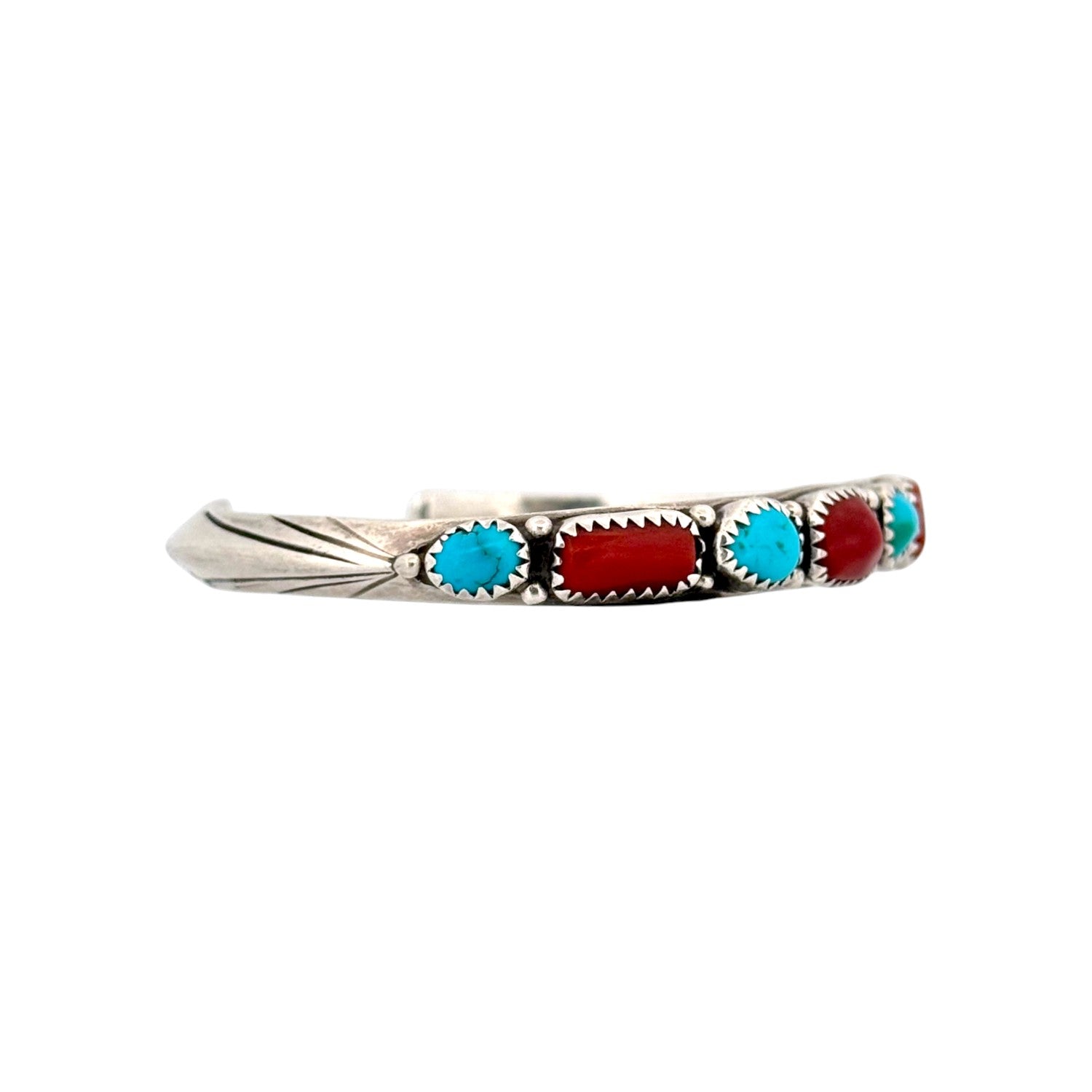 This vintage Navajo bracelet, circa 2000s, stamped with the UN Hallmark, is a beautiful expression of design with Kingman Turquoise and Coral in sterling silver. The cuff features alternating cabochons of bright blue turquoise and deep red coral, creating a striking contrast of color and texture. Each stone is set in a finely crafted sawtooth bezel, accented with silver drops for added dimension. The slim and elegant band allows the vibrant stones to take center stage, making it perfect for layering with other pieces or wearing alone as a subtle statement. The natural matrix in the turquoise and the rich tone of the coral highlight the beauty of traditional Southwestern materials. Handcrafted with care, this bracelet reflects the artistry and cultural heritage of Navajo silversmithing.