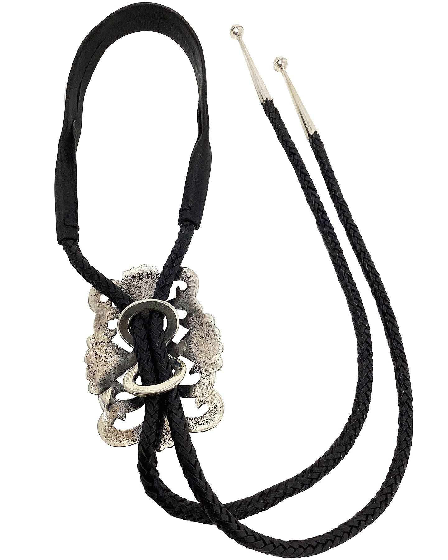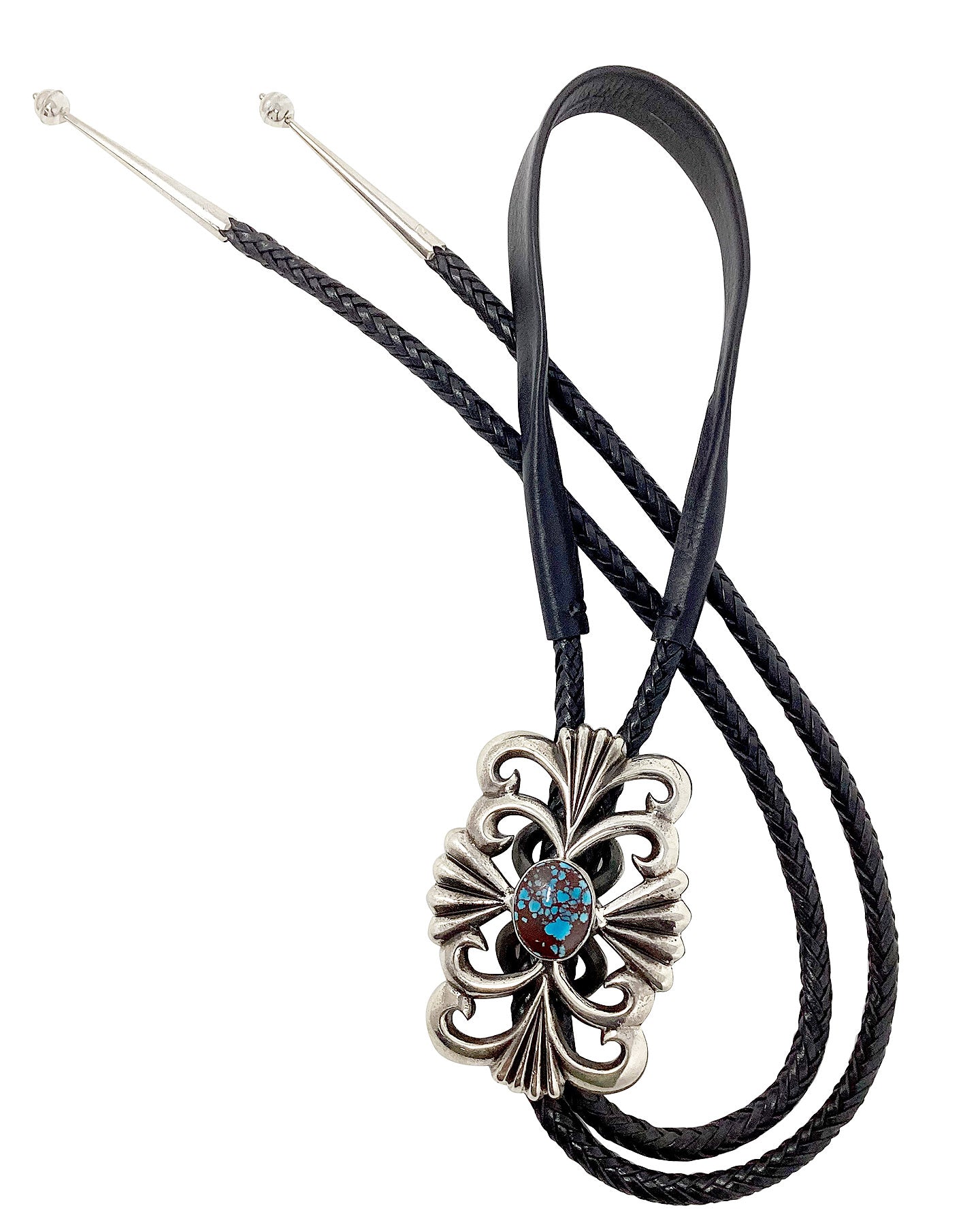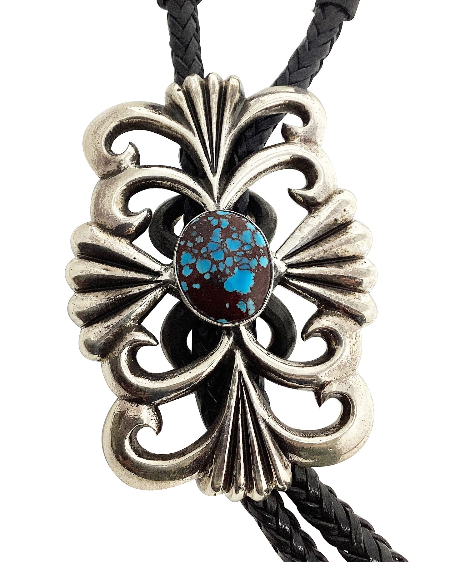 Navajo silversmith Wilford Henry made this gorgeous turquoise and silver bolo. He used a rich colored piece of Egyptian Turquoise that shows off a fascinating deep blue and heavy matrix pattern. The stone sits at the center of the bolo that will remind you of those classic sandcast belt buckles. This is a traditional Navajo style that will become your everyday favorite. It is finished with sterling silver tips and a braided leather cord. Sandcast silver always captures the beauty of the Four Corners.
