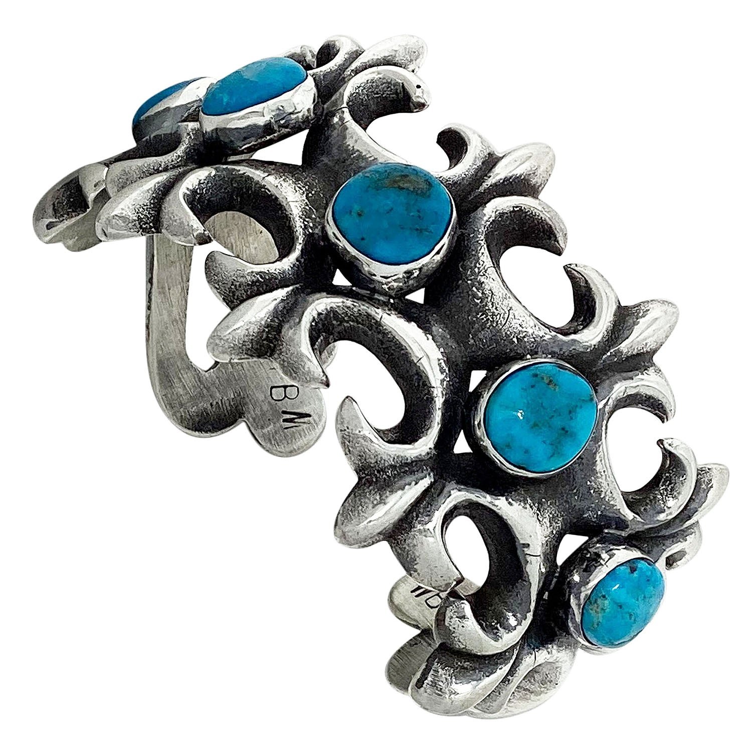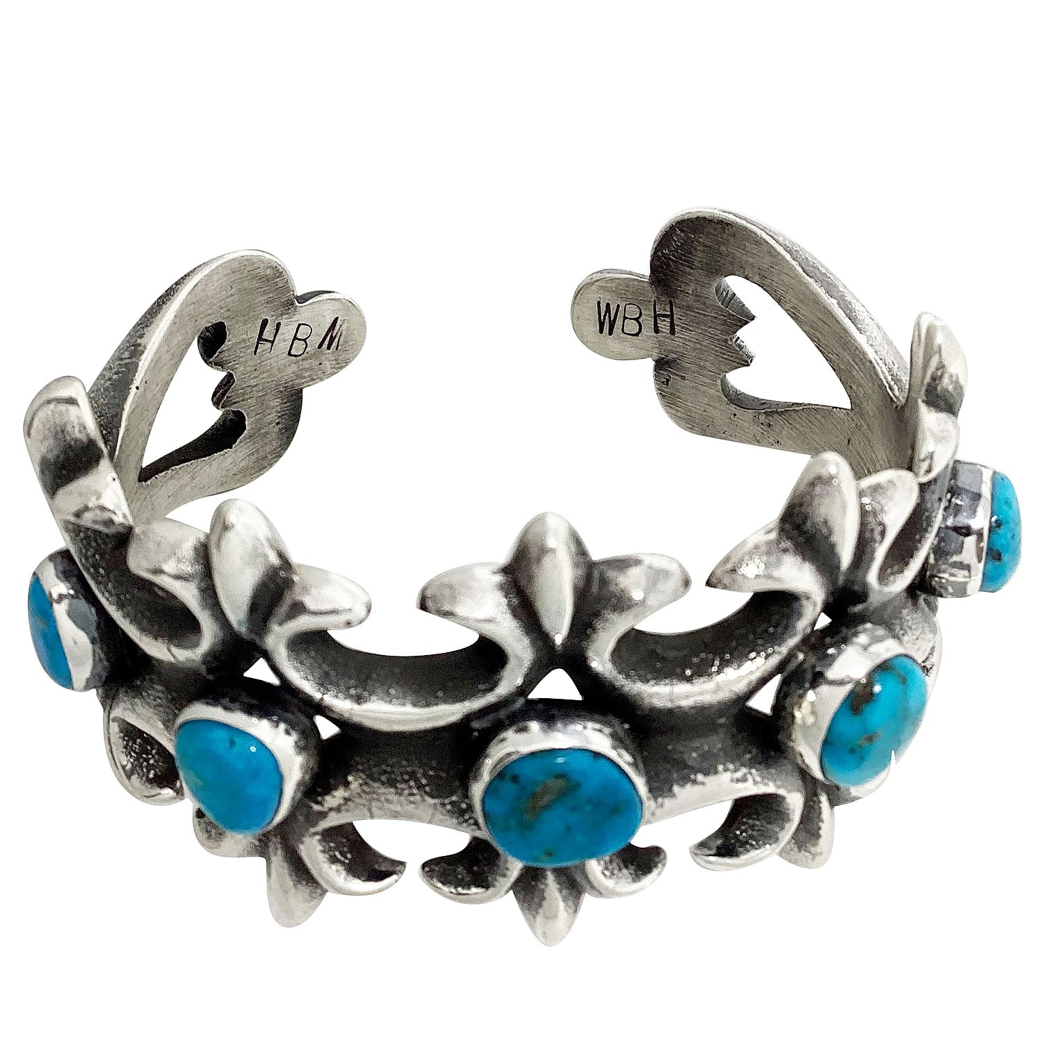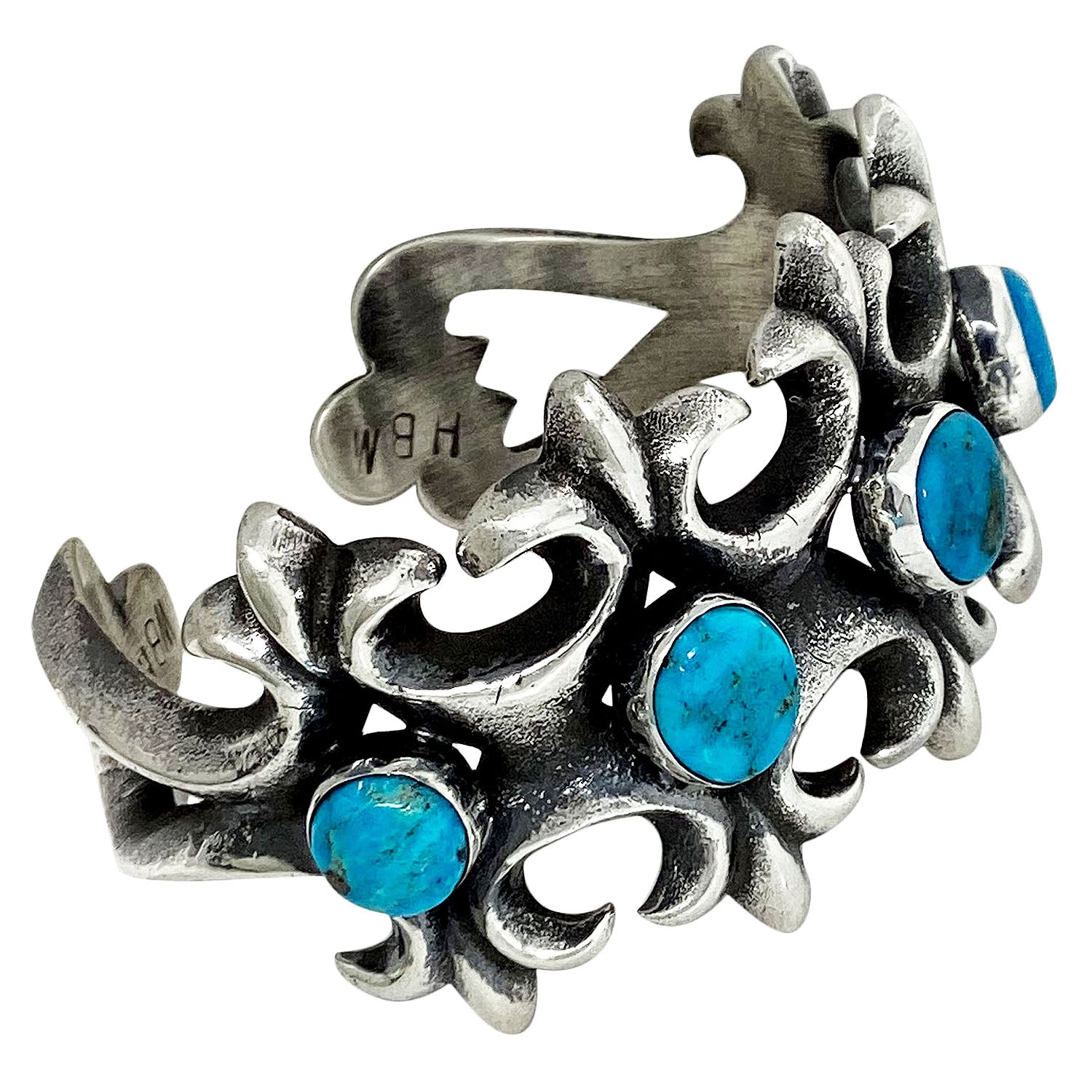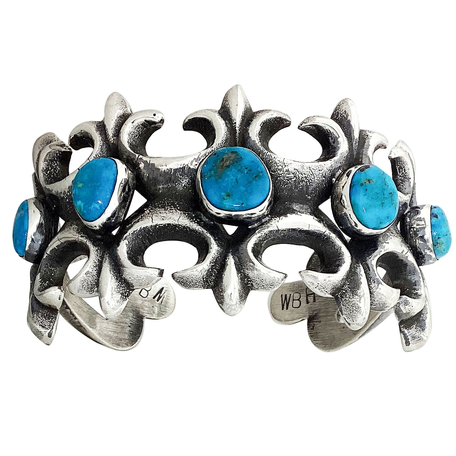Navajo silversmith Wilford Henry used a collection of templates that had been used in his family for generations for his classic sandcast patterns. You are going to love the curves of this piece. This stunning Nevada stone is the perfect compliment to traditional silver work, five cuts of Easter Blue Turquoise. He uses a thick pour of silver to make the bracelet, something that is going to feel incredible on. Plus, the silver has been given an old style finish that gives you a wonderful rustic Southwest look. Check out all of our sandcast pieces by Wilford, a true Navajo style.