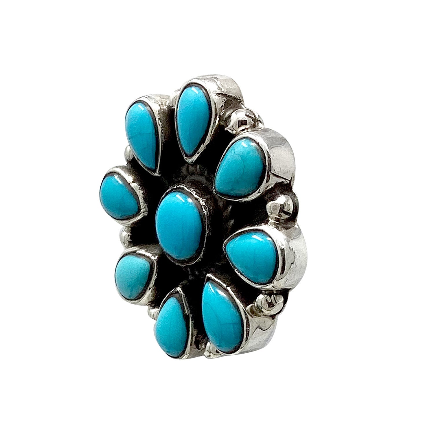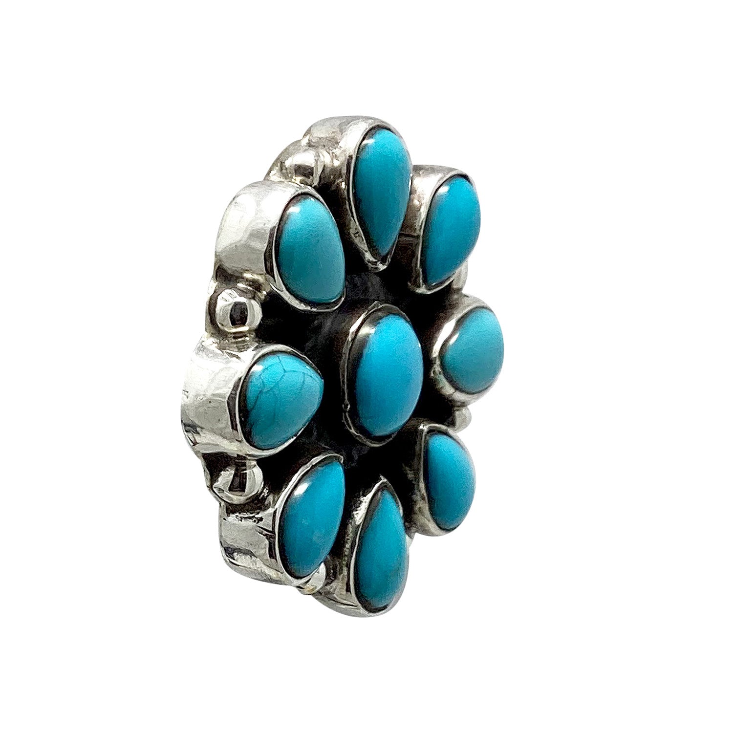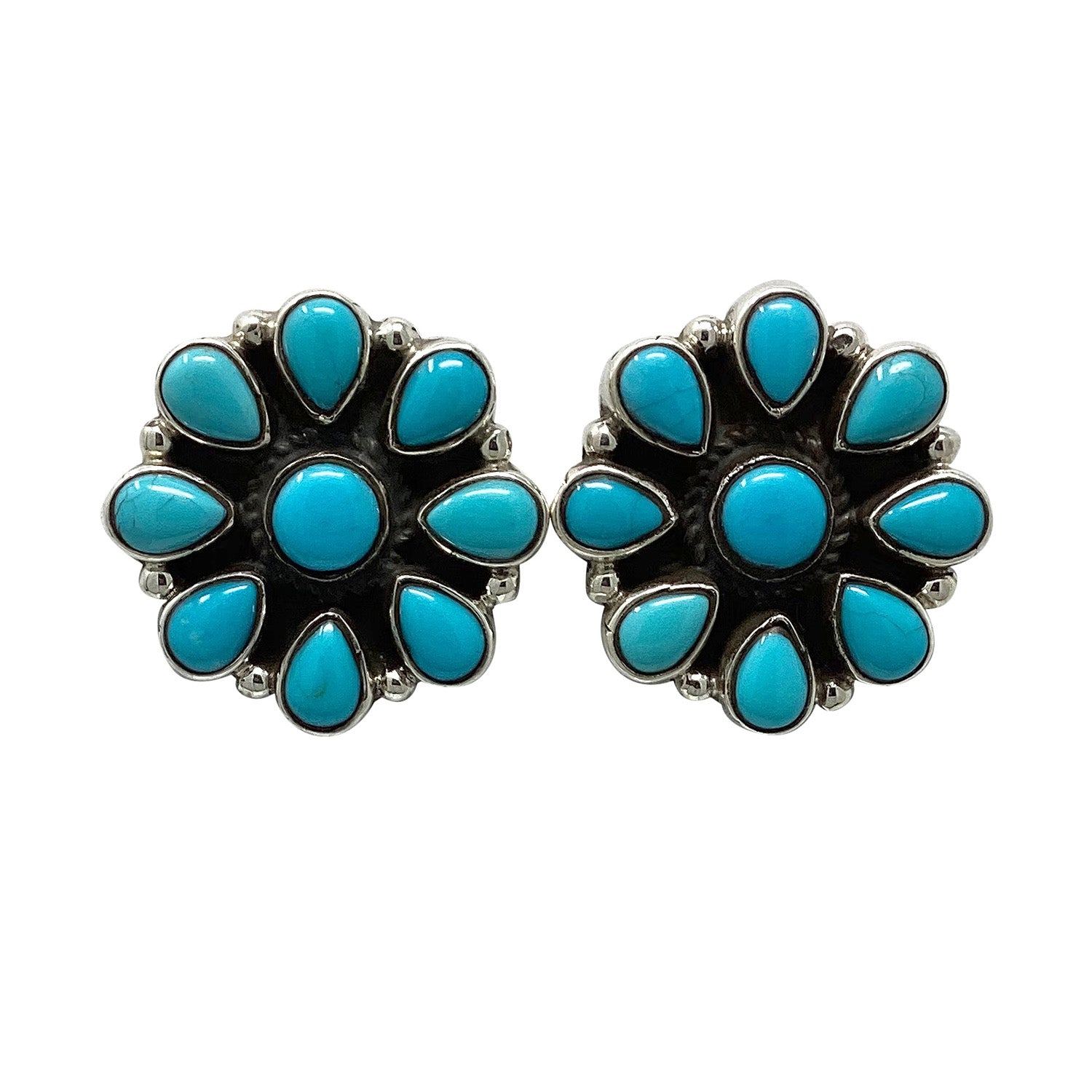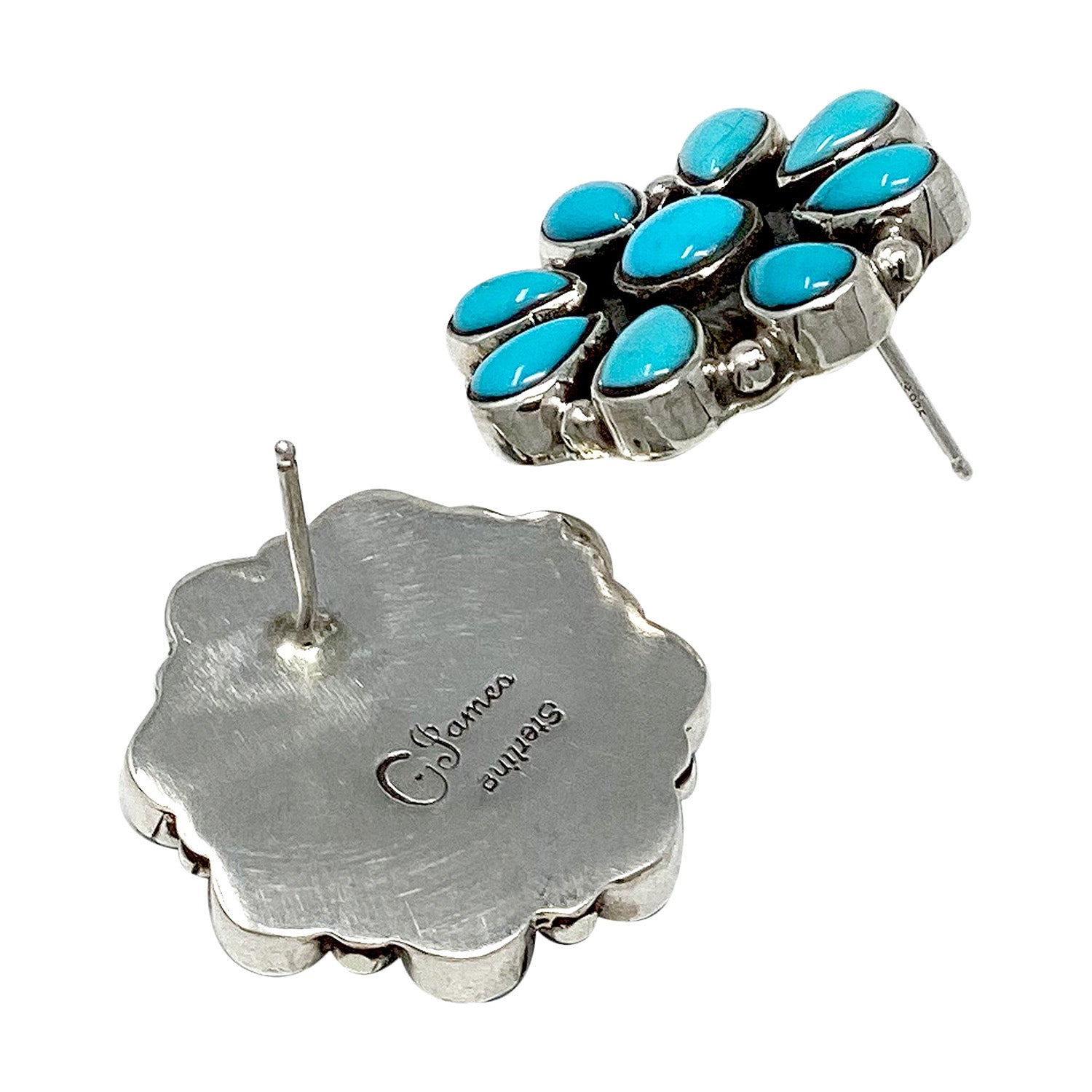 This cluster earring is a beautiful handmade creation that gives you a very unique Southwest look. You can wear the piece and know that everyone who sees it will know that it is a Native American creation. Navajo silversmith Geraldine James made the unique cluster earring by adding an oxidized background. The clusters are made from a collection of stunning blue Sonoran Rose Turquoise. A mirror shine along with twisted wire and silver drops give it that amazing finish. Check out Geraldine's other creations in the online Trading Post to match up with this gorgeous handmade creation.