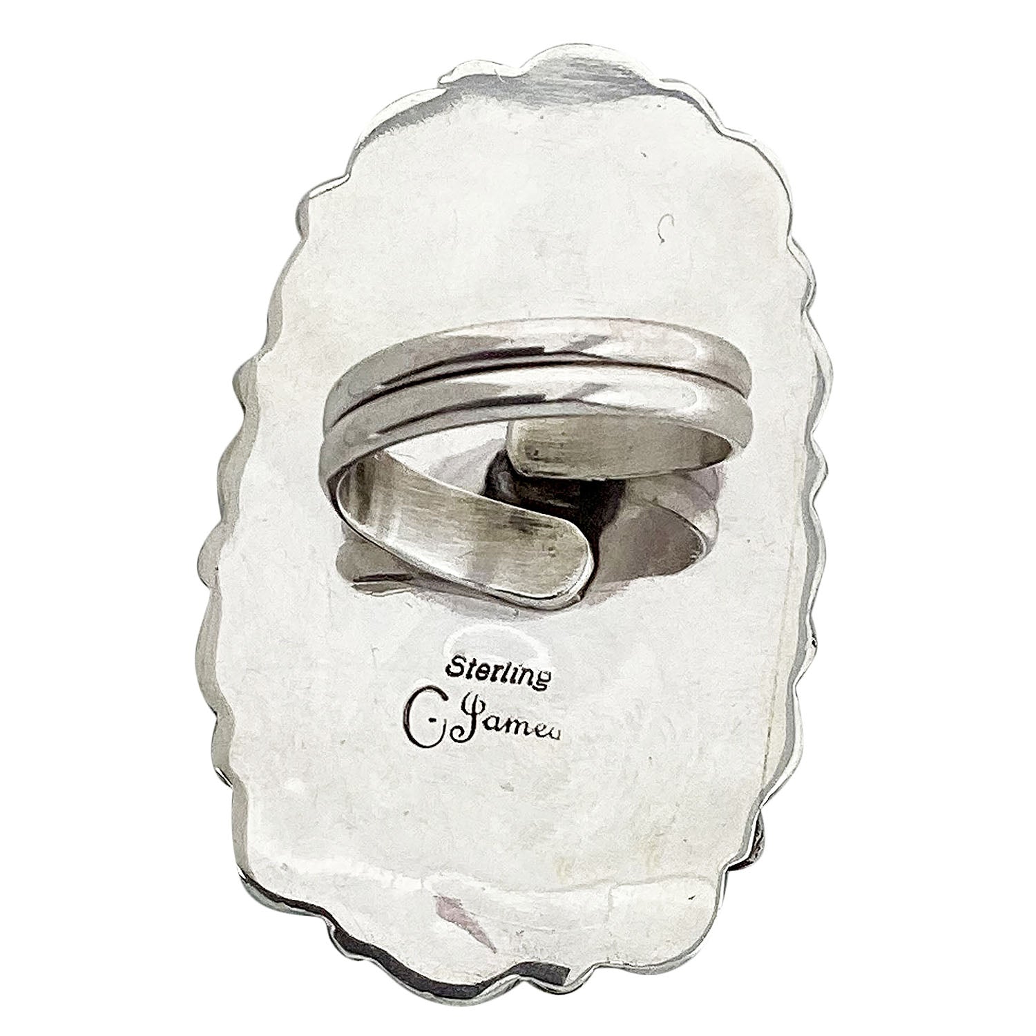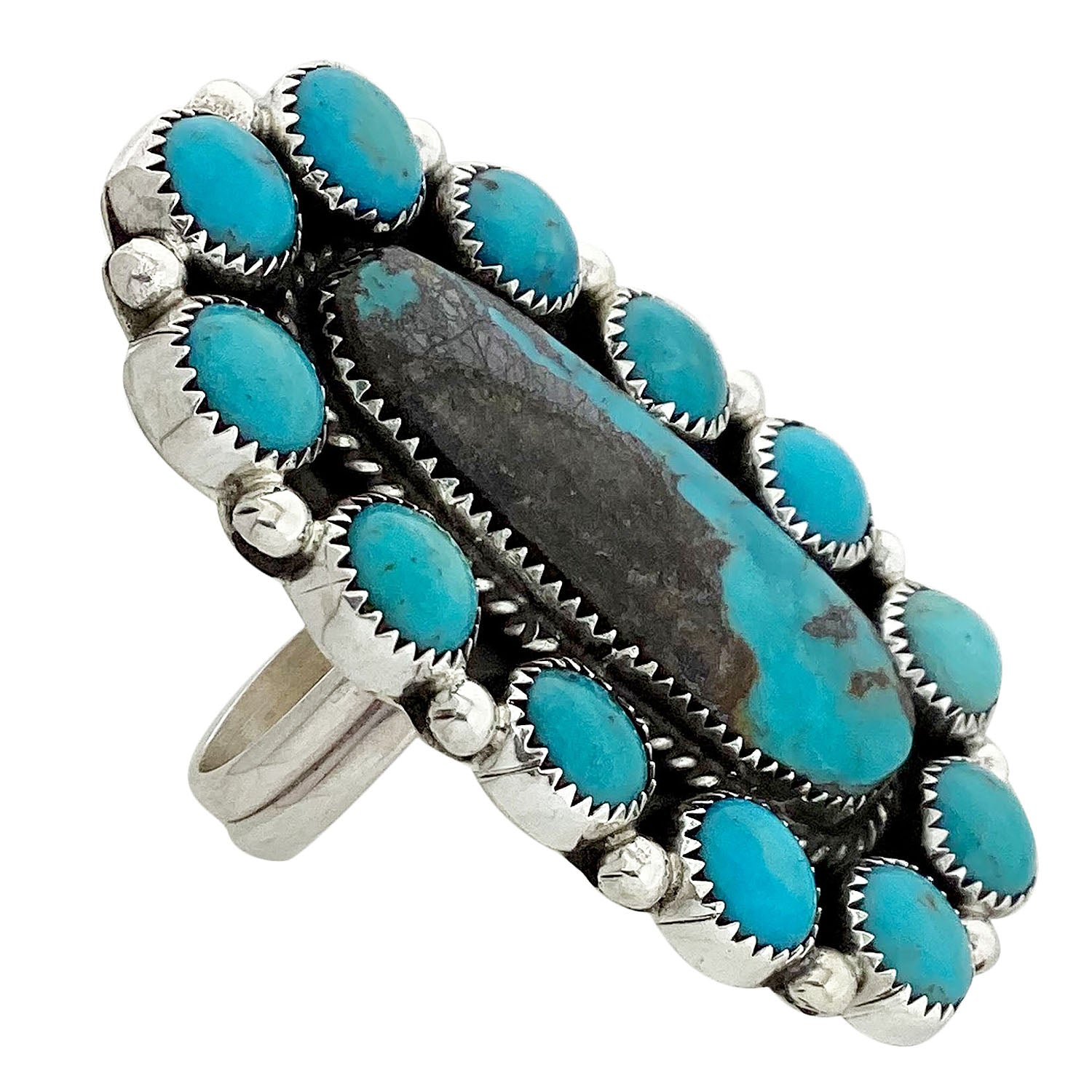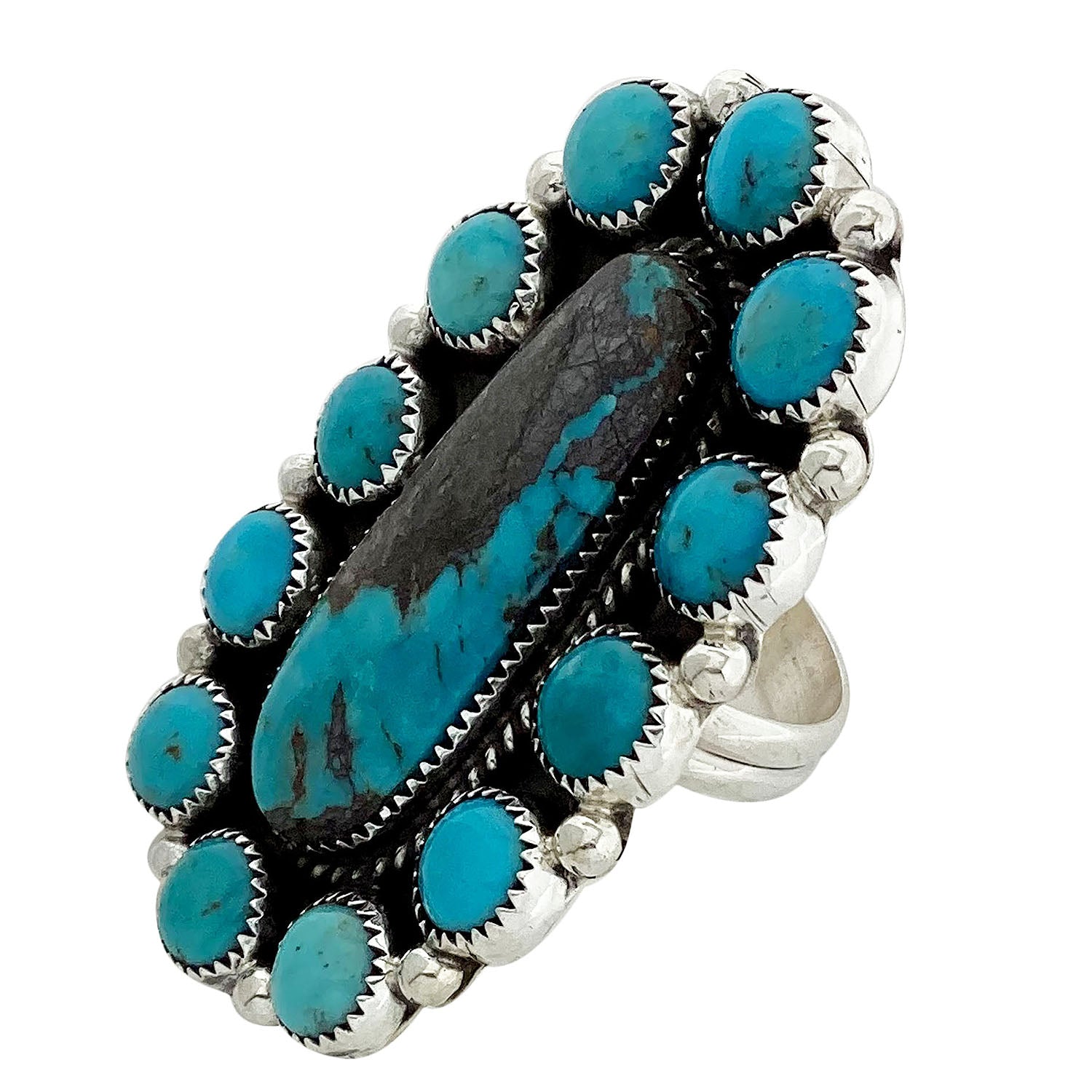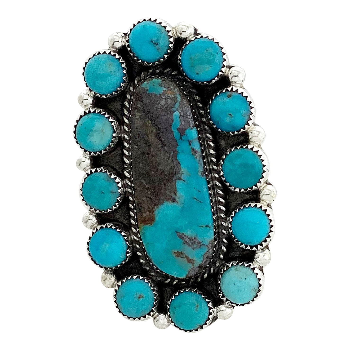 When you walk through the Trading Post you will be amazed by all of the beautiful turquoise that fills the showcases. This sacred rock has always been the favorite of the Navajo people. Its history goes back to prehistoric times when the stone was discovered in ancient mines like Cerrillos. Navajo silversmith Geraldine James has taken a collection of deep blue Kingman Turquoise stones to make the stunning cluster ring. Twisted wire, silver drops, and a mirror polish bring out the radiant beauty of the stones. A comfortable adjustable ring shank finishes the handmade creation.