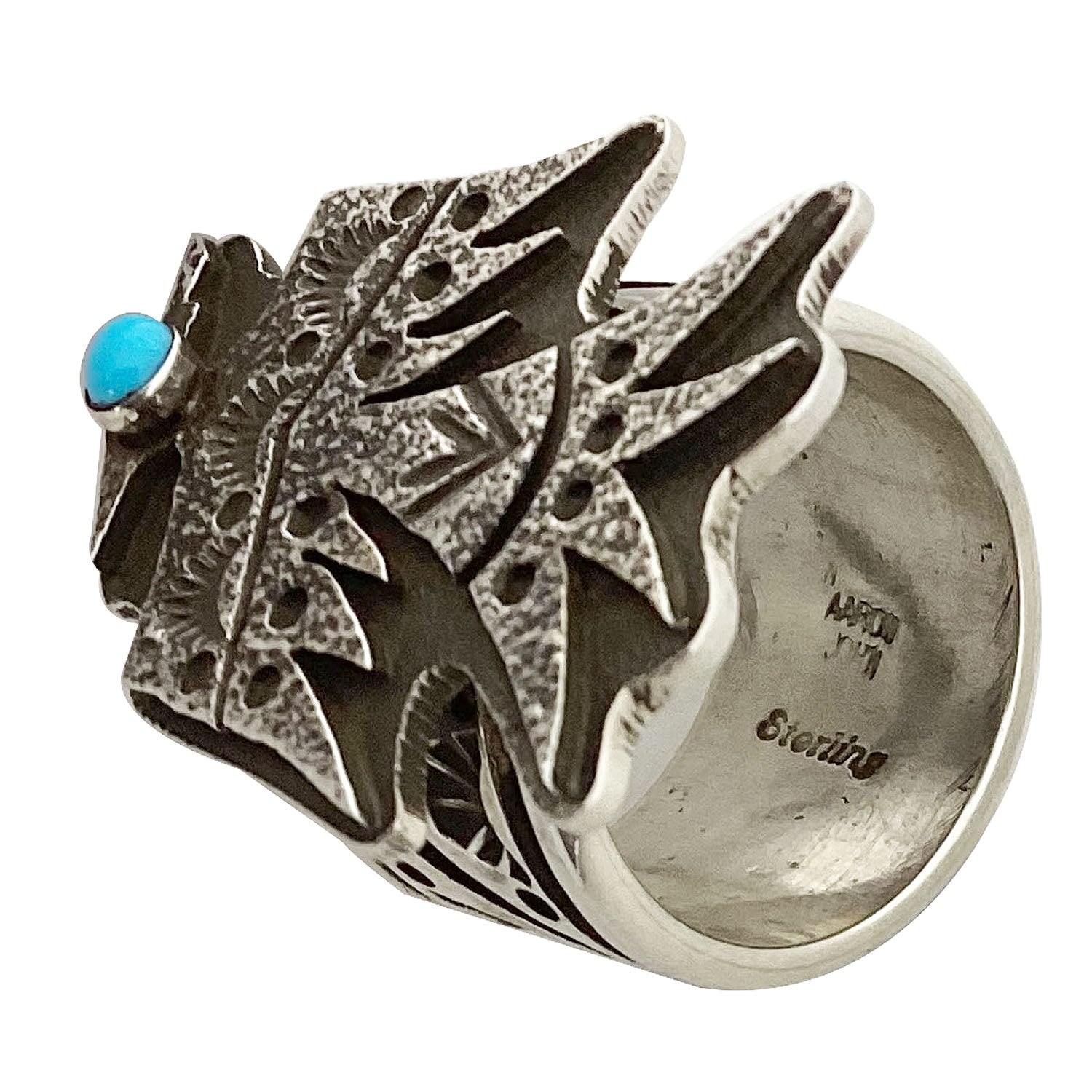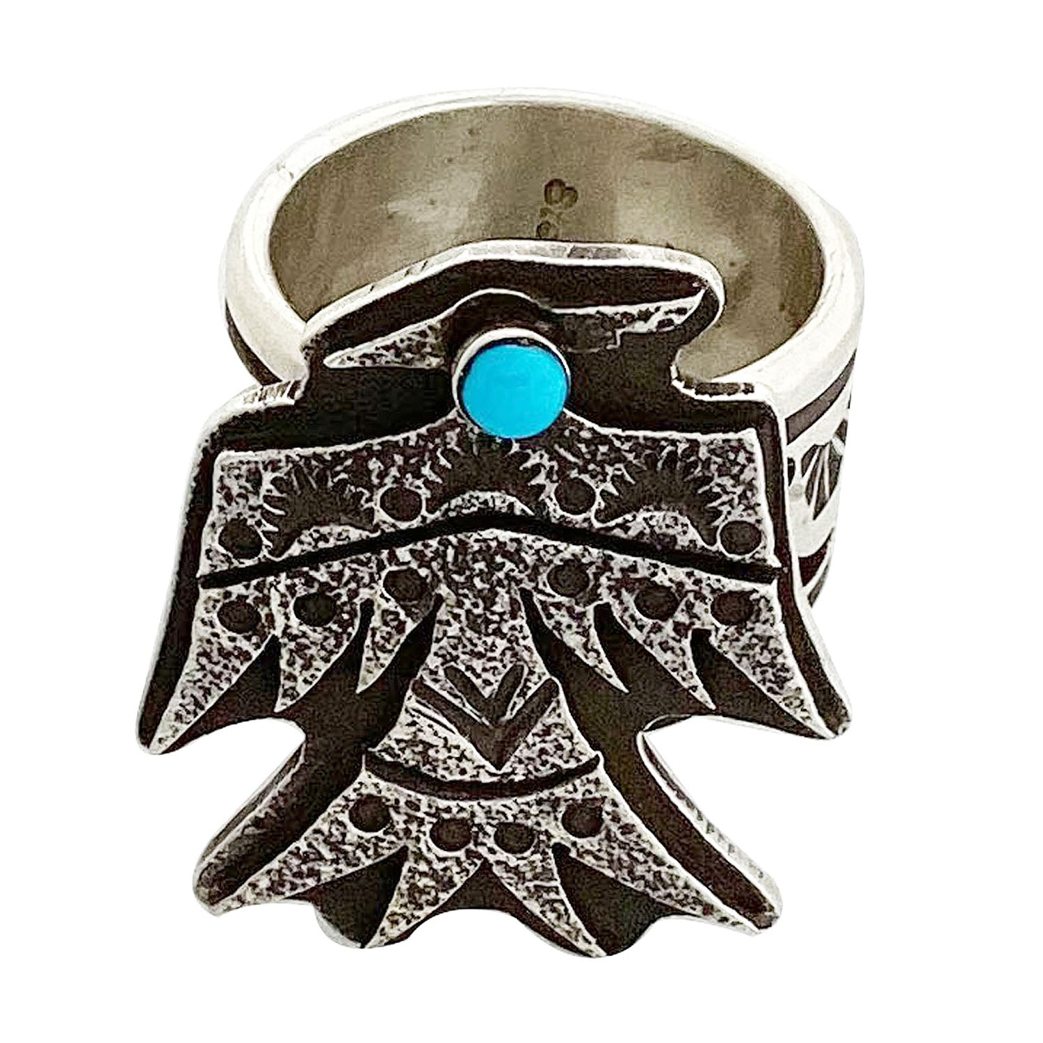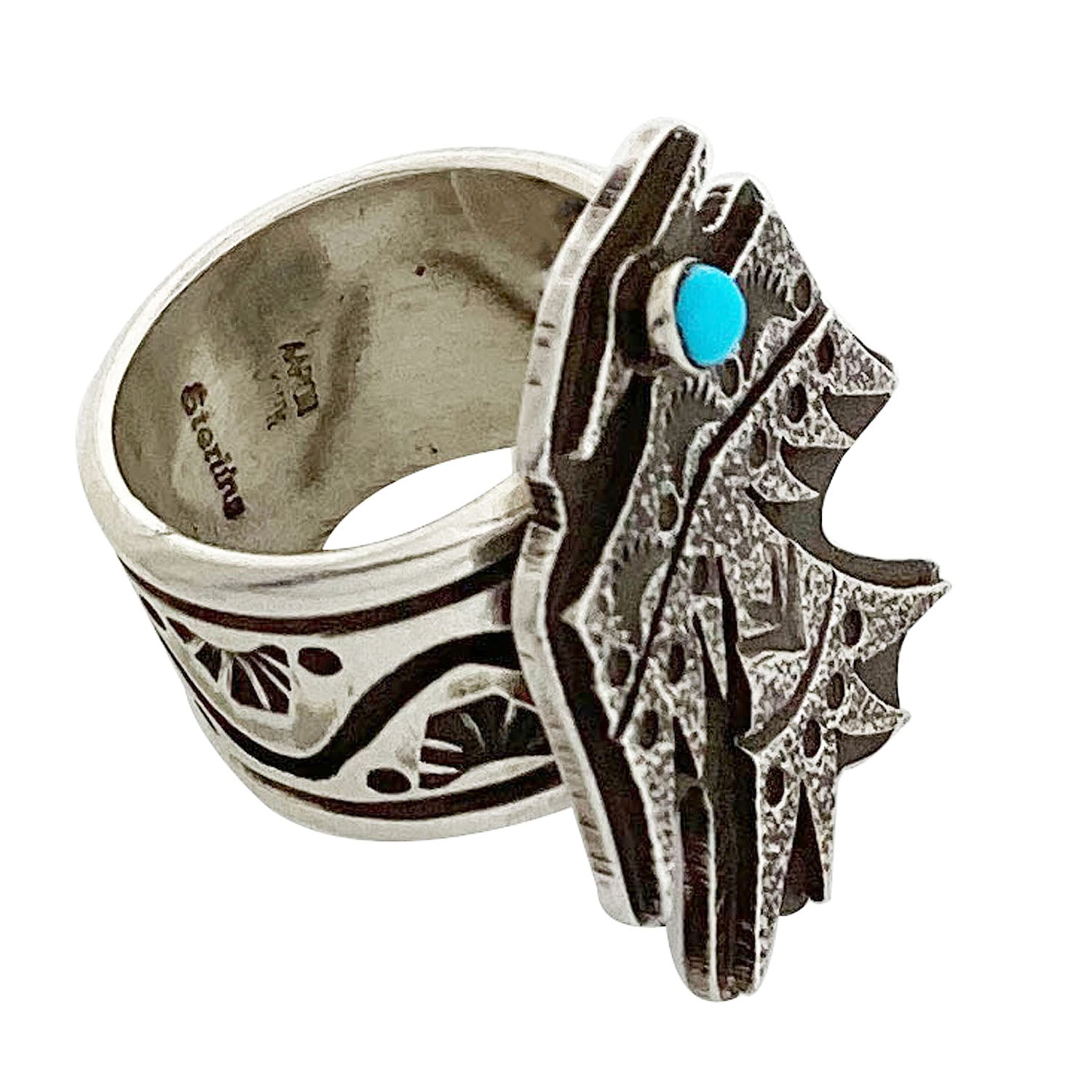 The Thunderbird is protector. This majestic spirit represents power and strength and is an important part of the Zuni culture. That means all of us in Gallup are very familiar with this symbol that can switch into human form. Navajo artist Aaron John beautifully constructs the Thunderbird using two layers of thick sterling silver. He proceeds to decorate the spirit with traditional stamp work and sky-blue turquoise. Aaron uses a comfortable stamped ring band to finish the piece. You are going to be impressed with this piece and feel the power of the Thunderbird every time you put it on.
