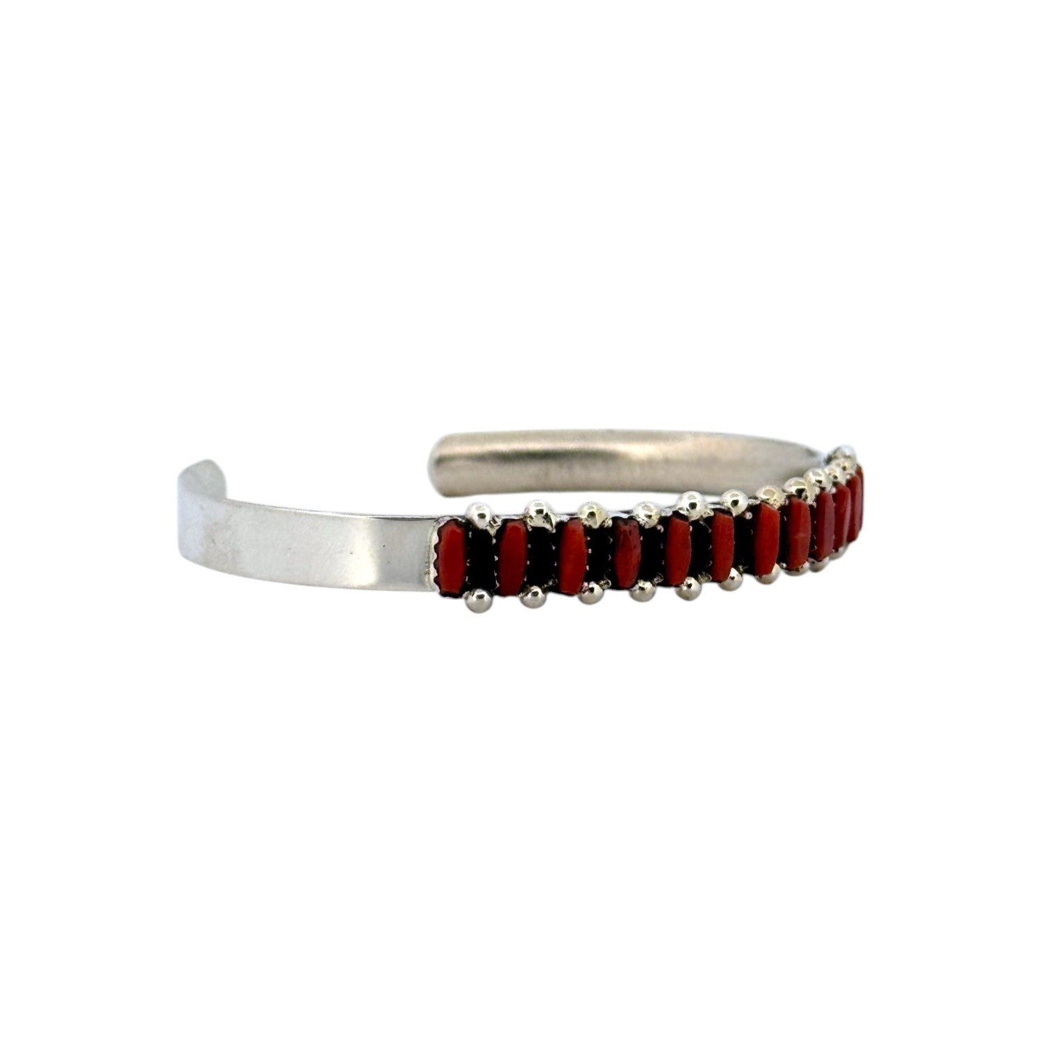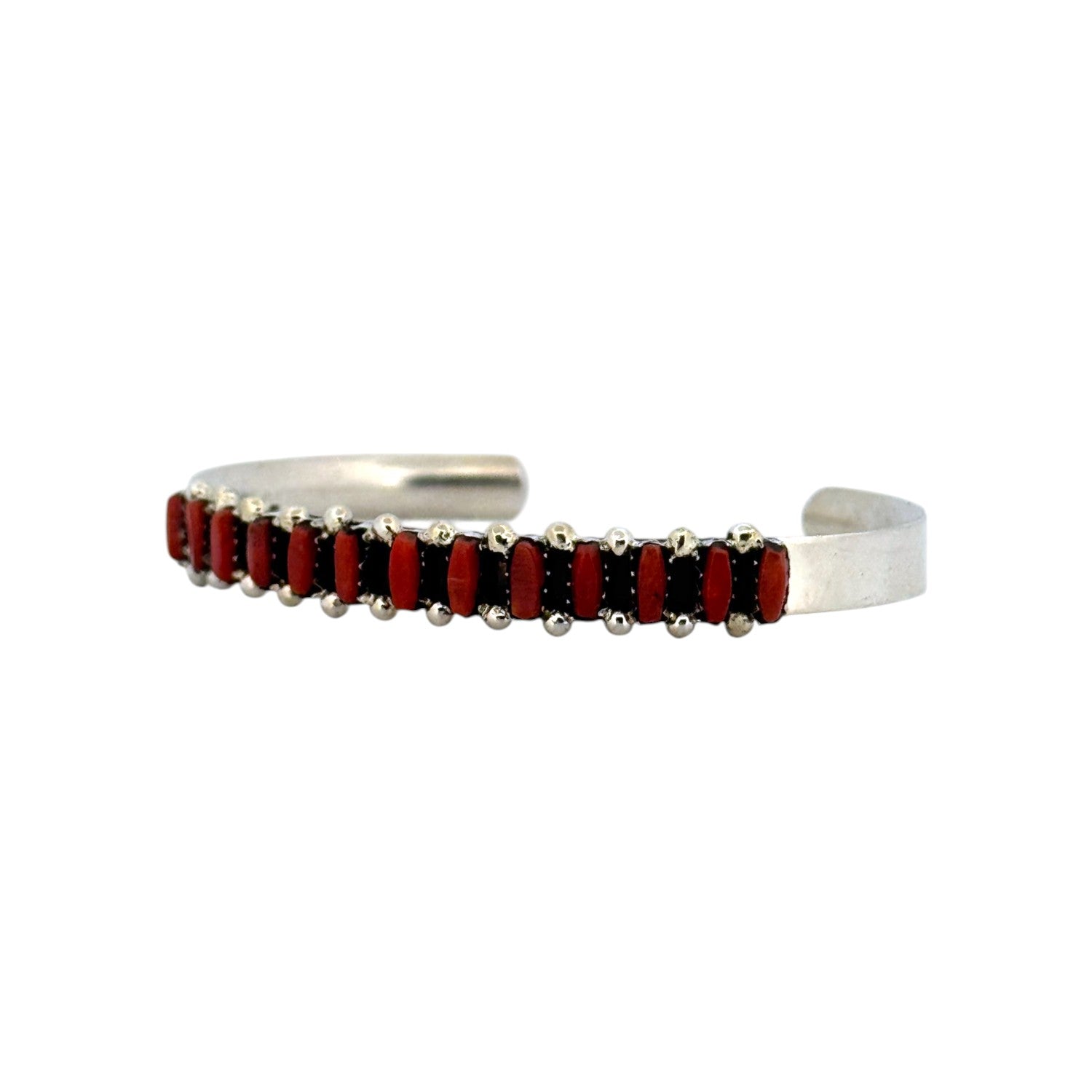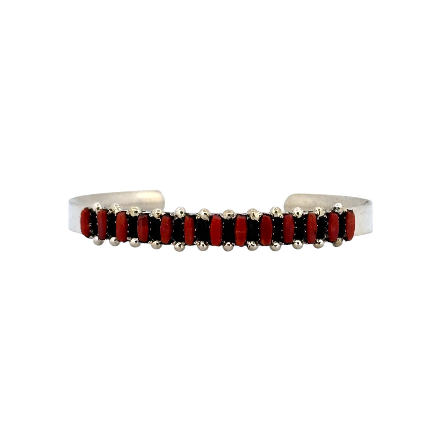 This elegant bracelet by Zuni artist Veronica Marza highlights the timeless beauty of coral set in sterling silver. The piece features a traditional row design, with slender coral stones precisely hand-cut and set in delicate bezels. Each stone is framed by silver bead accents, adding texture and dimension to the clean linear layout. The rich red hue of the coral contrasts beautifully with the polished silver, creating a bold yet refined look. Marza’s craftsmanship reflects the precision and artistry that Zuni jewelry is celebrated for, where every detail is carefully considered. Lightweight and versatile, this bracelet is perfect for everyday wear or as a striking accent piece. It embodies both tradition and elegance, making it a cherished addition to any Native art collection.