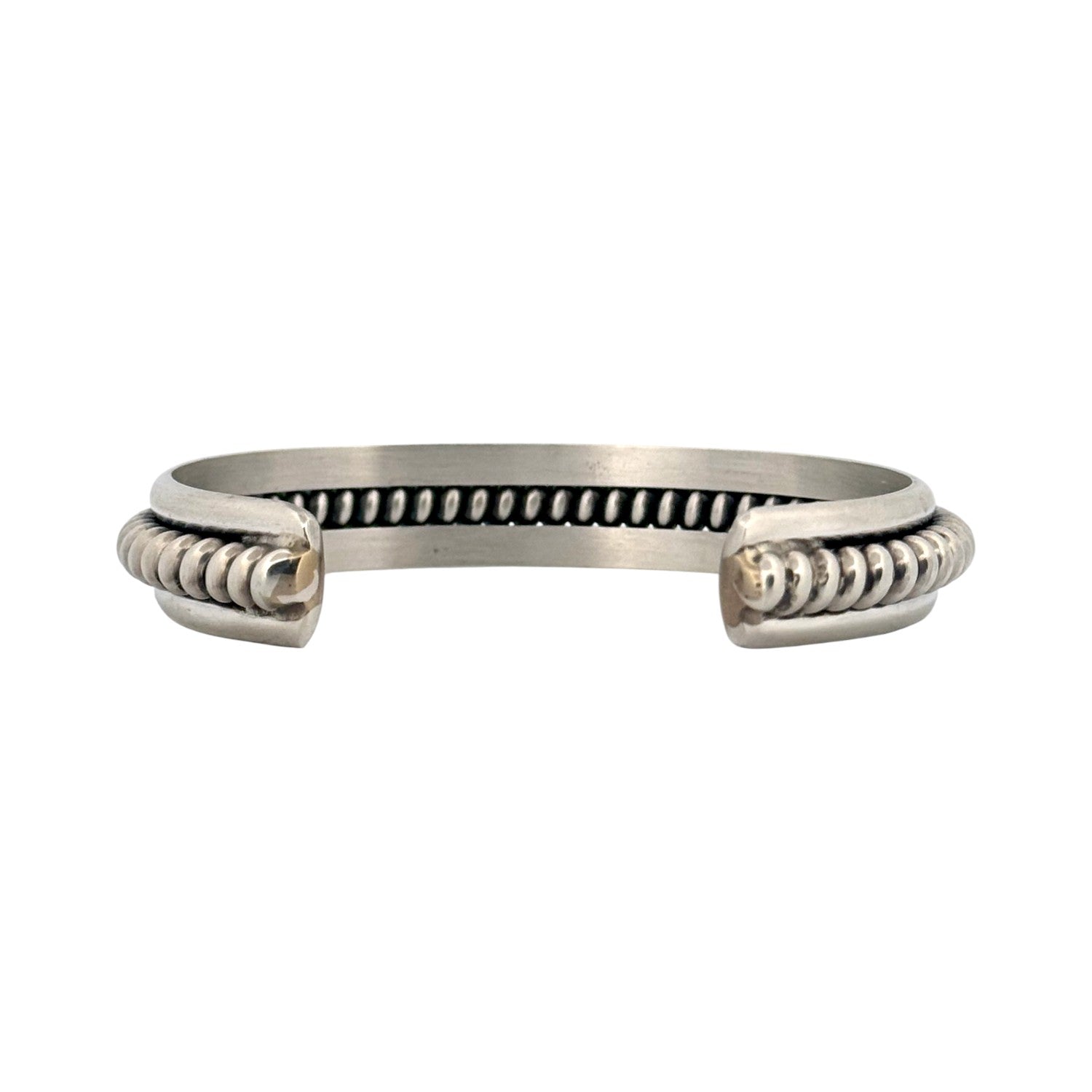 This elegant Navajo handmade bracelet showcases the refined craftsmanship and timeless artistry of traditional Navajo silversmithing. Meticulously forged from solid sterling silver, the cuff features a coiled rope design bordered by smooth, polished silver edges, creating a perfect balance of texture and shine. The clean lines and subtle detailing give this piece a modern sophistication while maintaining its deep cultural roots. Its medium weight and smooth interior make it comfortable for daily wear, while the polished finish adds a touch of understated luxury.