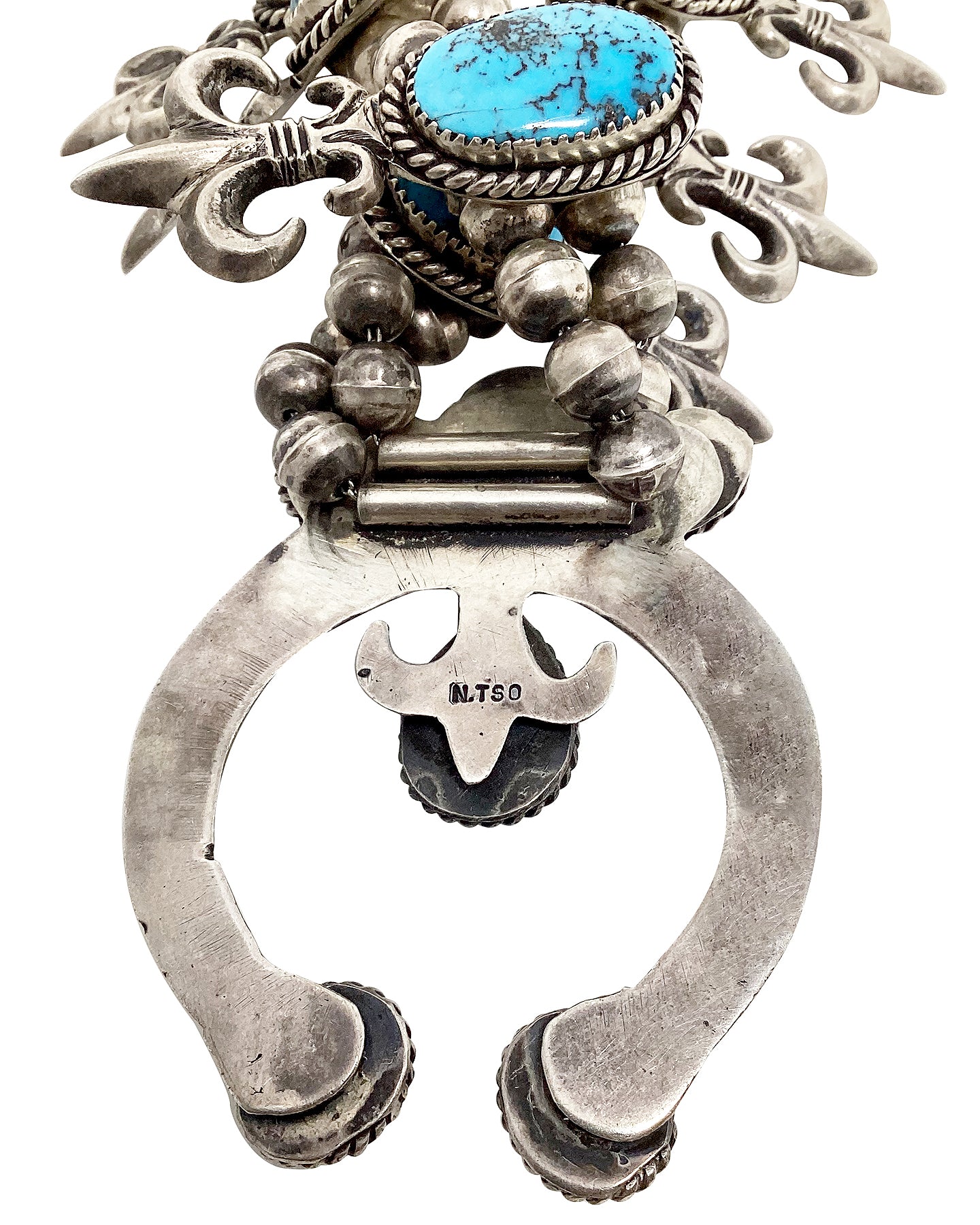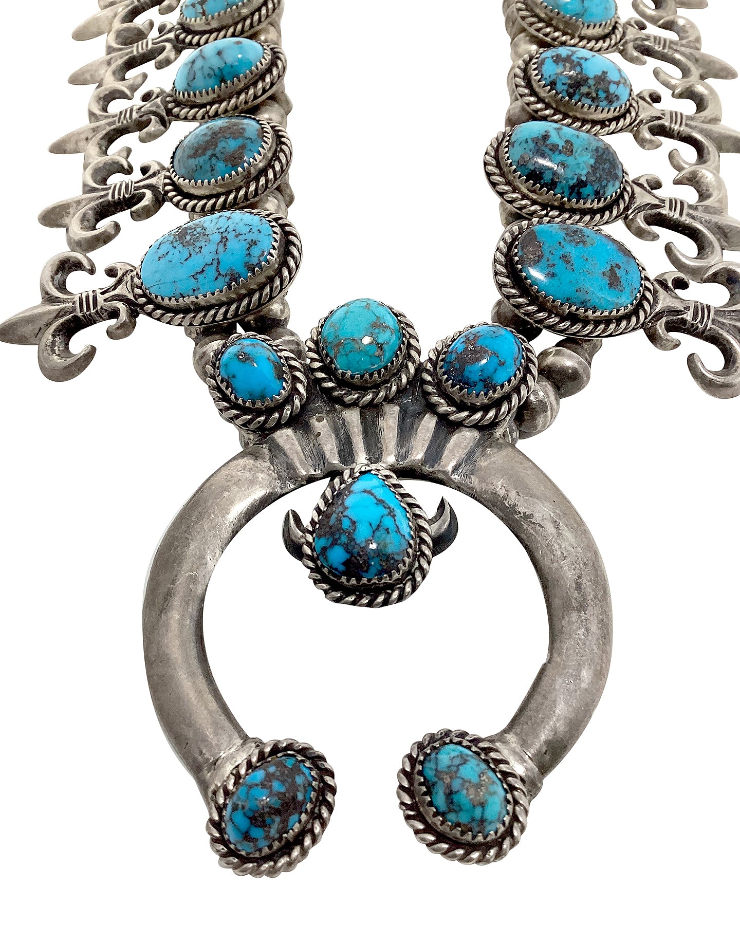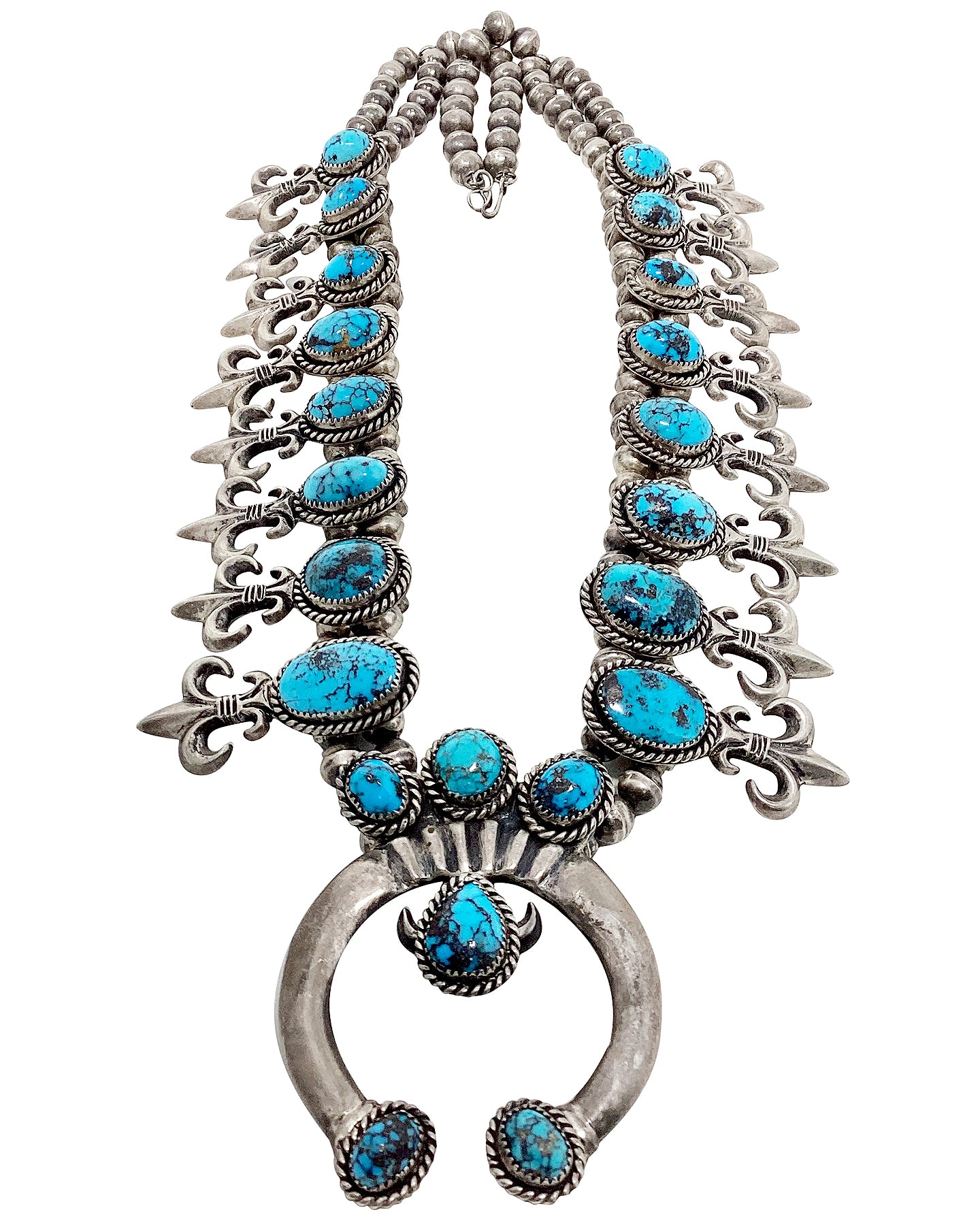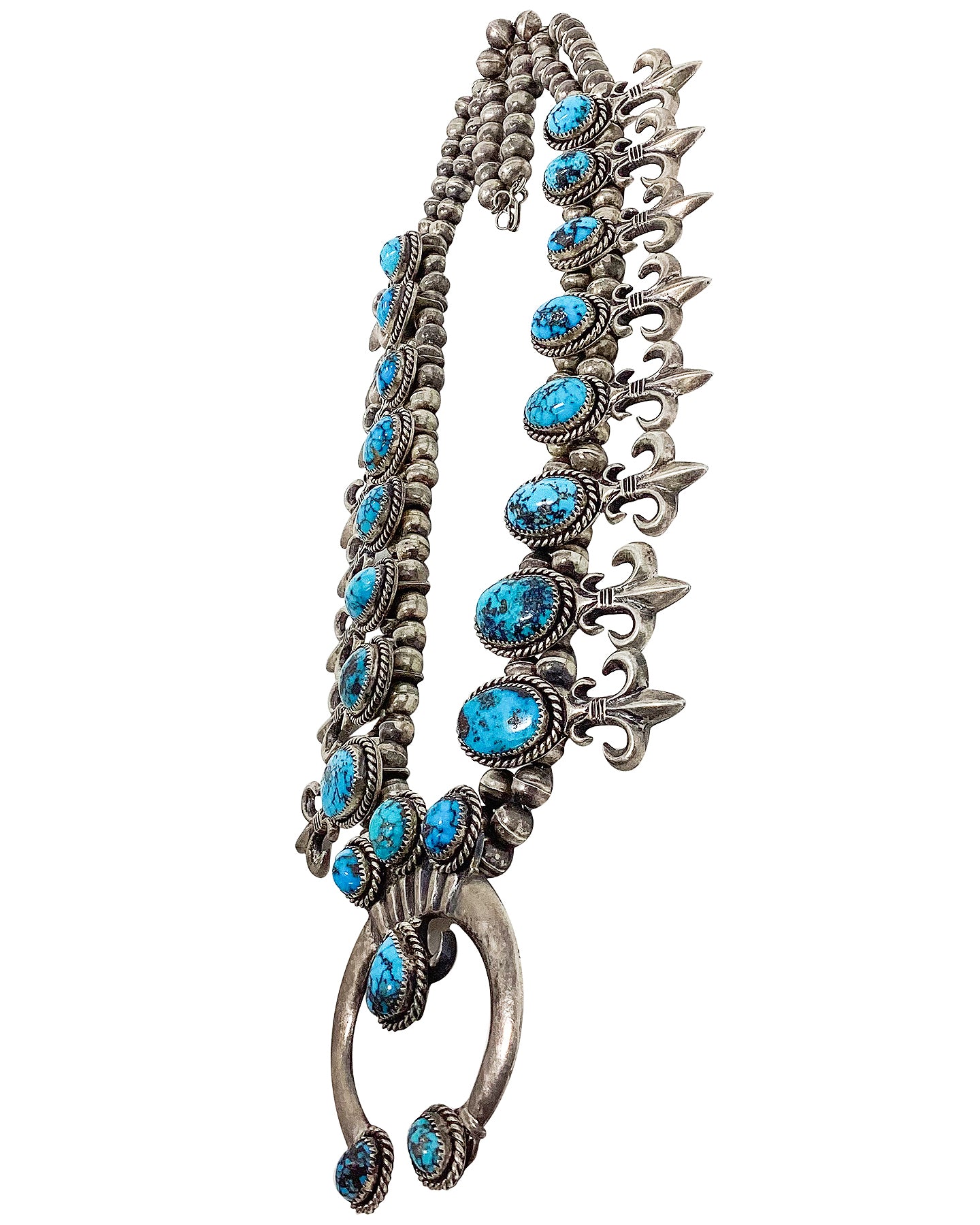 Navajo Handmade Squash Blossom, Persian Turquoise, Circa 1970s, N. TSO, 30"