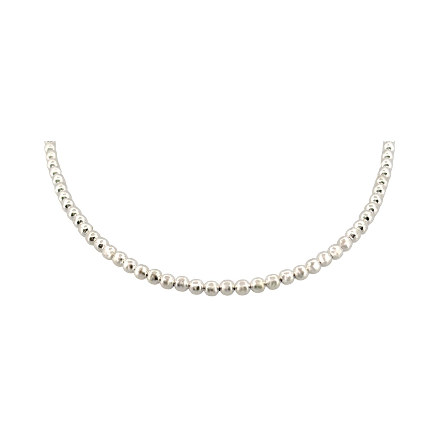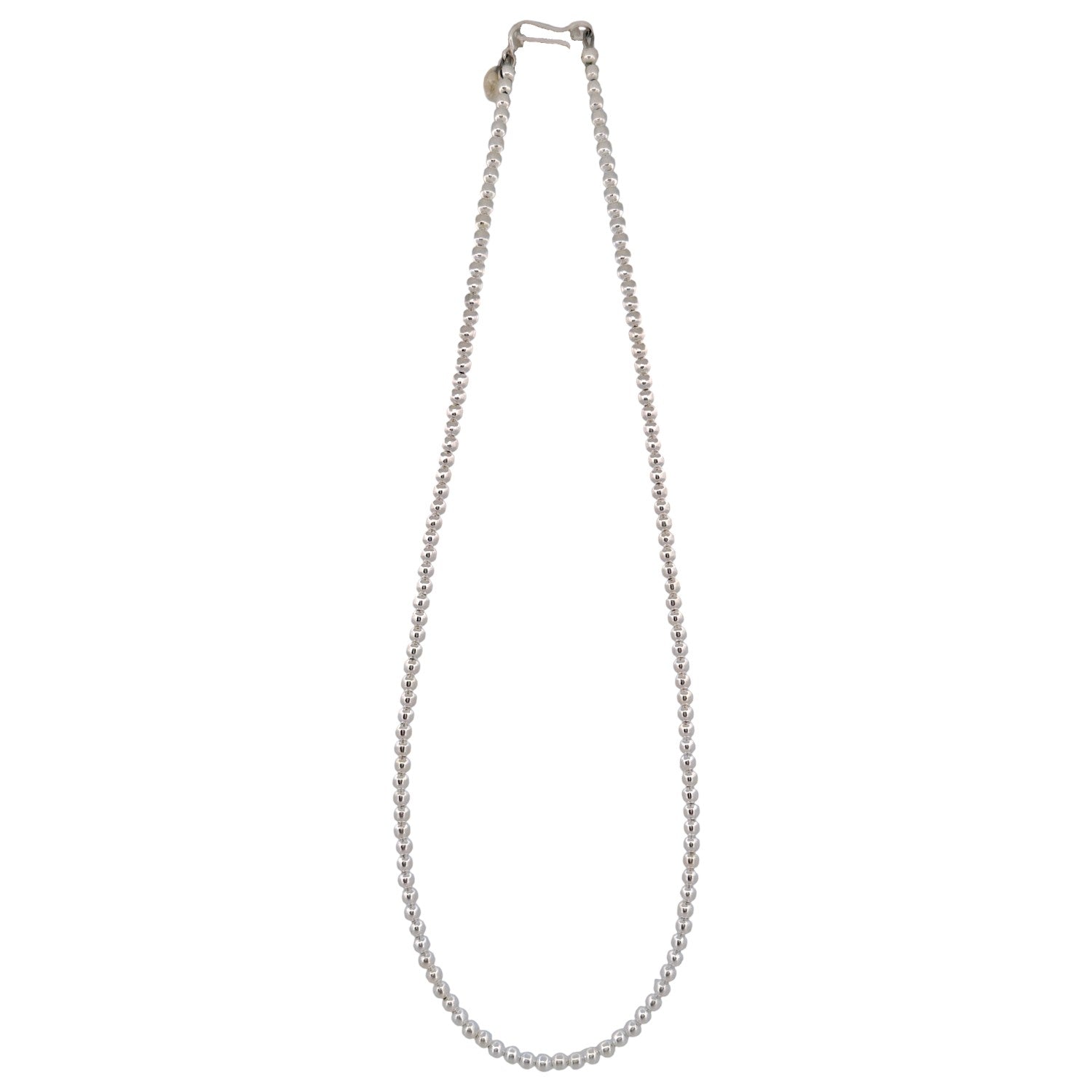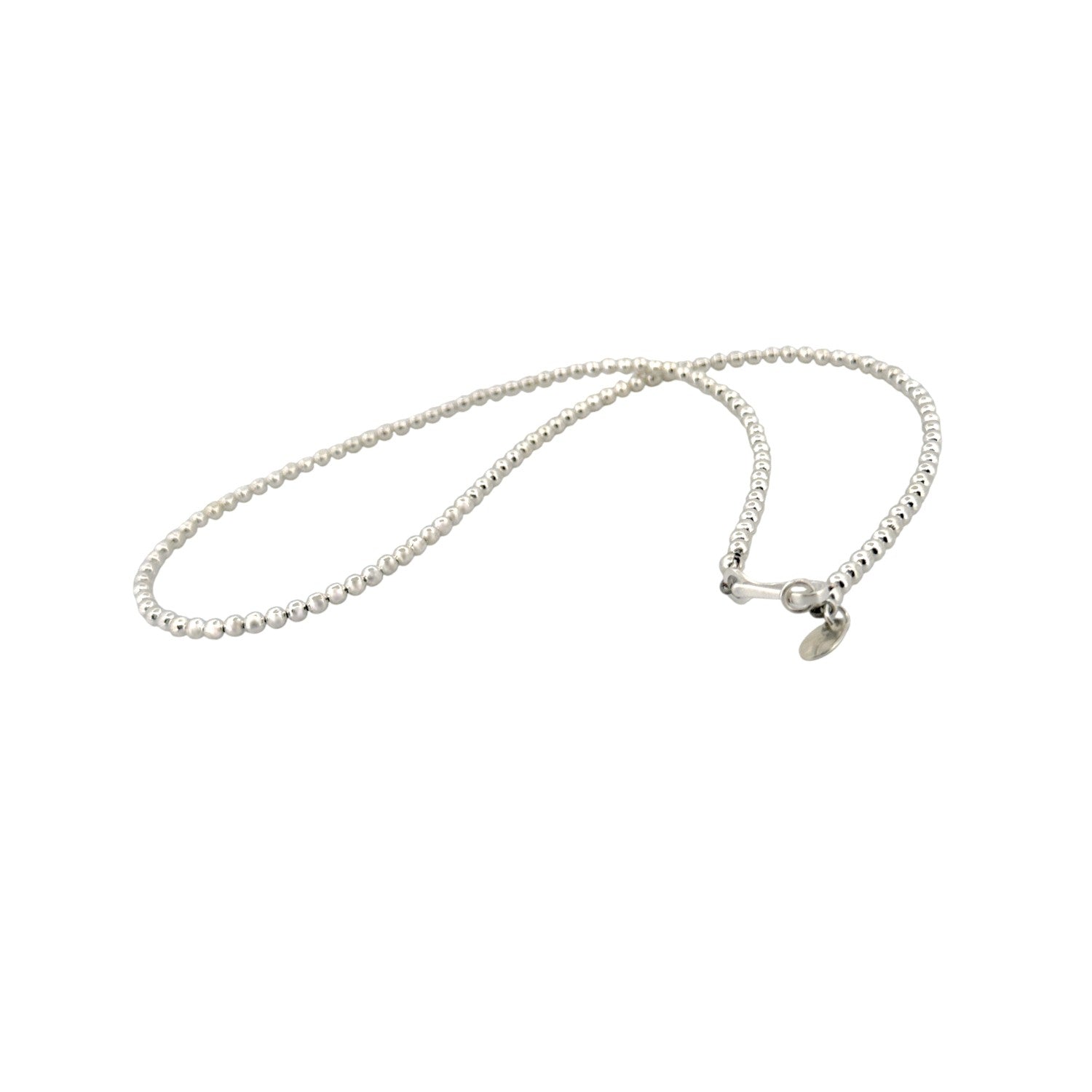 This delicate necklace features 2mm machine-made sterling silver pearls, offering a subtle and refined shimmer. Each bead is carefully hand-strung by a local Native artisan, showcasing exceptional attention to detail and craftsmanship. The fine silver pearls create a lightweight, graceful design perfect for layering or everyday wear. Its polished finish adds a touch of timeless Southwestern elegance. A beautiful reflection of Native artistry and classic simplicity.
