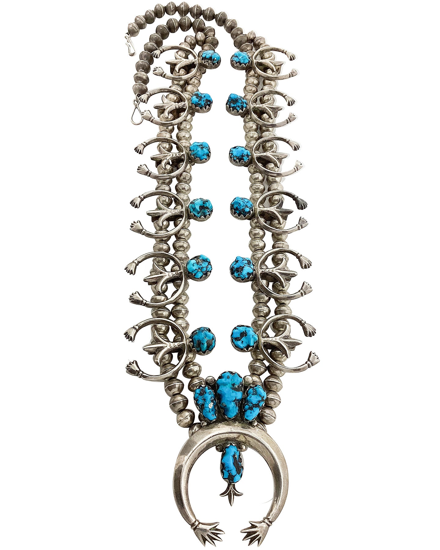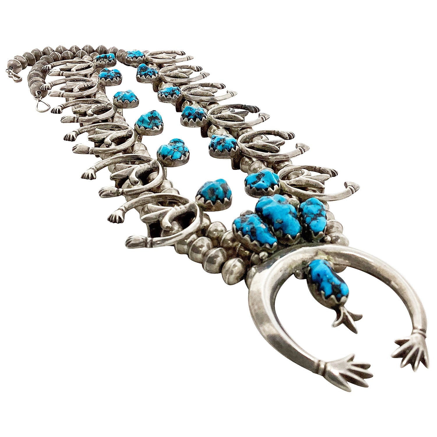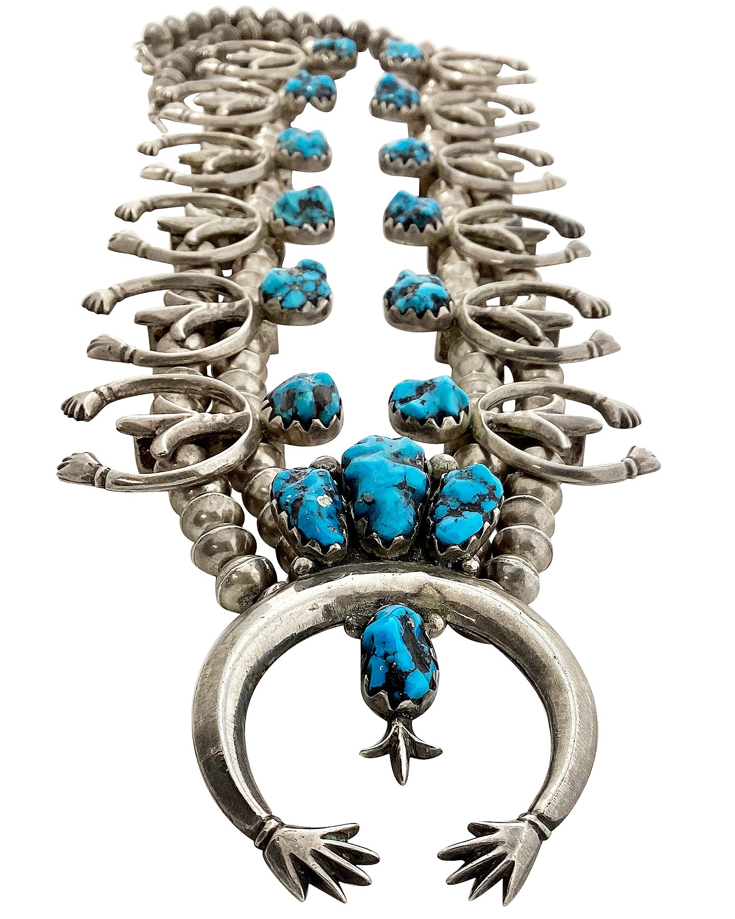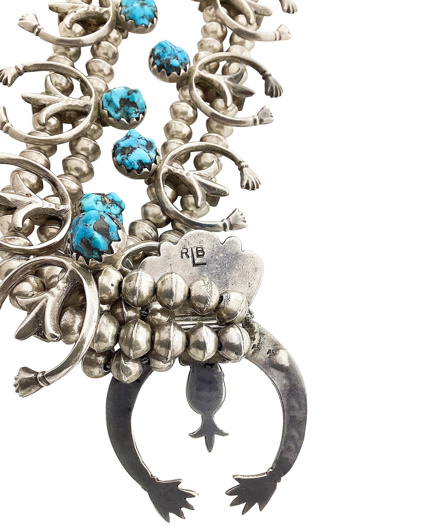 Legendary Zuni artists Robert & Bernice Leekya made traditional silver and stone for decades, lots of decades. I don't if I have seen anything like this from Robert and Bernice. They could have traded for the sandcast pieces, or they could have cast the pieces themselves. Many collectors just know when they are looking at a Leekya piece. Most of them are done with these great Kingman nuggets. The Arizona rock has a spectacular deep blue color that hosts lots of webbing and iron pyrite matrix. Around the stones you will find silver drops and cut bezel. They have displayed all of the cast pieces and vibrant blue turquoise on handmade silver beads. If you want that great Native American look this collectible necklace would be the perfect piece.