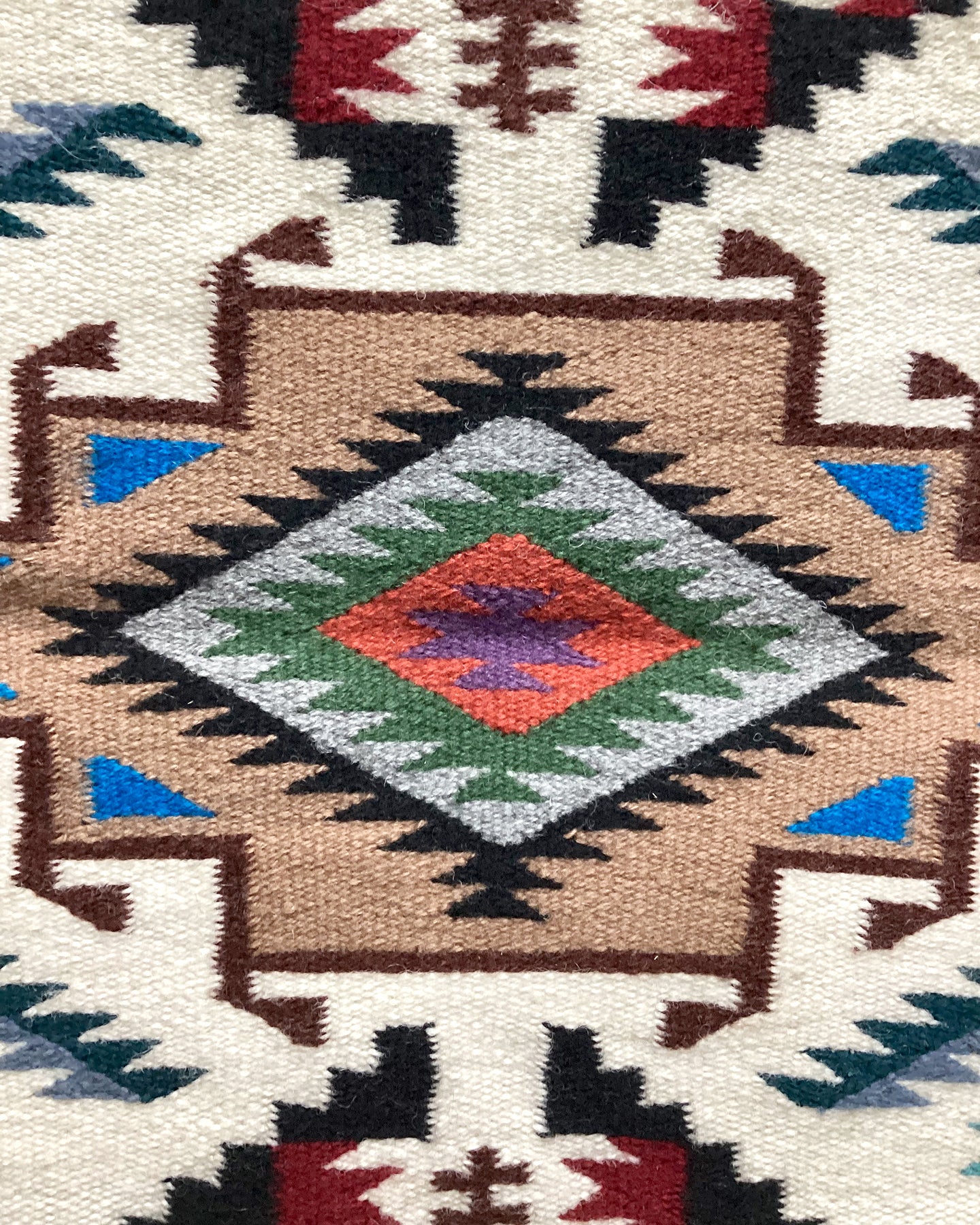 One of the most intriguing Navajo styles is the Teec Nos Pos weaving. This remote outpost in the Four Corners area is known for its unique style of rug. Usually with wide borders that are filled with bold designs. The centers of the rug can be very similar to dazzlers with lots of repeated patterns and many different colors. We only get a few of these beauties, but they are definitely a weaving we all love to see come through the Trading Post's doors.