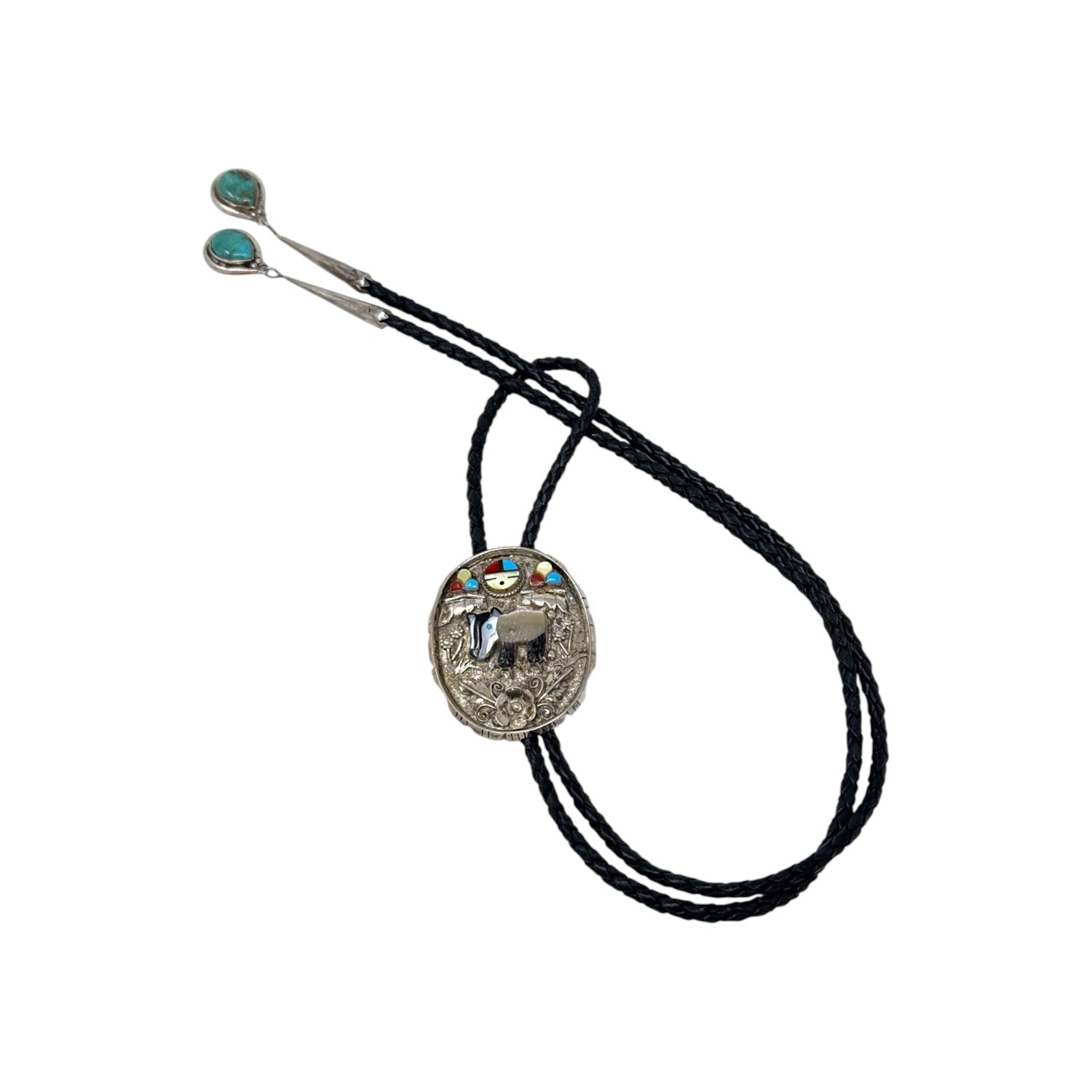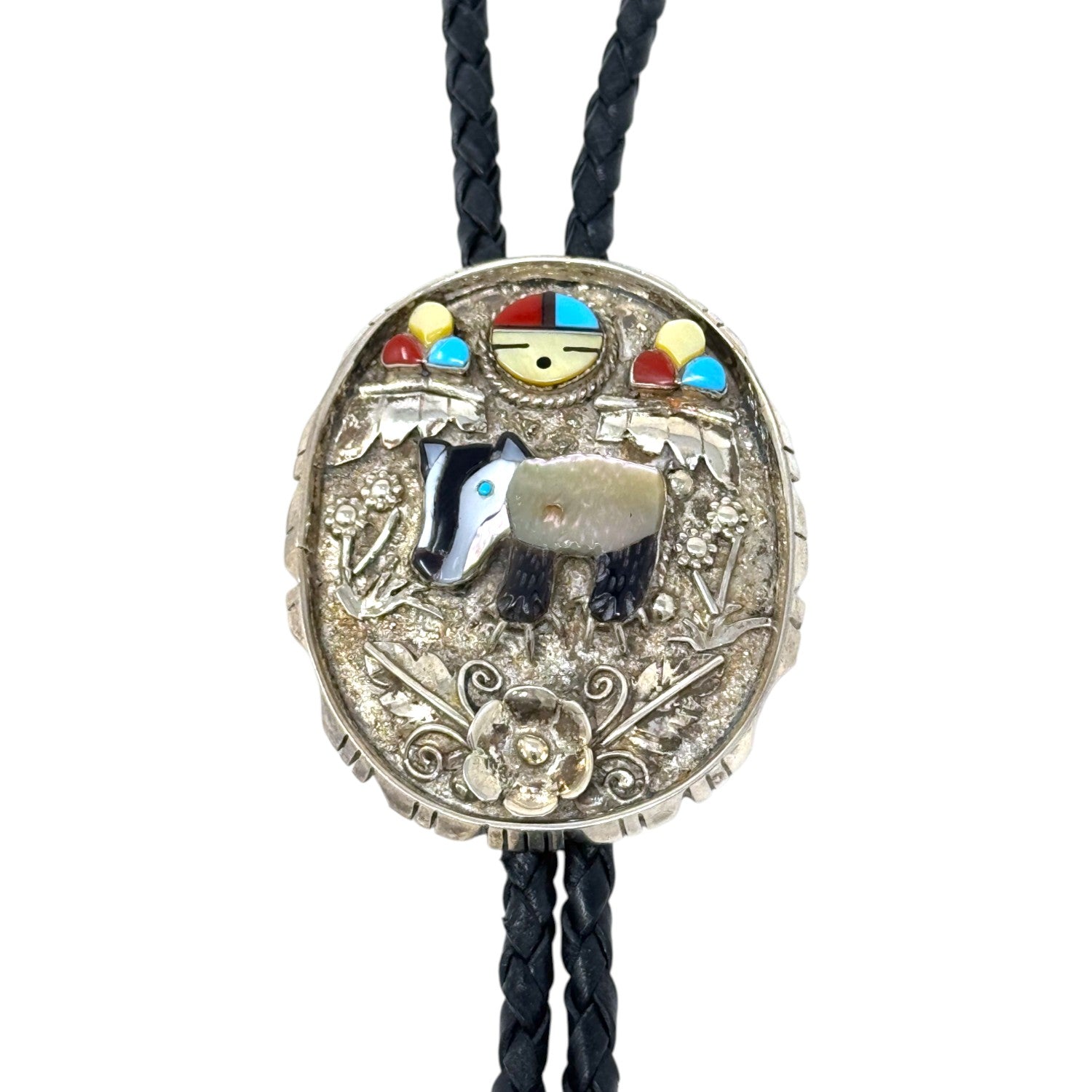 This striking bolo tie by Zuni artist Kendall Shebola showcases a powerful blend of tradition and artistry. Crafted in sterling silver, the piece features a detailed inlay of a badger, skillfully formed from a rich combination of shell, turquoise, jet, and other natural stones. Above the badger rests a vibrant Sunface symbol, a sacred emblem of harmony and balance in Zuni culture. The textured silver backdrop is adorned with hand-stamped floral and leaf motifs, adding layers of depth and symbolism to the composition. The three-dimensional elements are framed within a scalloped bezel, enhancing the visual impact of the centerpiece. With its black braided leather cords and sterling silver tips, this bolo tie is both wearable art and a cultural tribute.